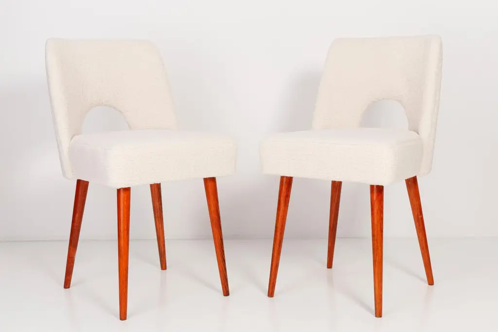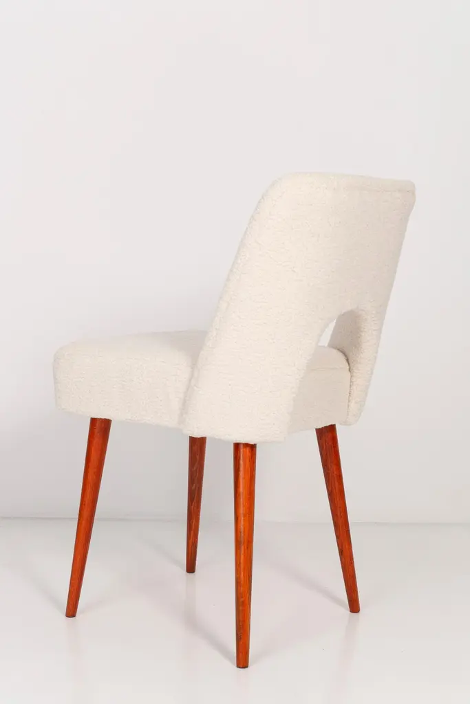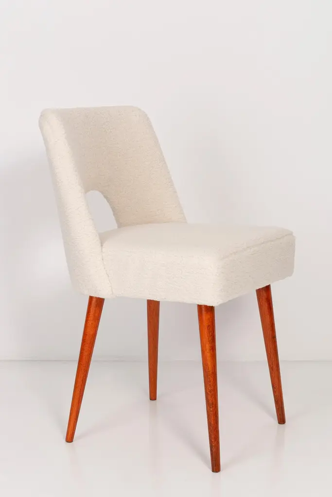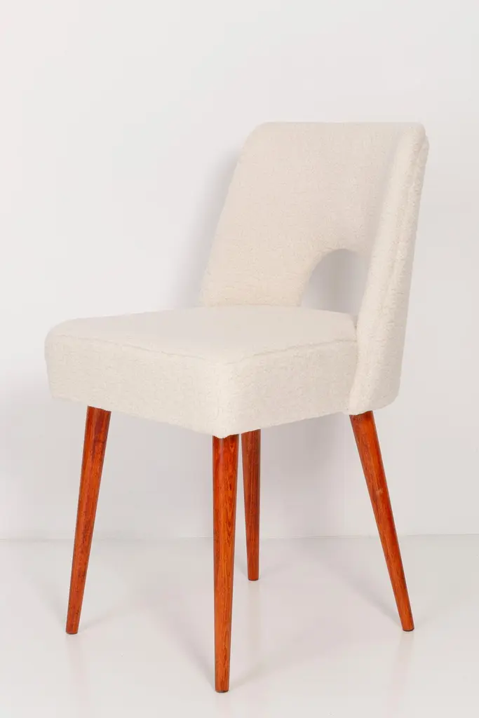 Five beautiful chairs type 1020 colloquially called "shells" produced by the Slupsk centre of furniture industry in the 1960s in Poland. They are after full renovation upholstery and carpentry. Seat and back is dressed in crème, durable and pleasant to the touch bouclé fabric. For wood renovation we used Teak color varnish. We can prepare this set in every color of wood and fabric also in smaller or bigger sets. Please check the last picture with bouclé and wood color samples.