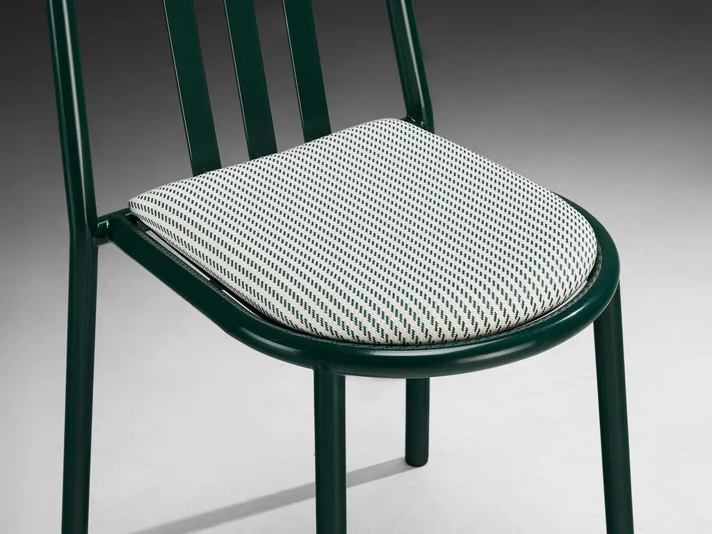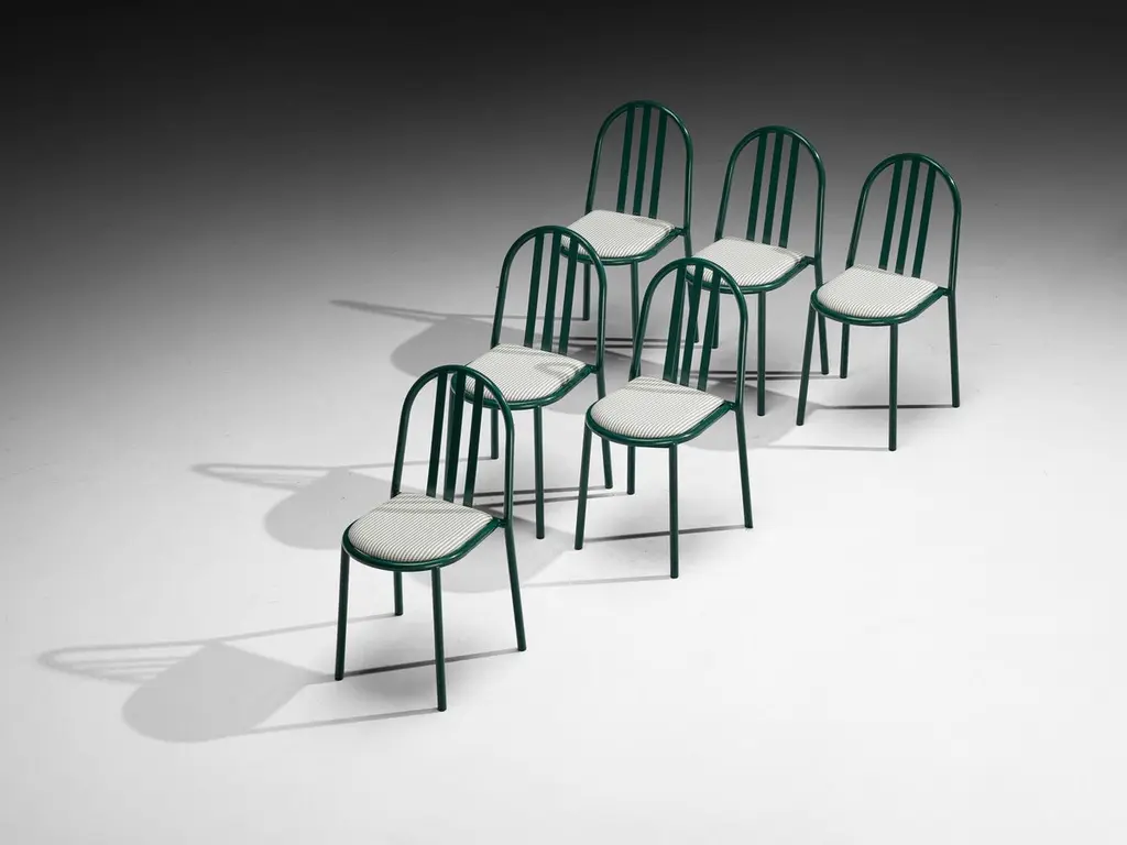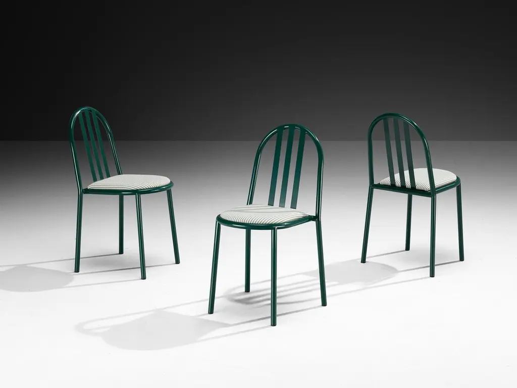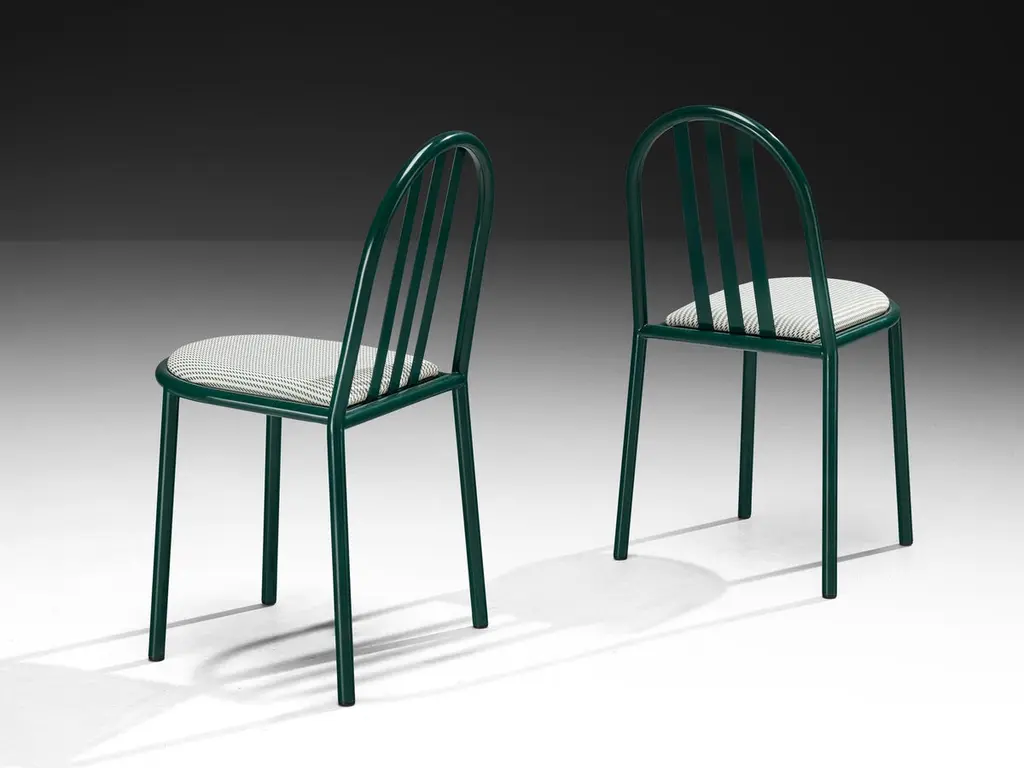 Robert Mallet Stevens for Stevens designs, dining chairs, lacquered steel, fabric, France, design 1928, production later. Admirable set of green lacquered tubular chairs with green-white patterned seats, designed by one of the masters of the Modern architecture; French architect Robert Mallet Stevens. This model chair is one of Mallet-Stevens's best-known pieces of furniture that he created for the Art Menagers exhibition in 1936. Mallet-Stevens vision on furniture was that it should be “Functional in terms of contemporary living, simple and suitable for mass production”. The chair is a masterpiece of simplicity—durable and stackable. All possible decorative conceits are left out.Robert Mallet Stevens (1886-1945) was a French modernist who is especially known for his work as an architect, and design interiors, film sets and furniture as well. He is considered one of the most influential French architects of the first half of the twentieth century. One of his highlights was the design of Villa Cavroix in 1932, where he also used the tubular chairs for the interior.Please note that the depicted photographs of these chairs show the final result of what the items will look like after respraying and reupholstery. The price on offer is valid for this final result, including fabric, lacquer and labor. The refinished item has a current lead-time of twelve to fourteen weeks and will be performed by our experienced craftspeople in our in-house restoration atelier. All to meet our high-quality and standards. For further questions please contact our design specialists regarding reupholstery and specific lead-time.If you are looking for a large amount of chairs for your project, please ask one of our advisors for more information about the amount we currently have available. Our collection holds a large number of this model chairs, which all can be customized exactly following as you desire for your project. The listed price is per item.