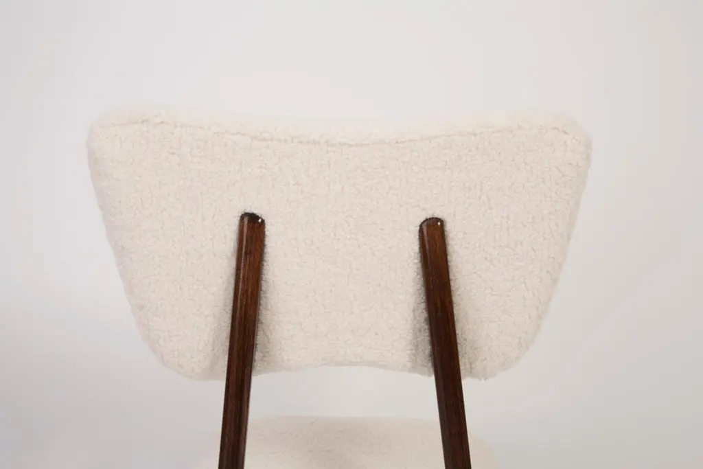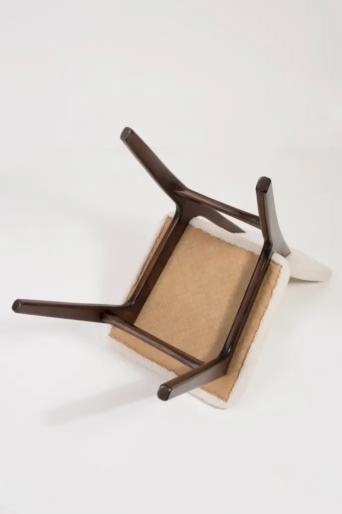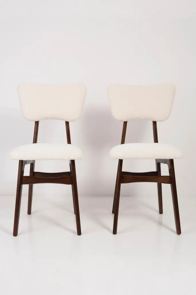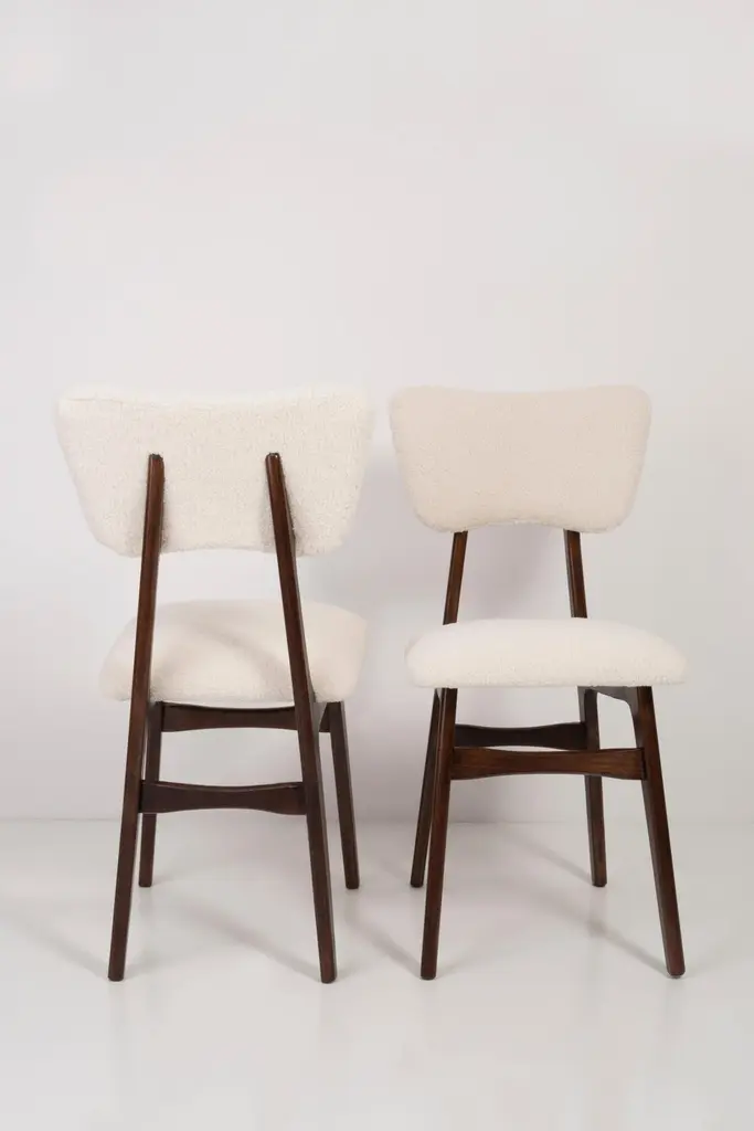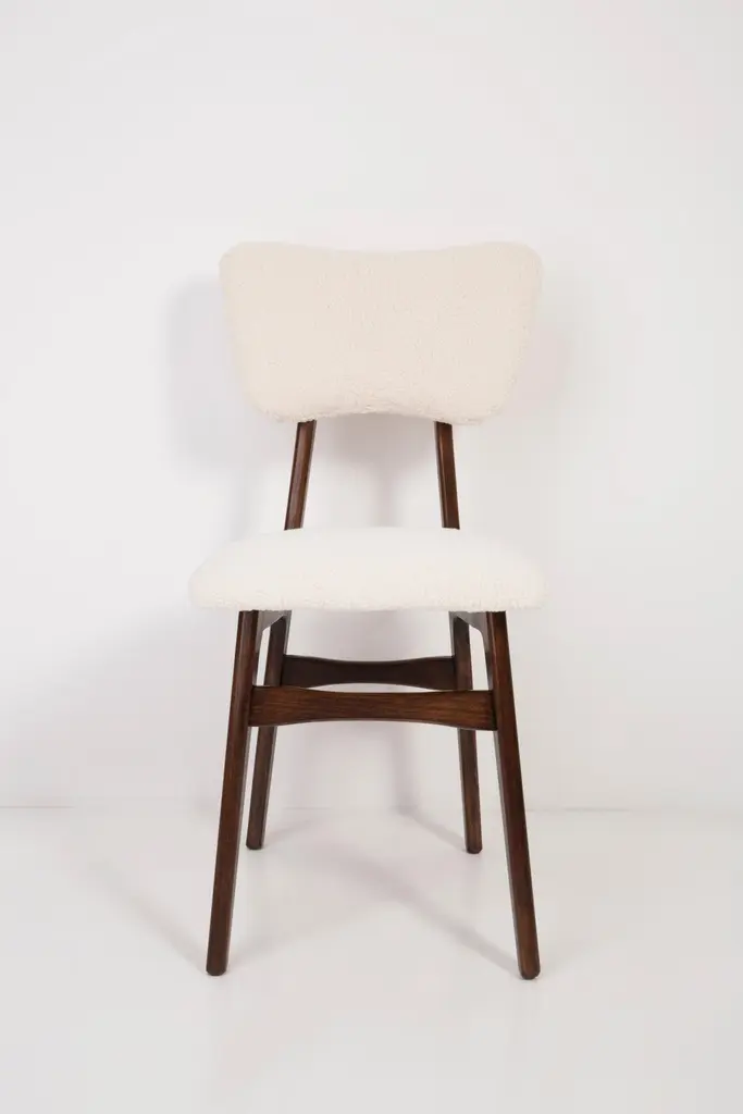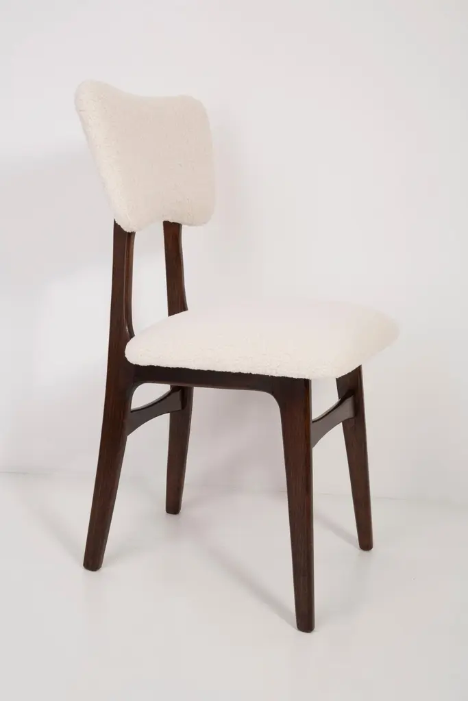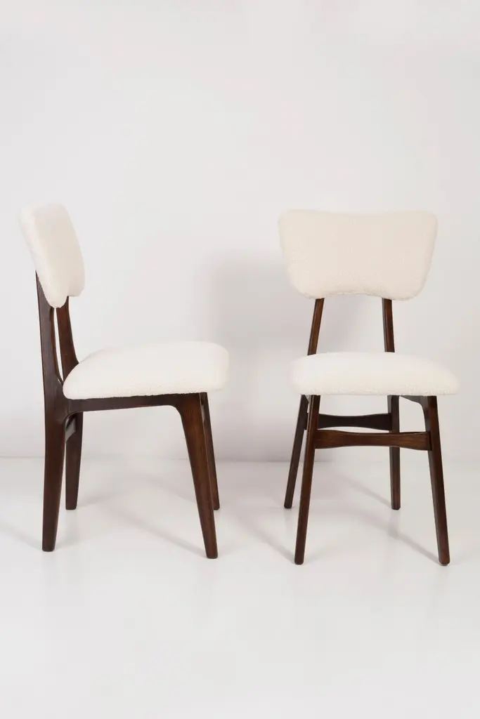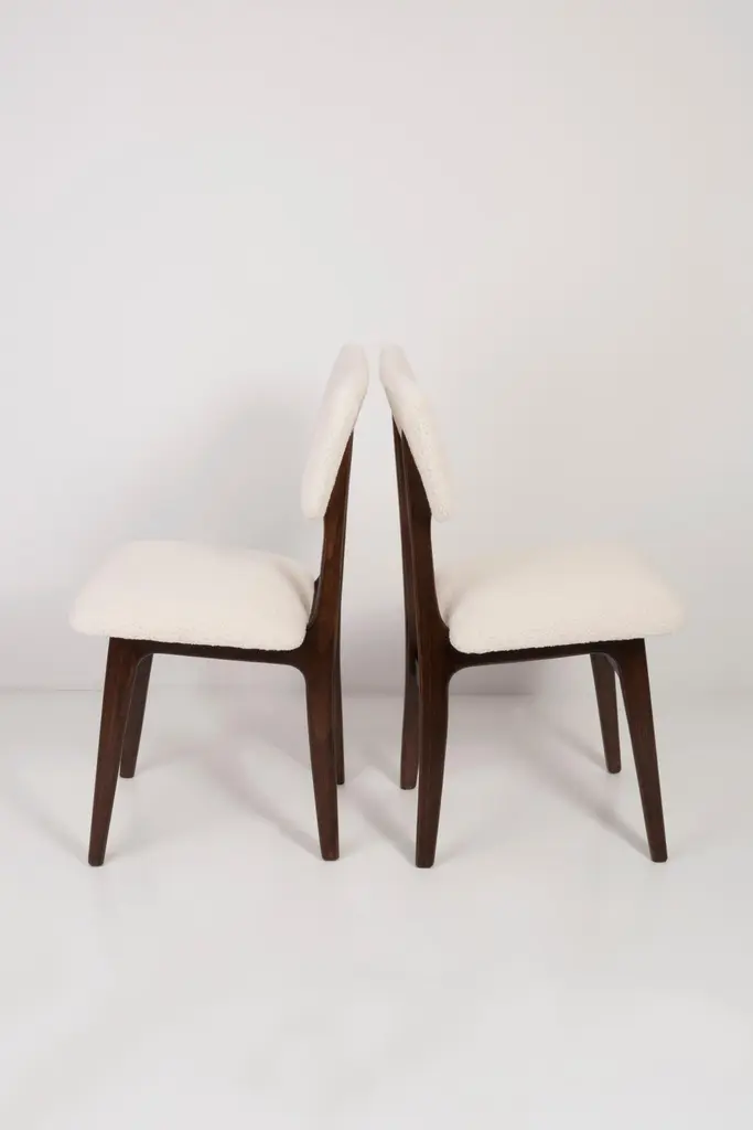 Chairs designed by Prof. Rajmund Halas. Made of beechwood. Chair is after a complete upholstery renovation, the woodwork has been refreshed. Seat and back is dressed in crème, durable and pleasant to the touch boucle fabric. Chair is stable and very shapely. They was produced in former furniture factory in Goleniów in the 1960s. We can prepare this set in every color of wood and fabric. Please check the last picture with boucle color samples.
