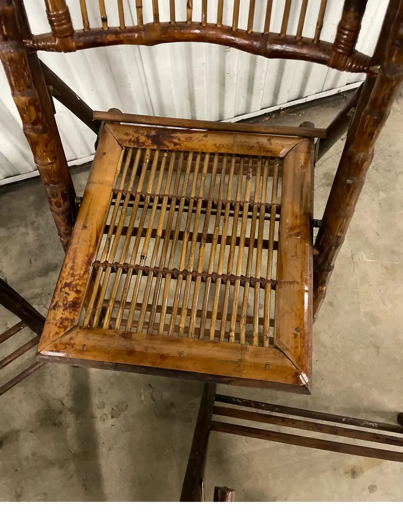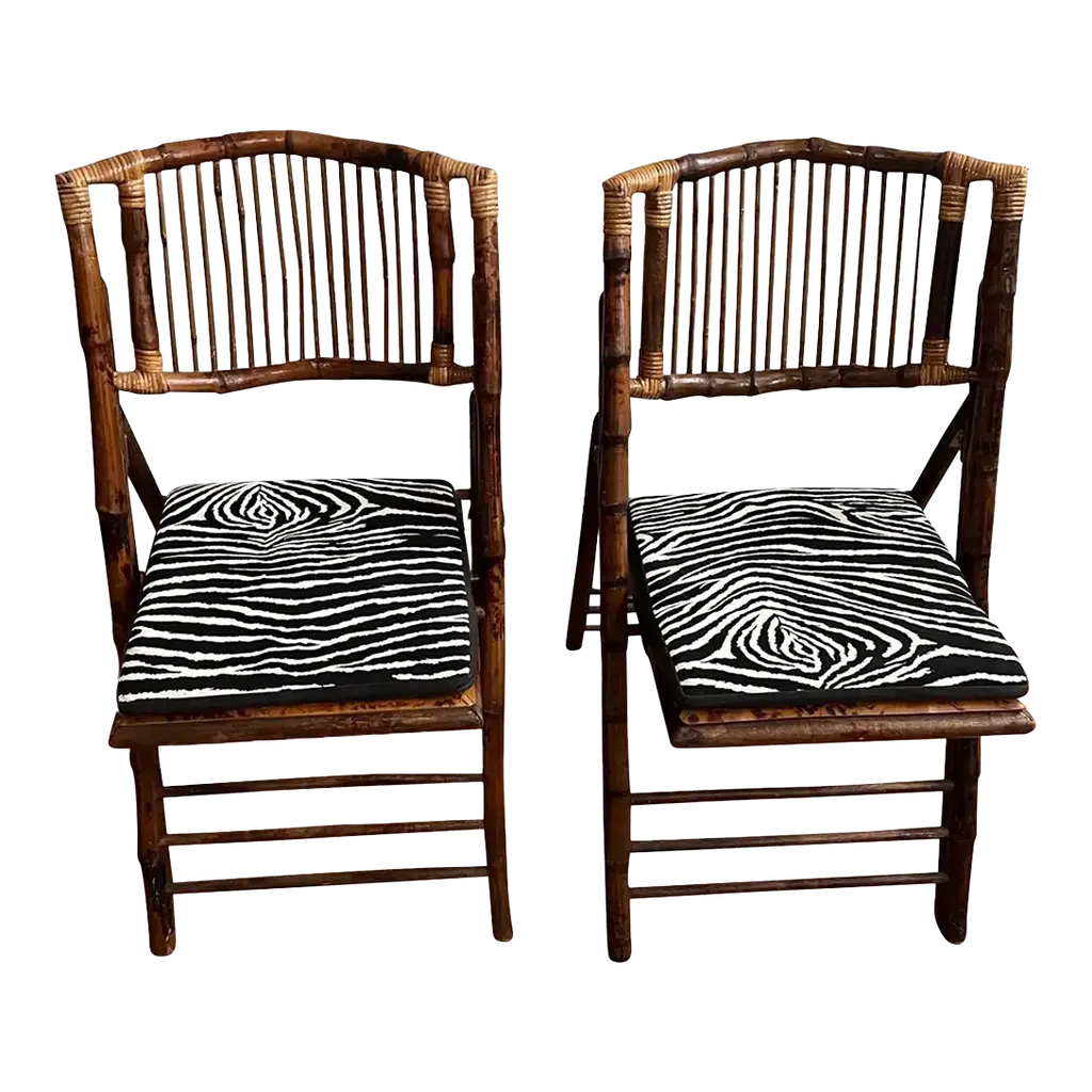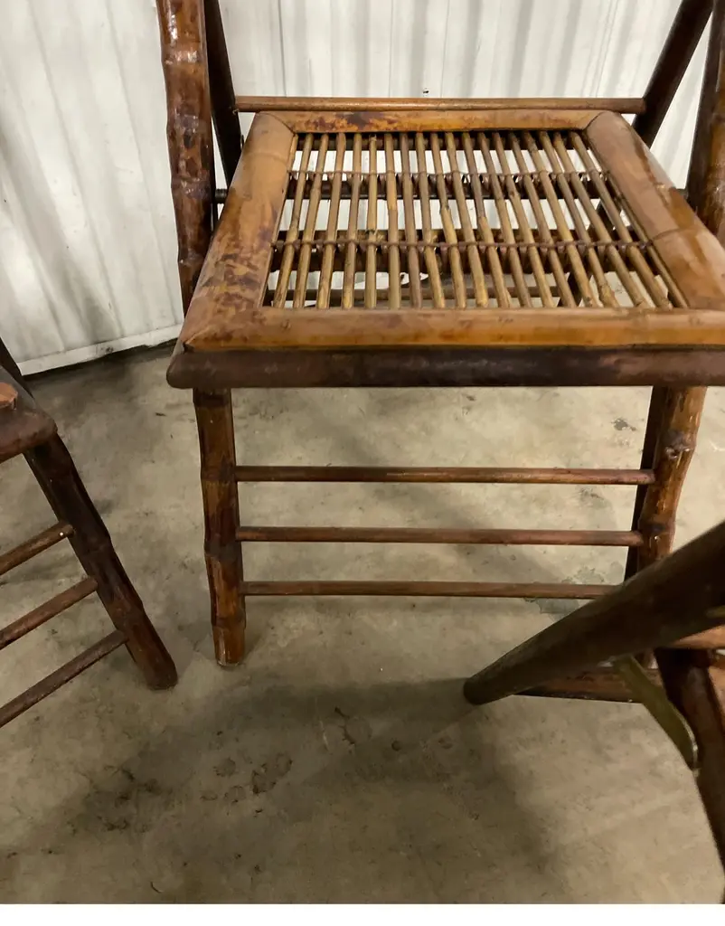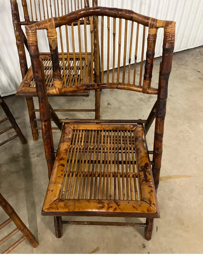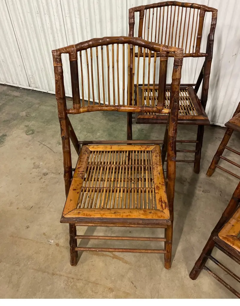 Set Of Four Burnt Bamboo Tortoise Folding Chairs
