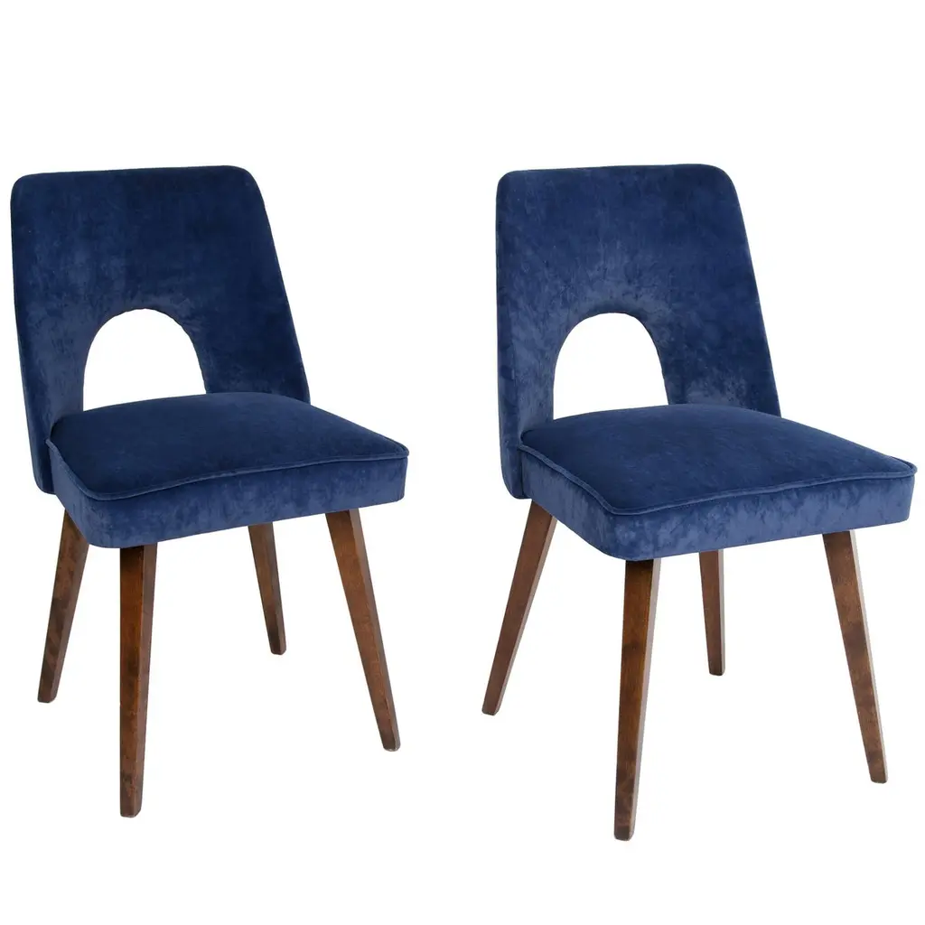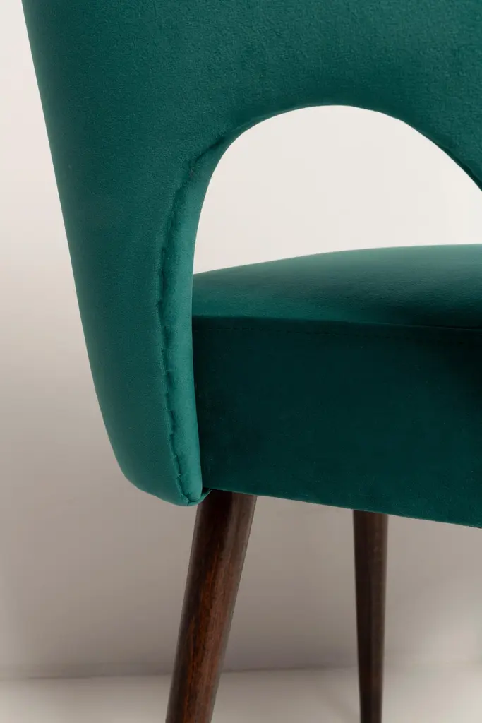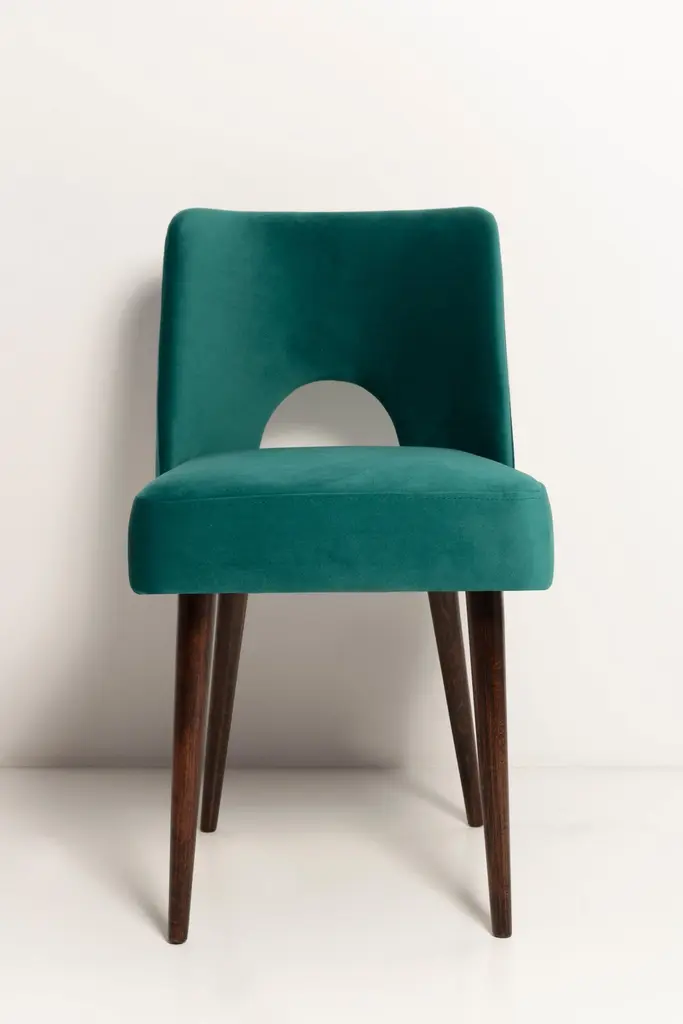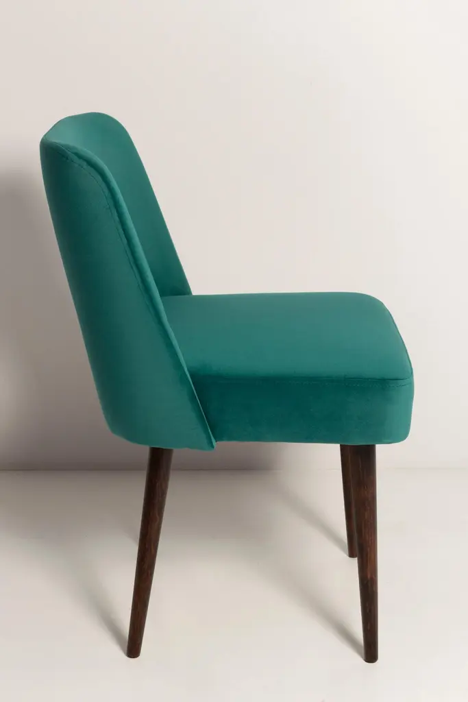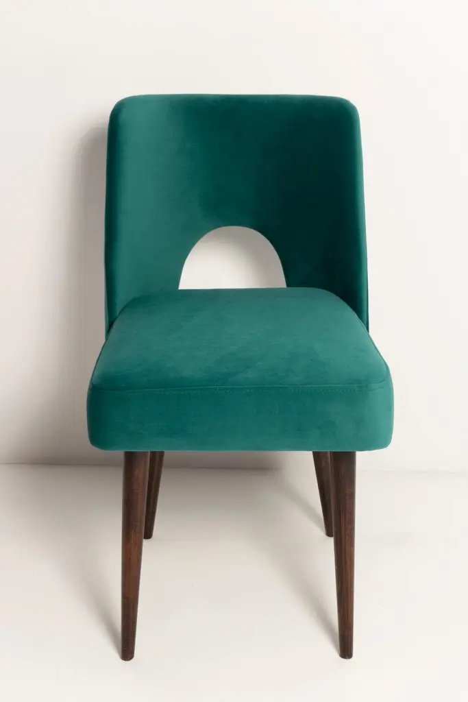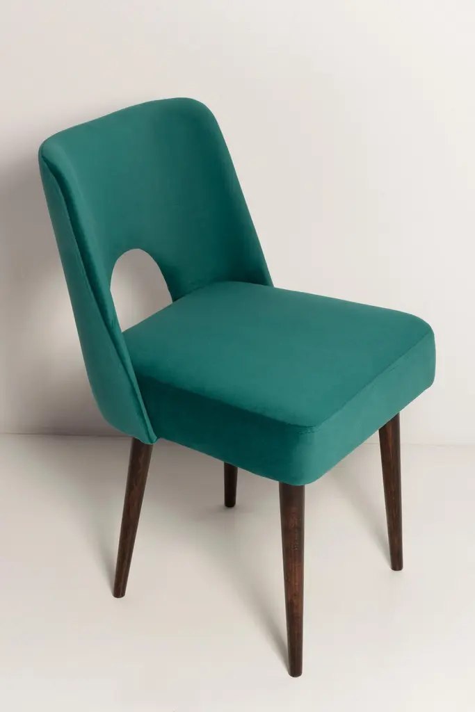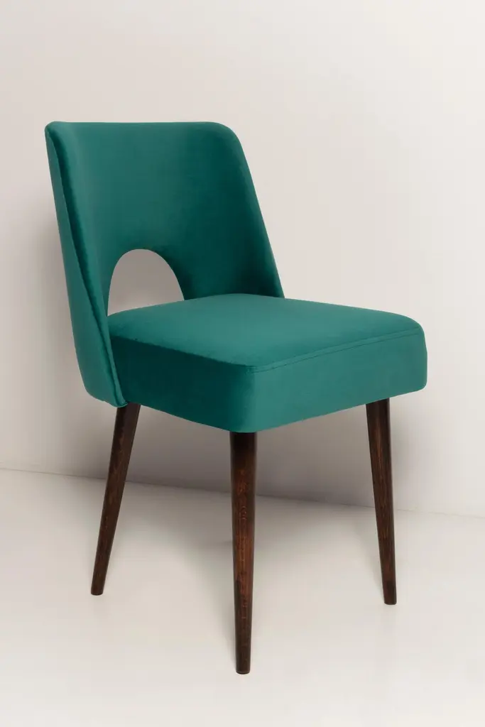 Beautiful chairs type 1020 colloquially called "shell" produced by the Slupsk centre of furniture industry in the 1960s in Poland. They are after full renovation upholstery and carpentry. Seat and back is dressed in blue/green, durable and pleasant to the touch velvet fabric. We can prepare this chair in every color of wood and fabric also in bigger sets. Please check the last picture with velvet color samples.