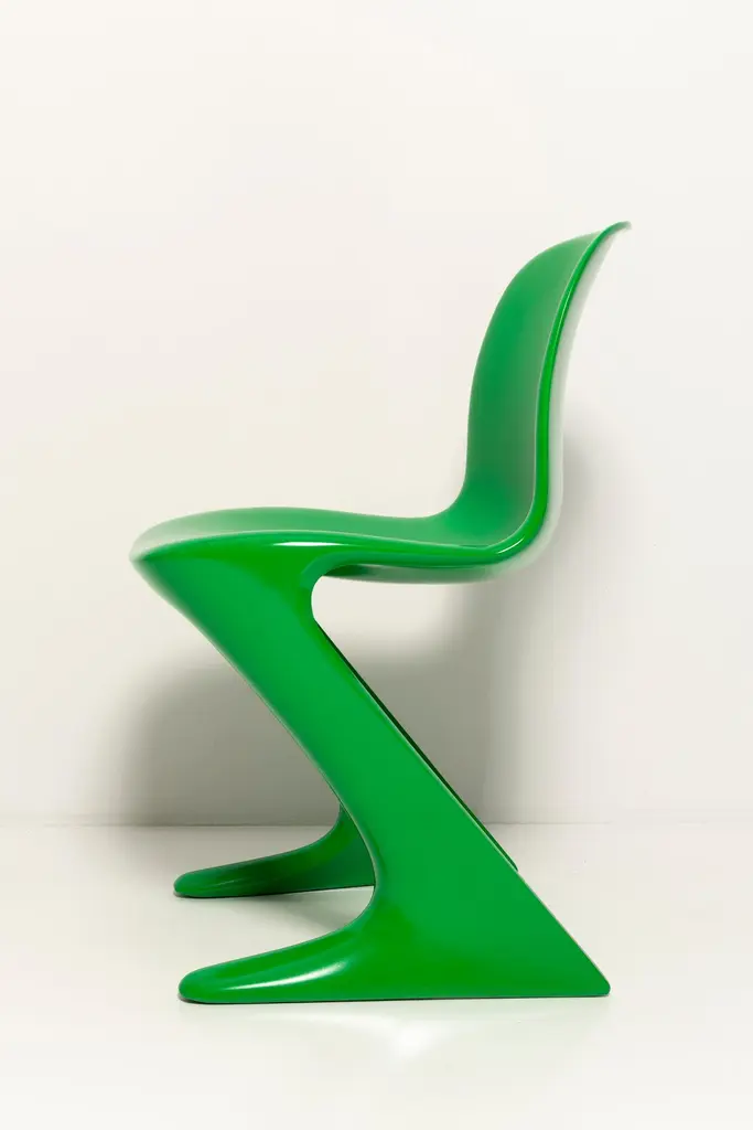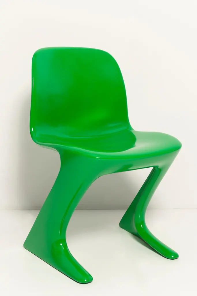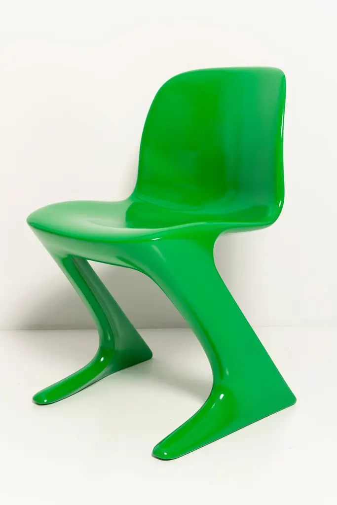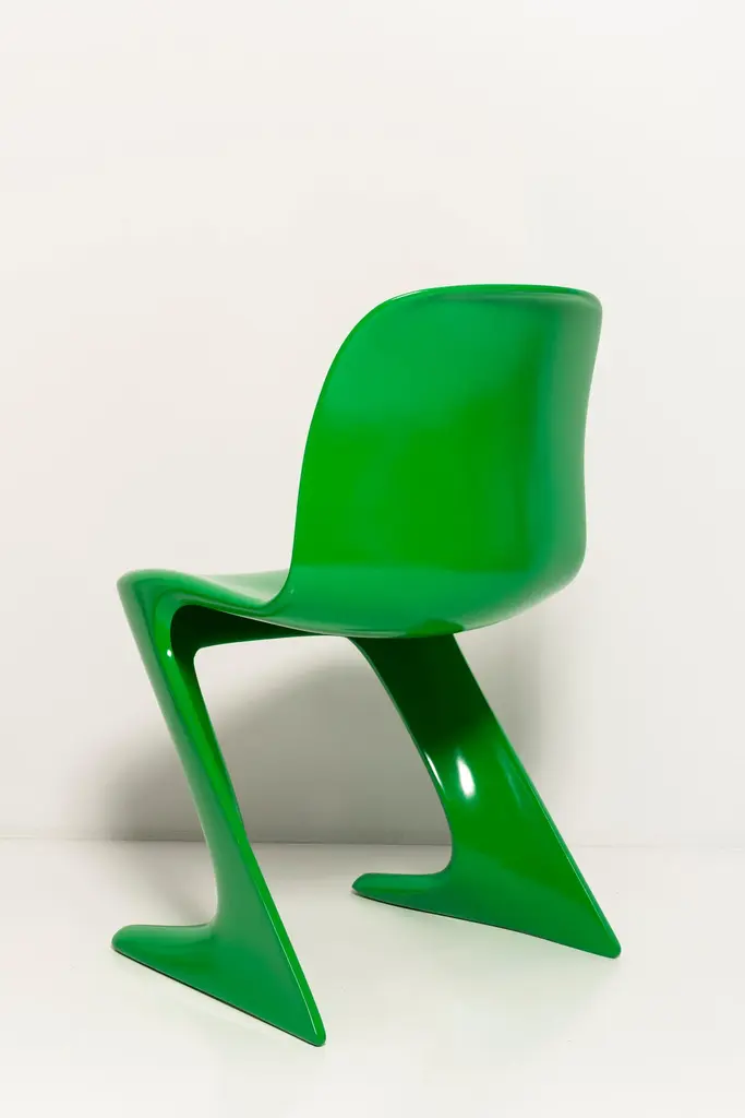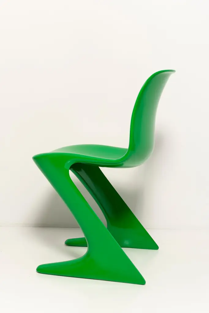 This model is called Z-chair. Designed in 1968 in the GDR by Ernst Moeckl and Siegfried Mehl, German Version of the Panton chair. Also called kangoroo chair or variopur chair. Produced in eastern Germany.Chairs are after renovation - new semi glossy Bottega Venetta inspired green color lacquer. Timeless form of the chair make them more unique. Extremely stabile and comfortable! Only 3 sets available. We can prepare them also in another RAL/Pantone color.