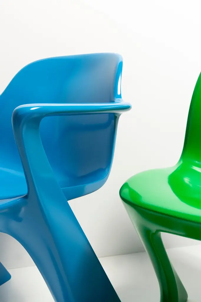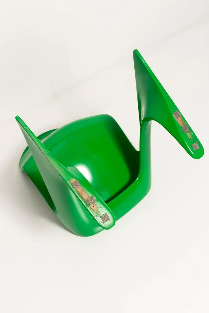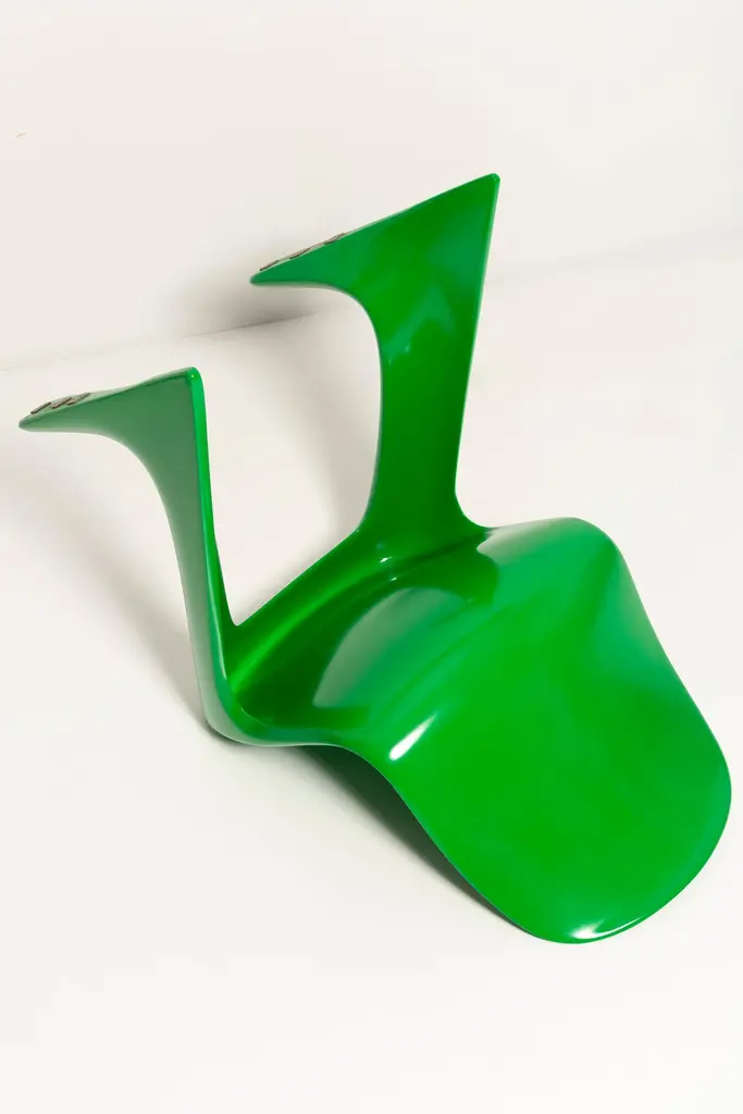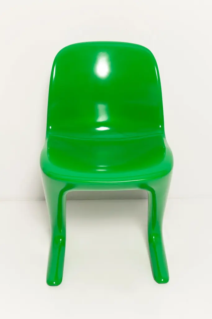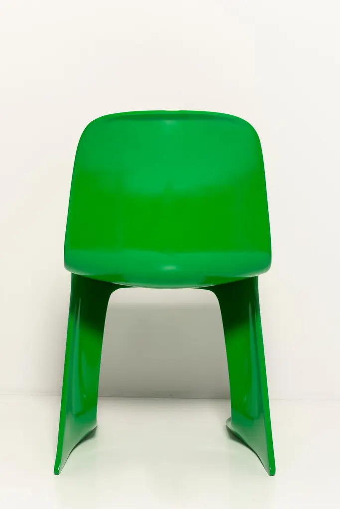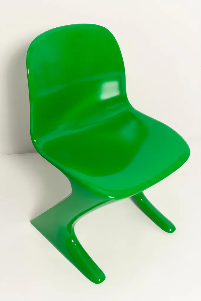 This model is called Z-chair. Designed in 1968 in the GDR by Ernst Moeckl and Siegfried Mehl, German Version of the Panton chair. Also called kangoroo chair or variopur chair. Produced in eastern Germany.Chairs are after renovation - new semi glossy Bottega Venetta inspired green color lacquer. Timeless form of the chair make them more unique. Extremely stabile and comfortable! Only 3 sets available. We can prepare them also in another RAL/Pantone color.
