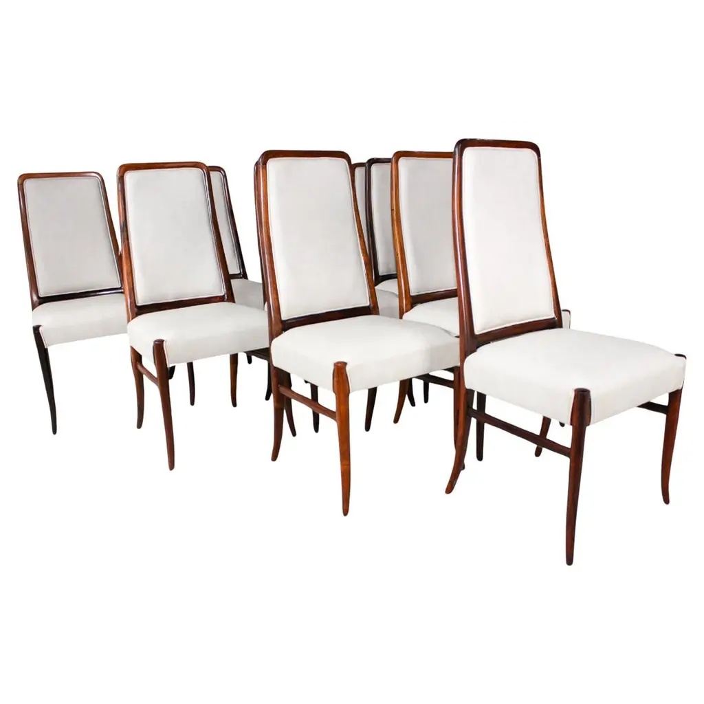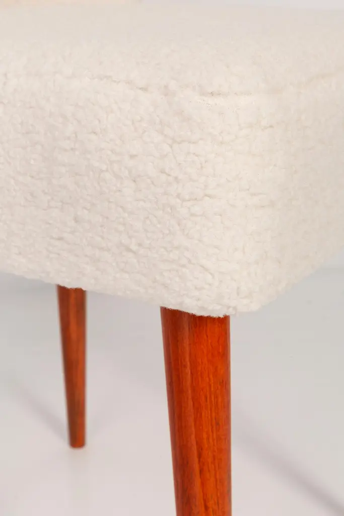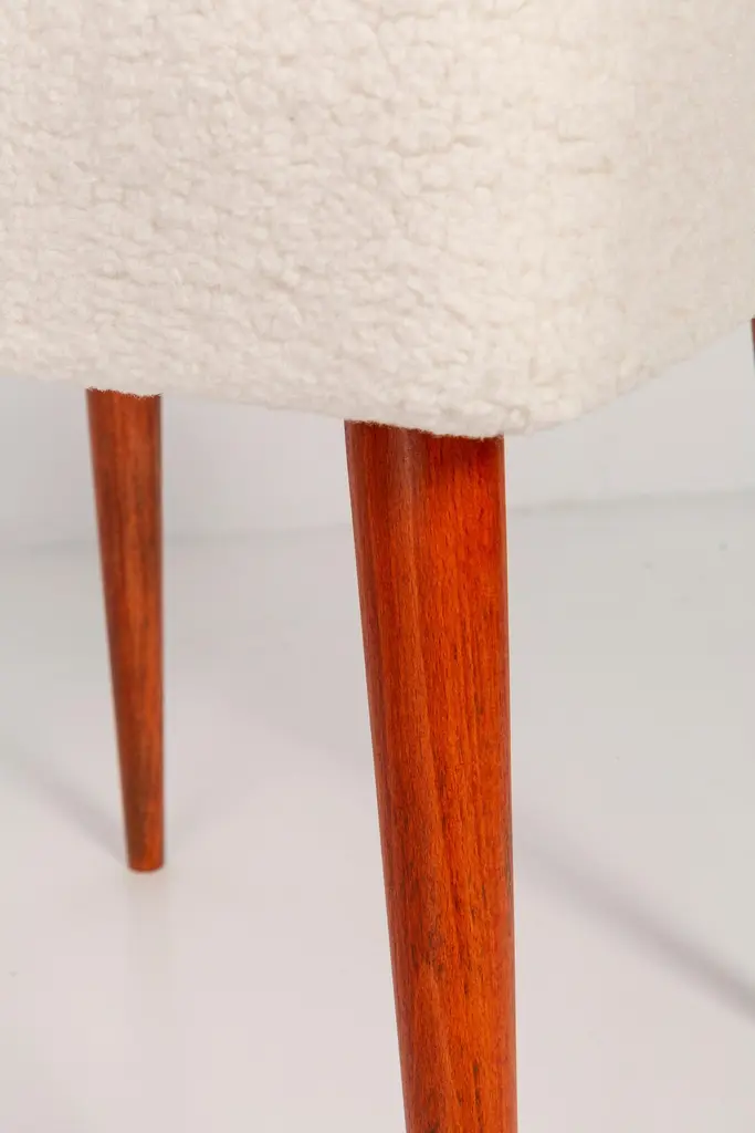 Four beautiful chairs type 1020 colloquially called "shells" produced by the Slupsk centre of furniture industry in the 1960s in Poland. They are after full renovation upholstery and carpentry. Seat and back is dressed in crème, durable and pleasant to the touch bouclé fabric. We can prepare this set in every color of wood and fabric also in smaller or bigger sets. Please check the last picture with bouclé color samples.