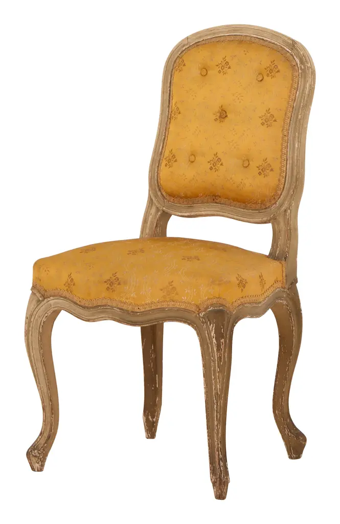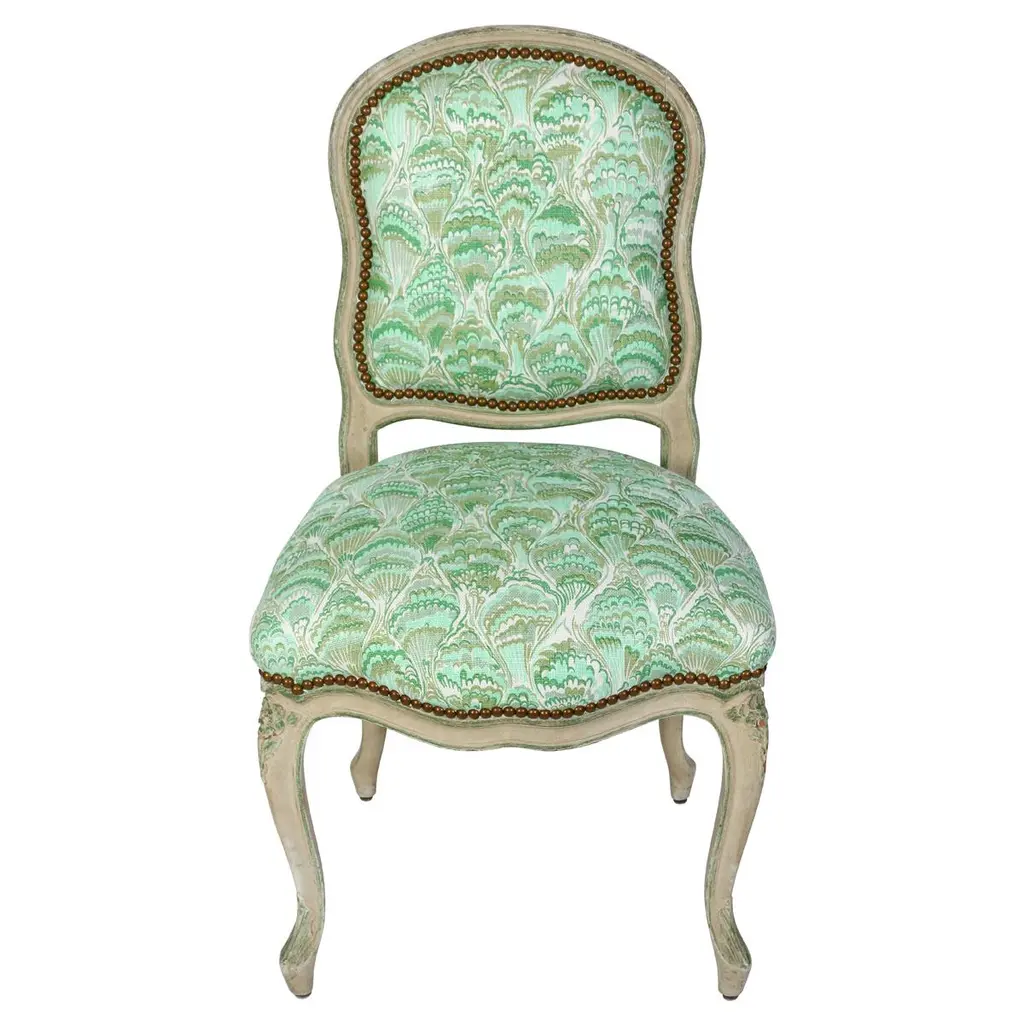A beautiful set of four Louis XV style painted dining chairs updated with new fabric. Each chair is upholstered with Meg Braff Designs "cockleshells" fabric in minty green. The elegant set of dining chairs is crafted in the timeless Louis XV style, featuring a delicate off-white painted finish with subtle green highlights that enhance their vintage charm. The chairs boast intricate carved details at the top of the legs and feet, adding a touch of refinement and sophistication. Their graceful cabriole legs and oval-shaped backs, nailhead trim and distressed painted finish create an air of charm and classic beauty. Newly upholstered in fresh mint green fabric, these chairs offer both comfort and style, making them the perfect addition to any dining room with an air of timeless elegance.