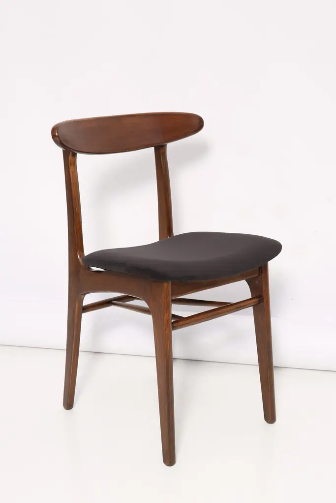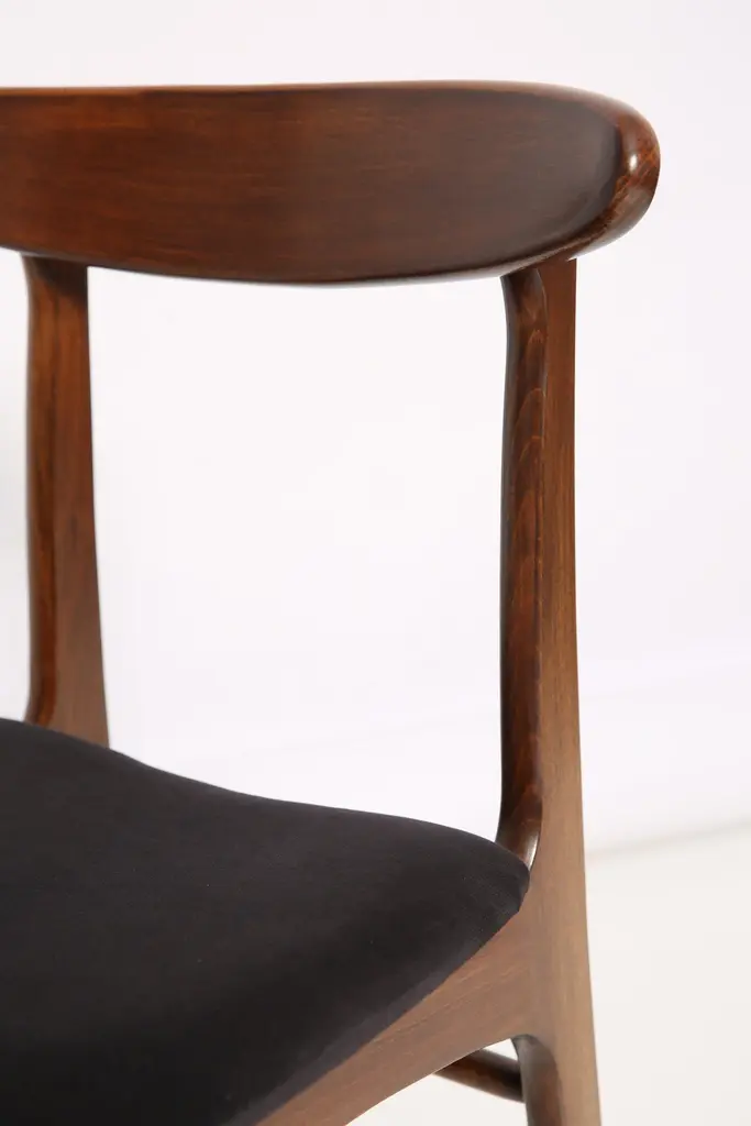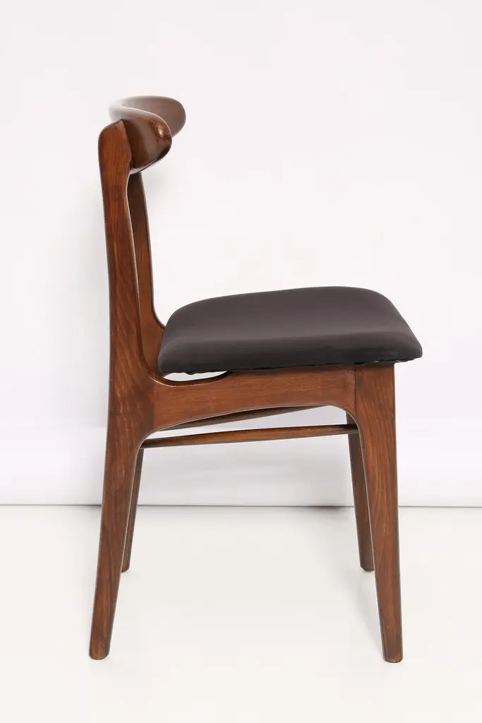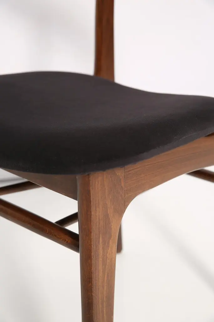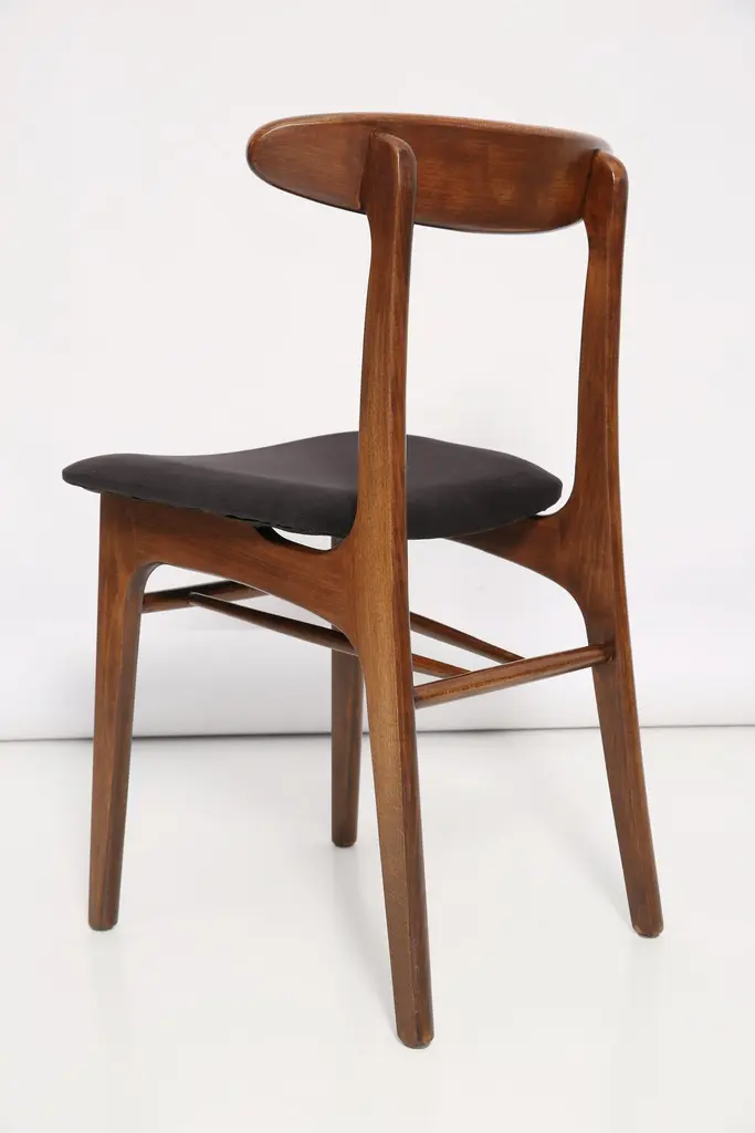 Chairs designed by Prof. Rajmund Halas. Made of beechwood. The set is after a complete upholstery renovation, the woodwork has been refreshed. Seat is dressed in black, durable and pleasant to the touch velvet fabric. Chair is stabile and very shapely. They was produced in former furniture factory in Goleniów in the 1960s. We can prepare this set in every color of wood and fabric also in bigger sets. Please check the last picture with velvet color samples.