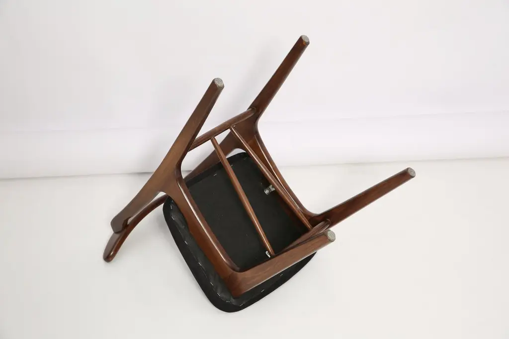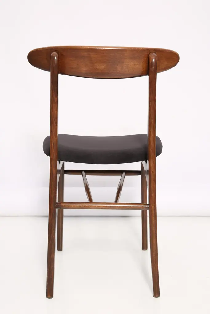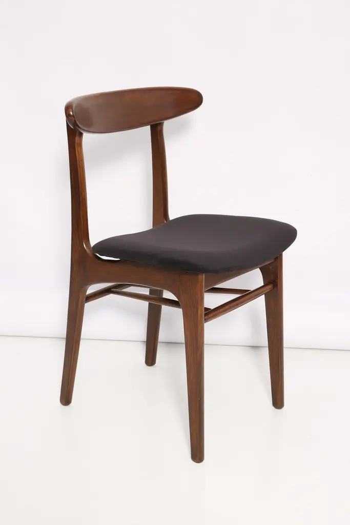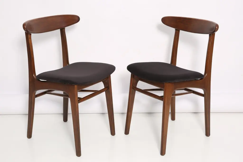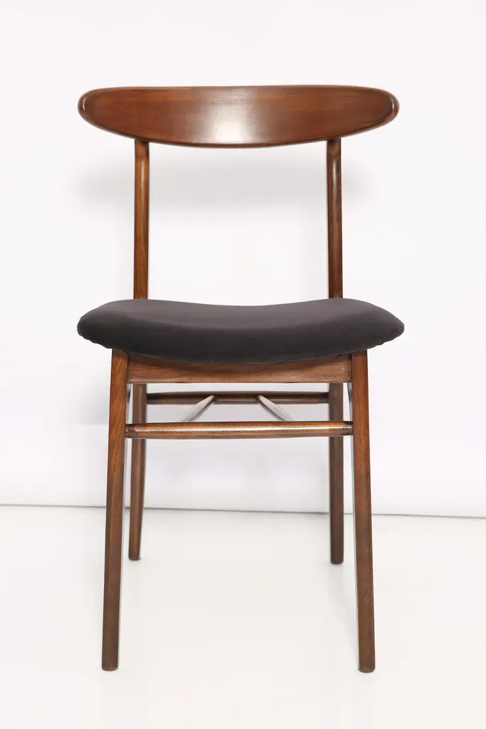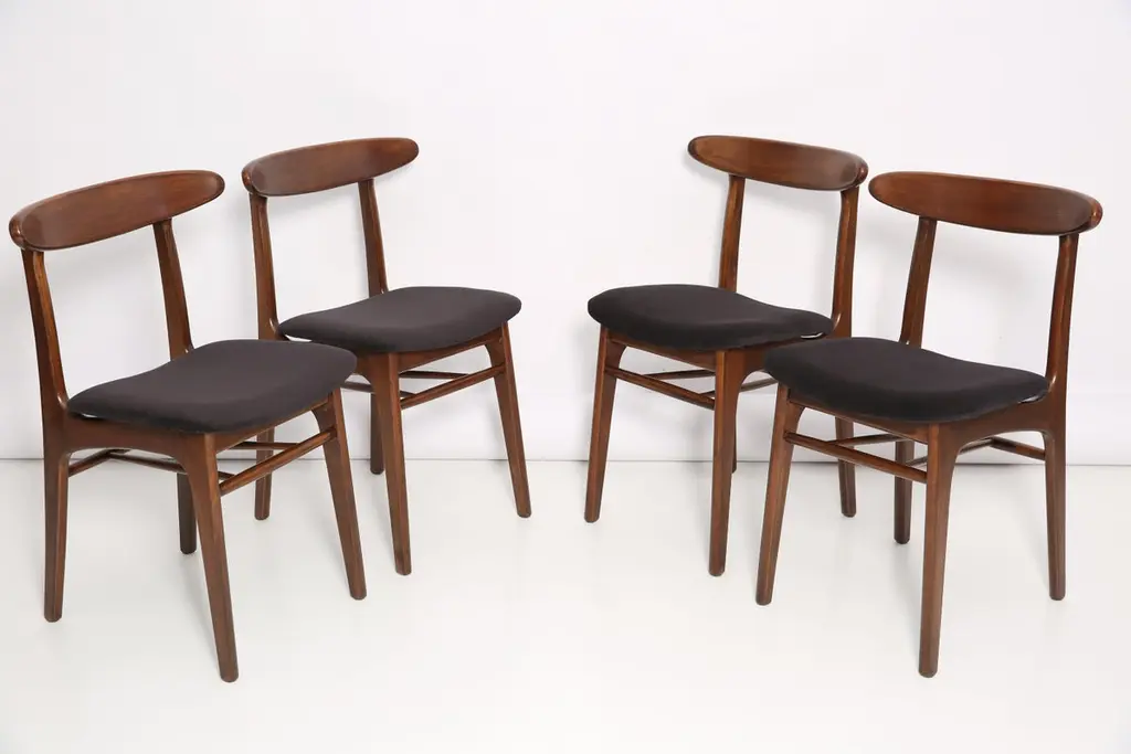 Chairs designed by Prof. Rajmund Halas. Made of beechwood. The set is after a complete upholstery renovation, the woodwork has been refreshed. Seat is dressed in black, durable and pleasant to the touch velvet fabric. Chair is stabile and very shapely. They was produced in former furniture factory in Goleniów in the 1960s. We can prepare this set in every color of wood and fabric also in bigger sets. Please check the last picture with velvet color samples.