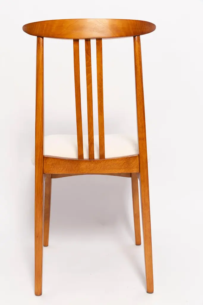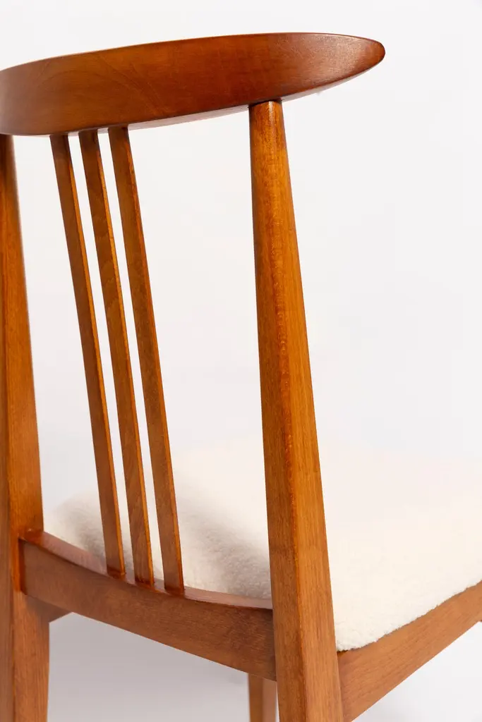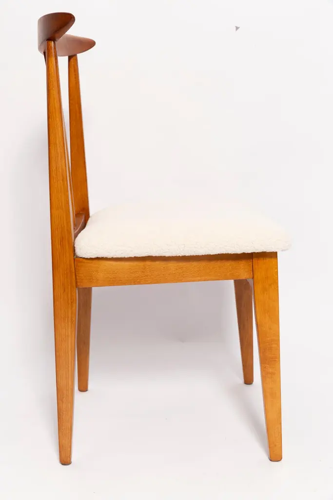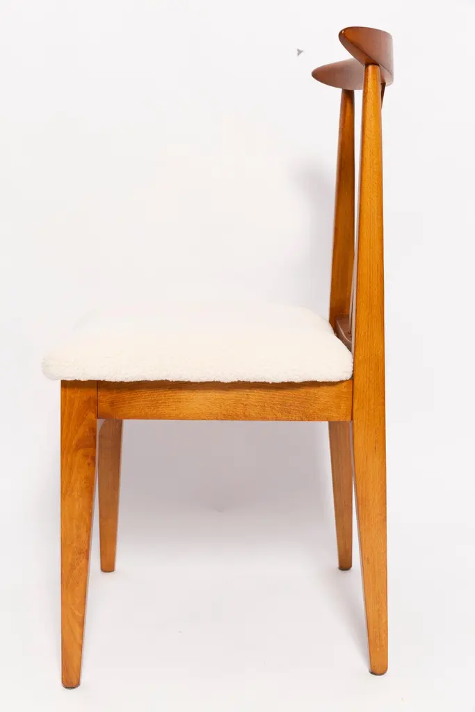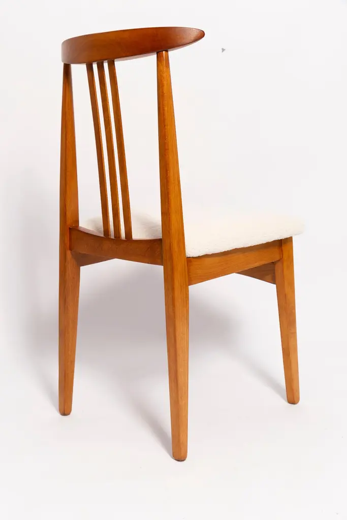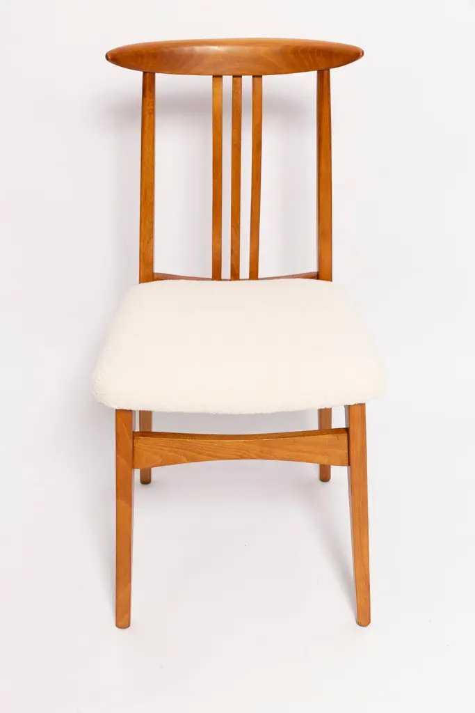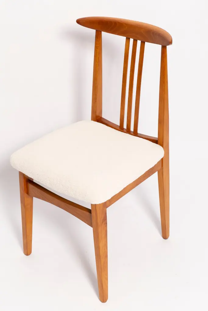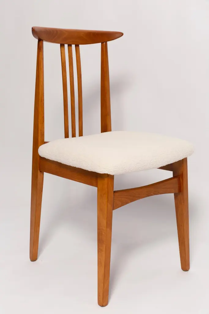 A beautiful beech chair designed by M. Zielinski, type 200 / 100B. Manufactured by the Opole Furniture Industry Center at the end of the 1960s in Poland. The chair is after undergone a complete carpentry and upholstery renovation. Seats covered with high-quality italian light cream ivory boucle fabric (color 01). Beech wood is after full refreshing, varnished in medium brown warm color lacquer. This model of chair have very nice and organic shape. They have amazing form. Even in small size the Zielinski's chair is very comfortable. We highly recommend them to every type of interior. ecommend them to every type of interior. Here set of 4 chairs is available. We can prepare also bigger sets in every color of wood and boucle. Waiting time up to 3 weeks. Cheap delivery guaranteed.
