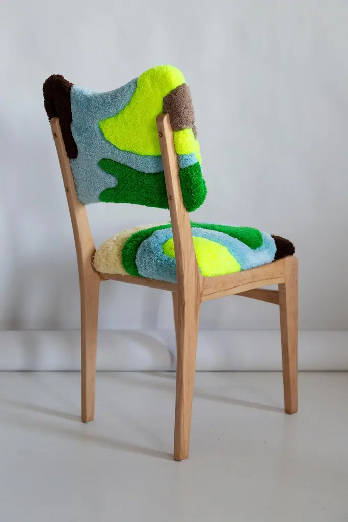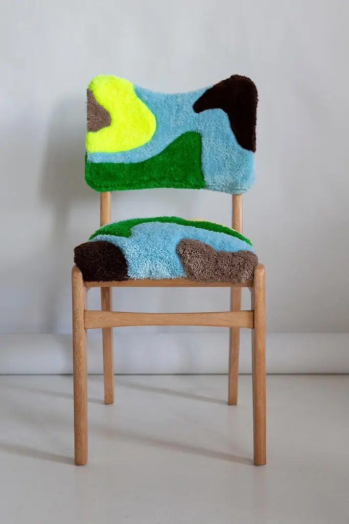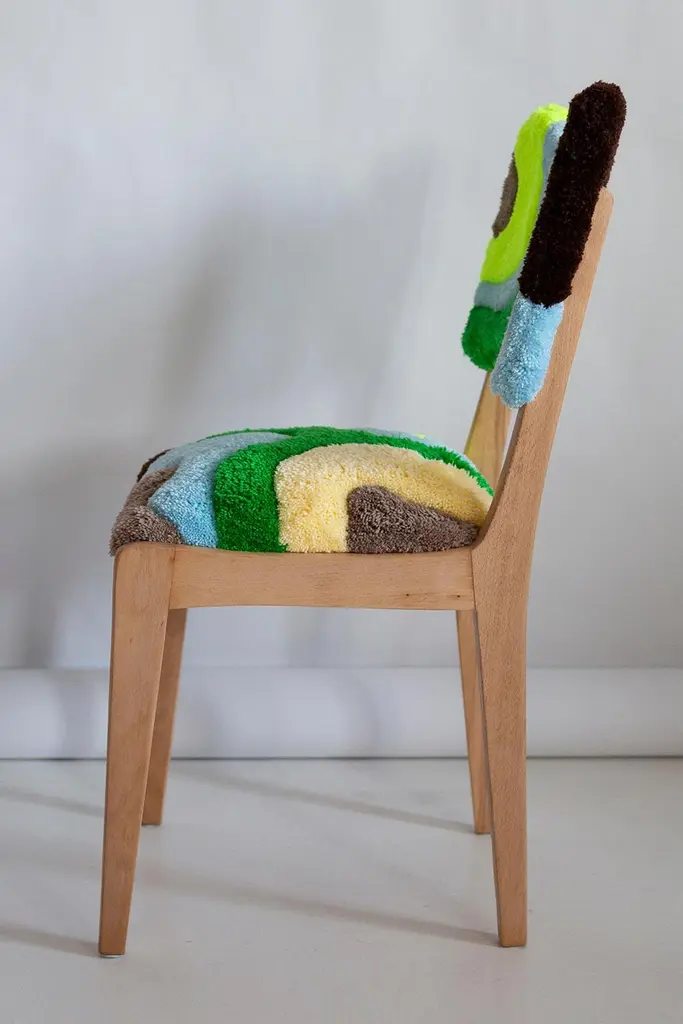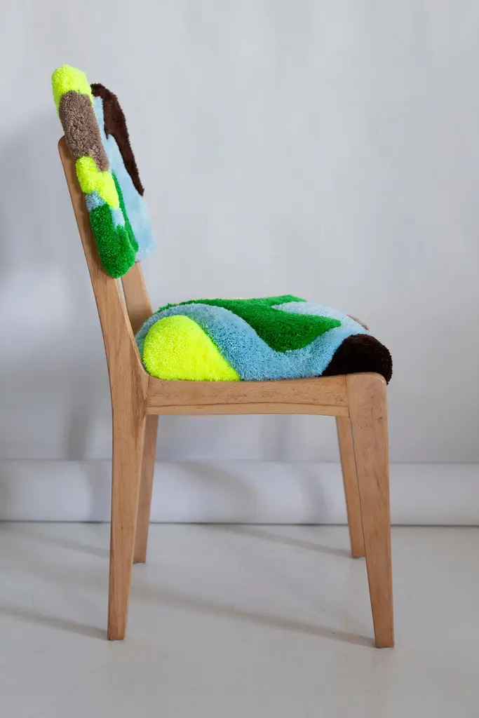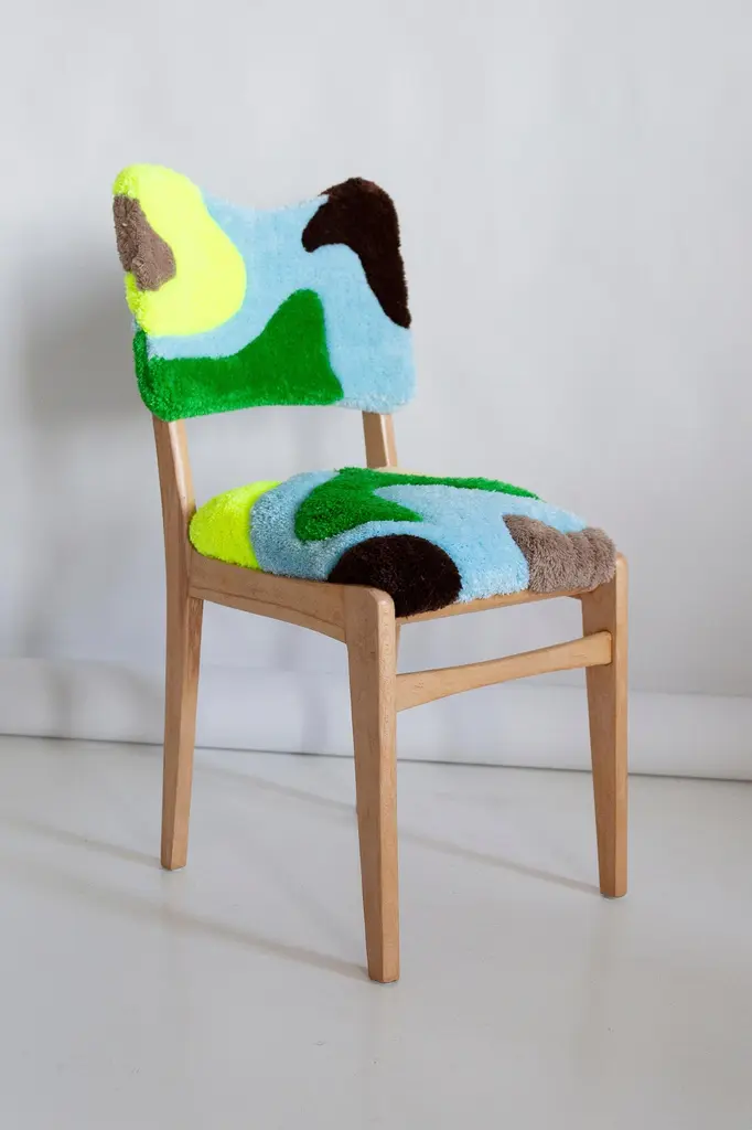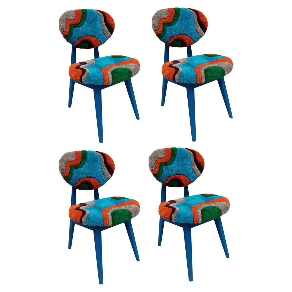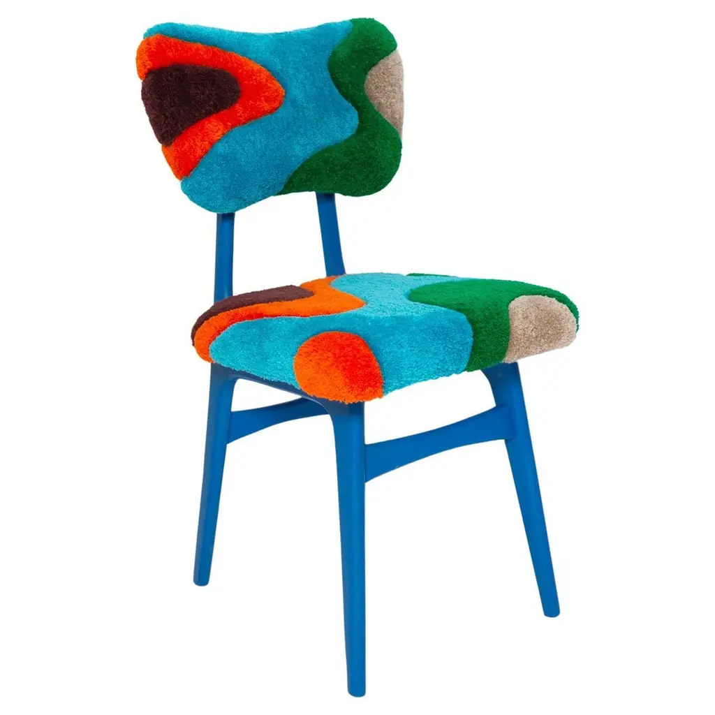 Chair designed by Prof. Rajmund Halas. Made of beechwood. Chair is after a complete upholstery renovation, the woodwork has been refreshed. Seat is hand tufting multicolor wool. Absolutely hand made technic. Every chair is unique and can be a bit different. Chair is stable and very shapely. They was produced in former furniture factory in Goleniów in the 1960s. We can prepare this chair in every color of wood and fabric also in bigger sets. Please ask for more informations. Set of four chair is available here.