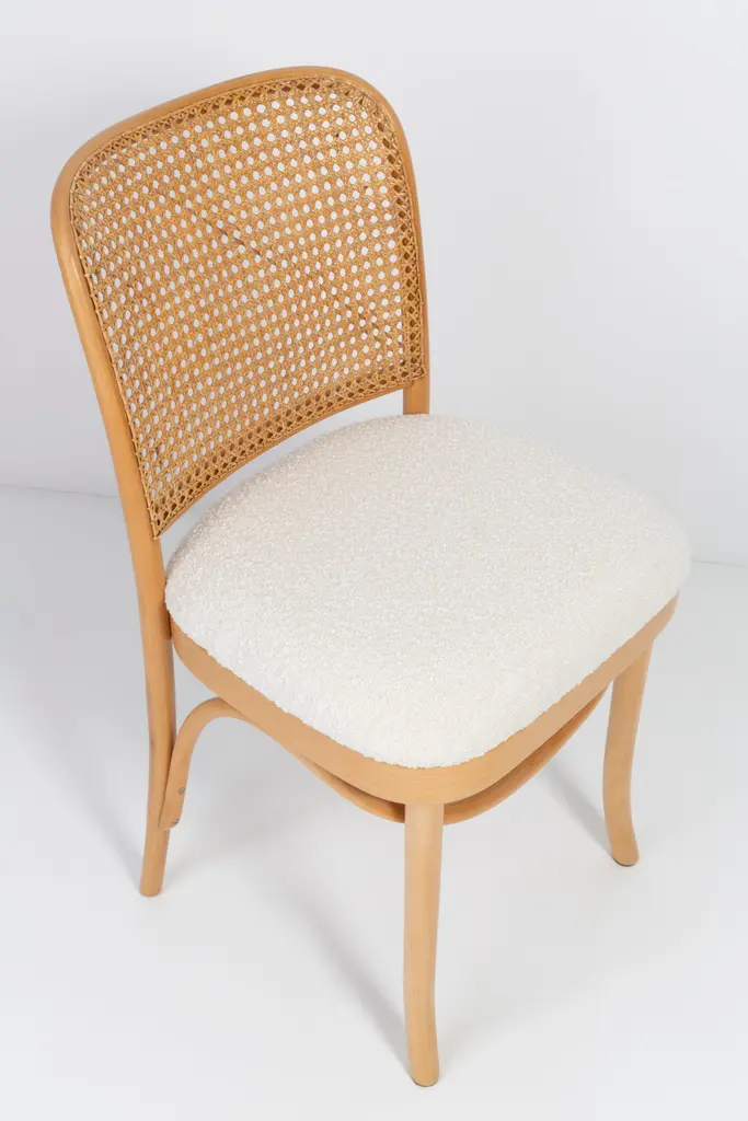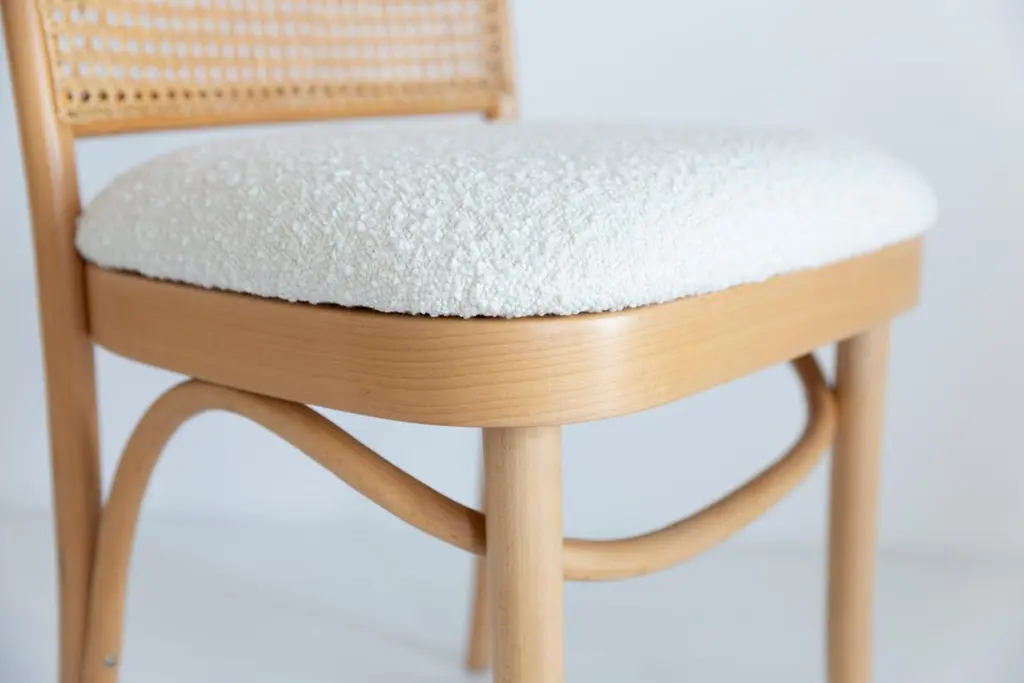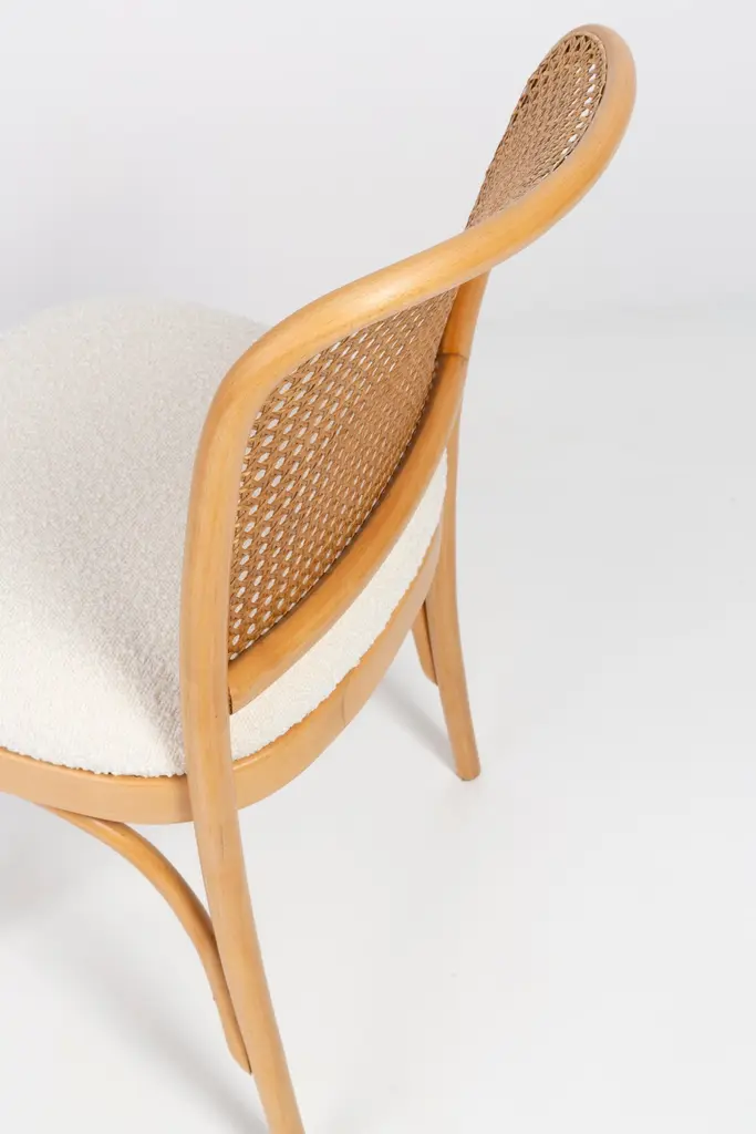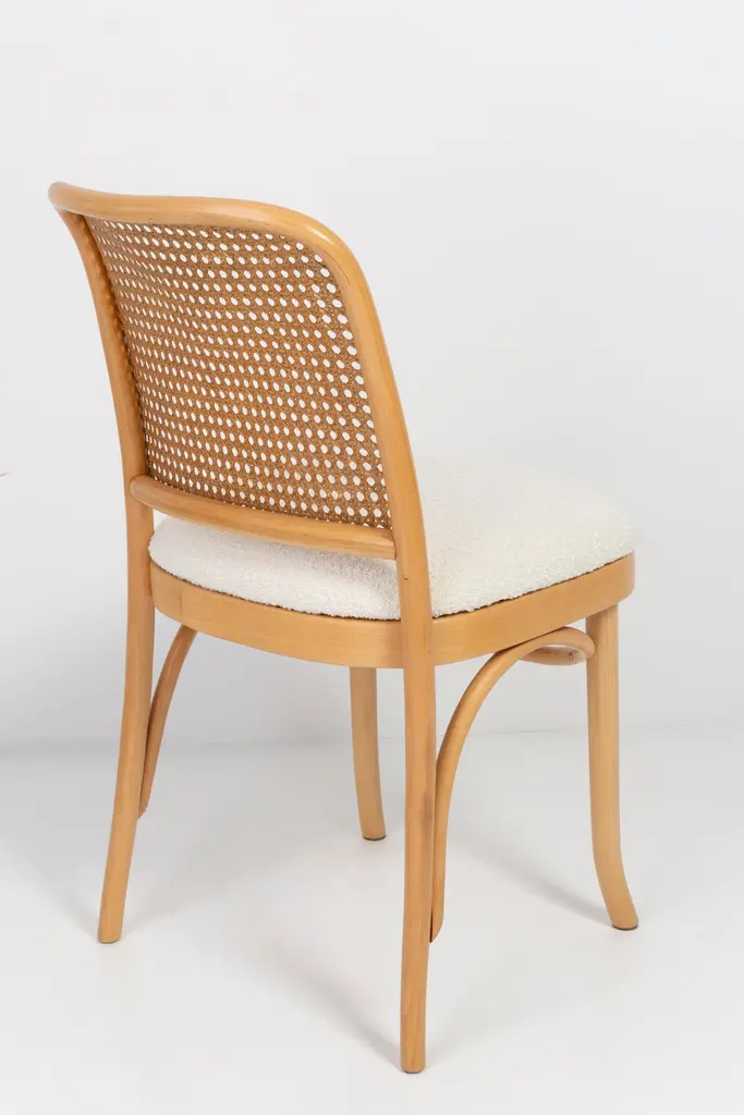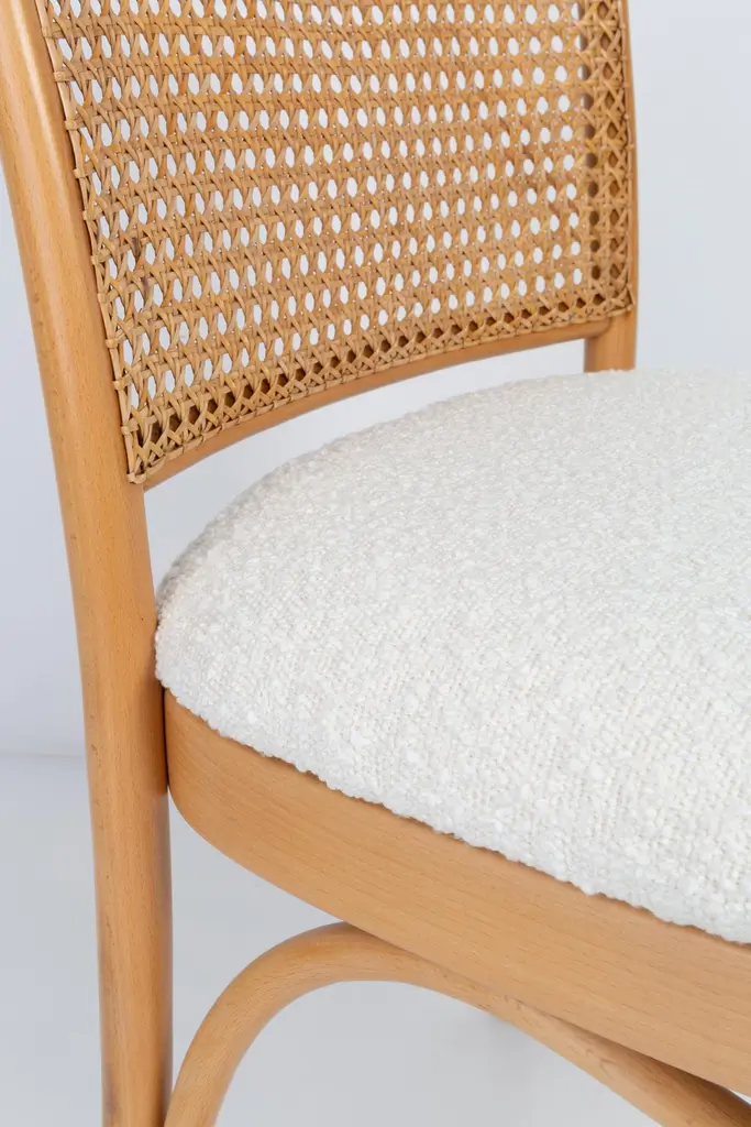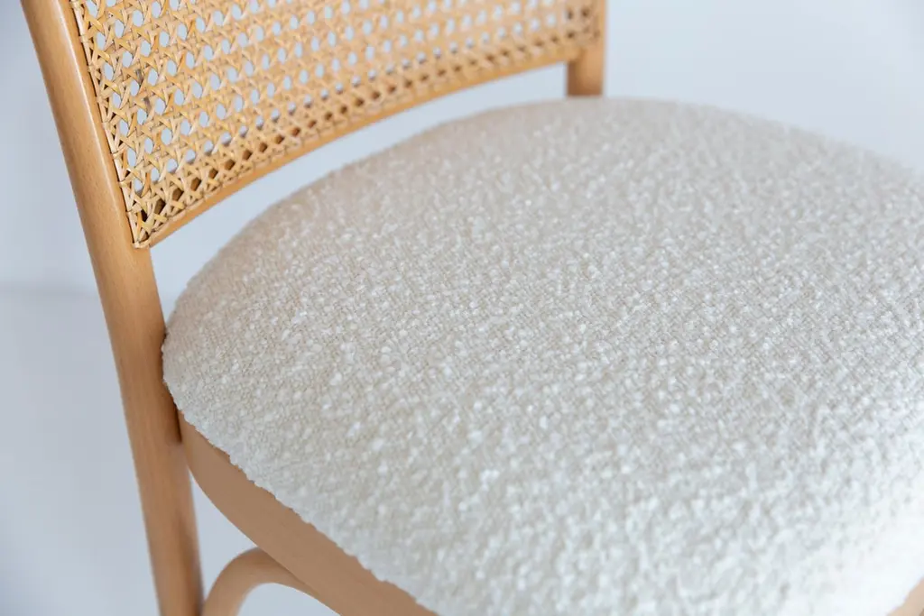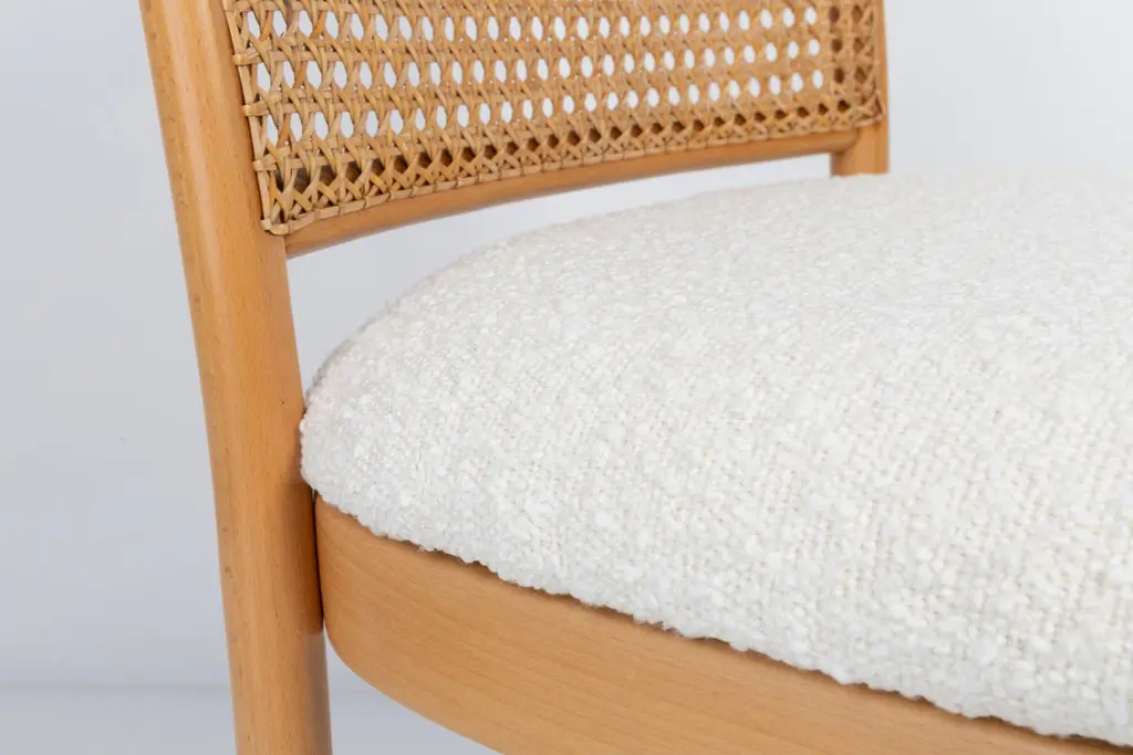 A set of 4 rattan and wood chairs. The furniture was designed by Helena and Jerzy Kurmanowicz. They were produced in Thonet Woodworking Factory and we thoroughly renovated them. The construction is made of beechwood dyed with water stain light brown. The chairs are protected with acrylic varnish with a satin glow. The upholstery fabric was produced in the clean boo technology and has water-repellent properties. This means that the fabric limits the absorption of liquids. Spilled liquid on the surface will form balls. The chairs have undergone a complete carpentry and upholstery renovation. Seats covered with high-quality white boucle fabric. Abrasion Resistance Category A (60,000 cycles). We can prepare also bigger sets 2, 6, 8 or more chairs in different wood and boucle color. Rattan is refreshed and is in perfect condition.