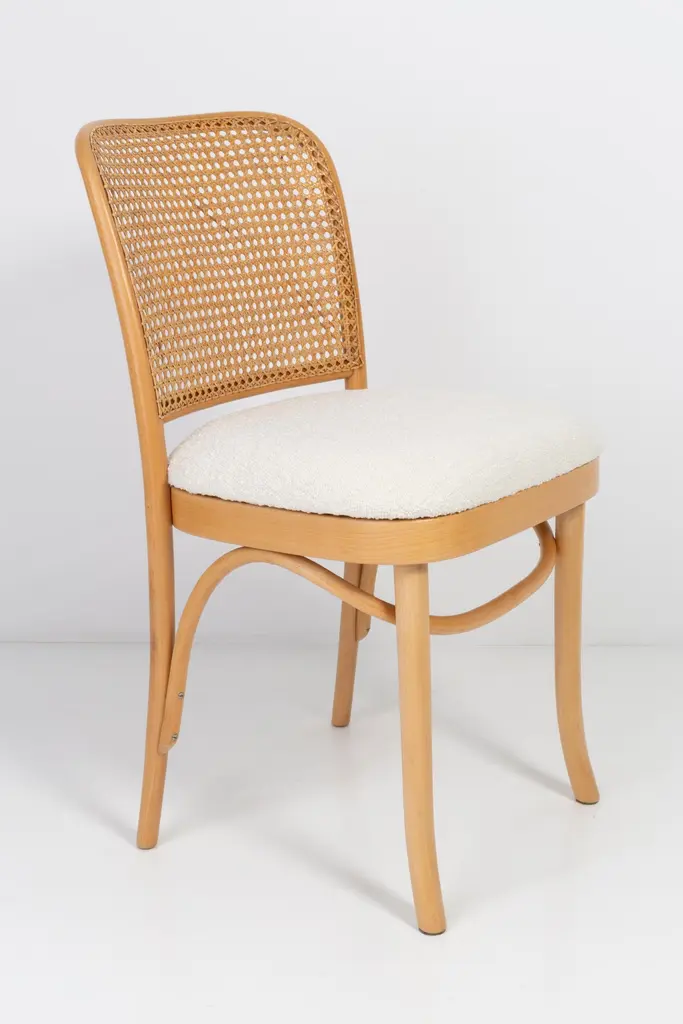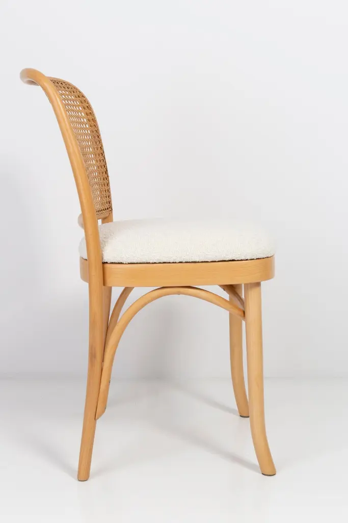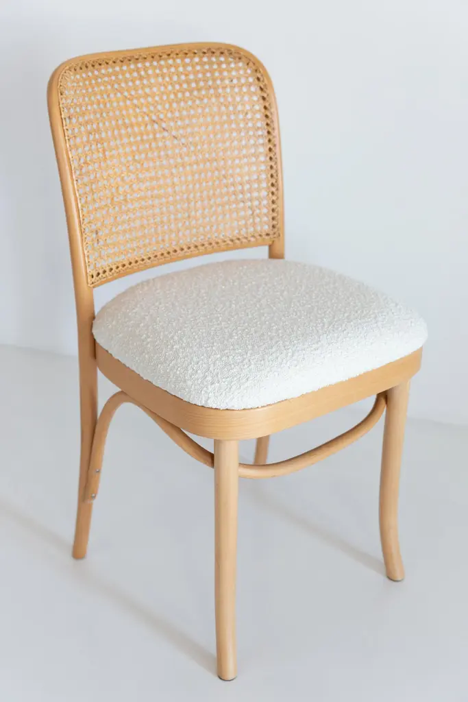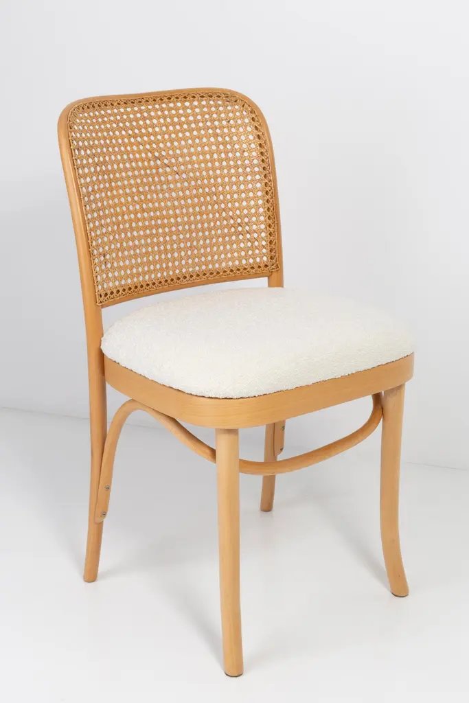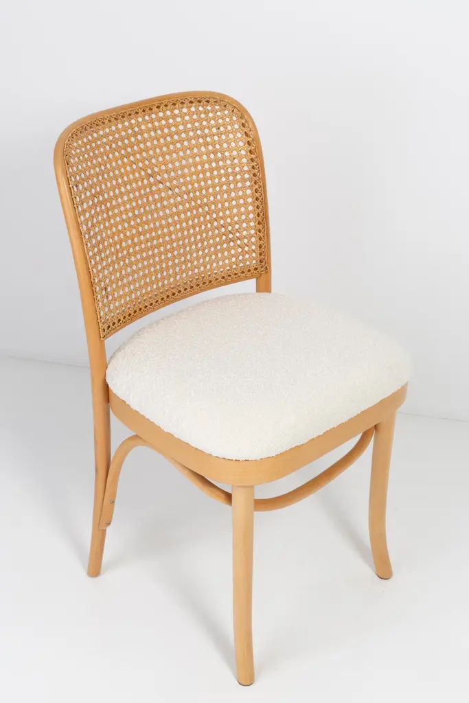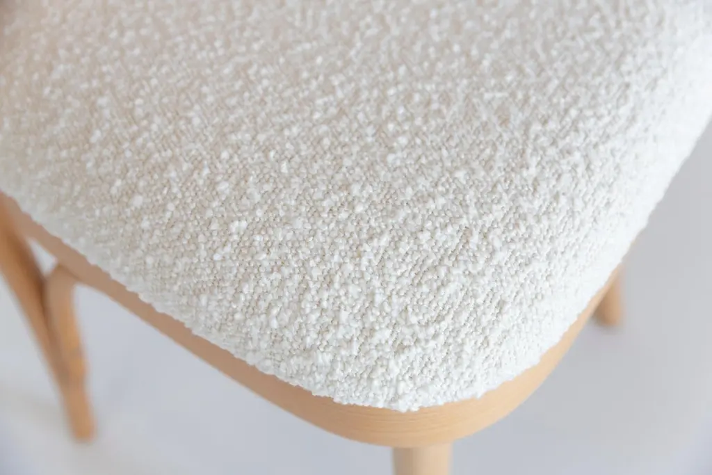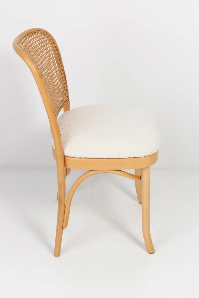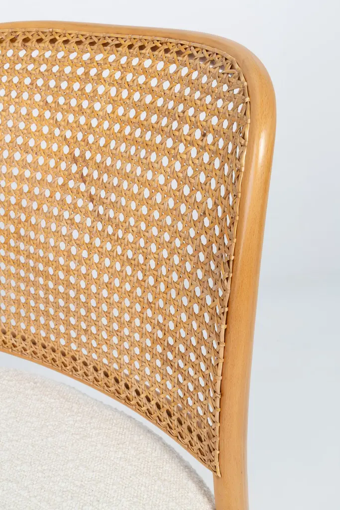 A set of 4 rattan and wood chairs. The furniture was designed by Helena and Jerzy Kurmanowicz. They were produced in Thonet Woodworking Factory and we thoroughly renovated them. The construction is made of beechwood dyed with water stain light brown. The chairs are protected with acrylic varnish with a satin glow. The upholstery fabric was produced in the clean boo technology and has water-repellent properties. This means that the fabric limits the absorption of liquids. Spilled liquid on the surface will form balls. The chairs have undergone a complete carpentry and upholstery renovation. Seats covered with high-quality white boucle fabric. Abrasion Resistance Category A (60,000 cycles). We can prepare also bigger sets 2, 6, 8 or more chairs in different wood and boucle color. Rattan is refreshed and is in perfect condition.