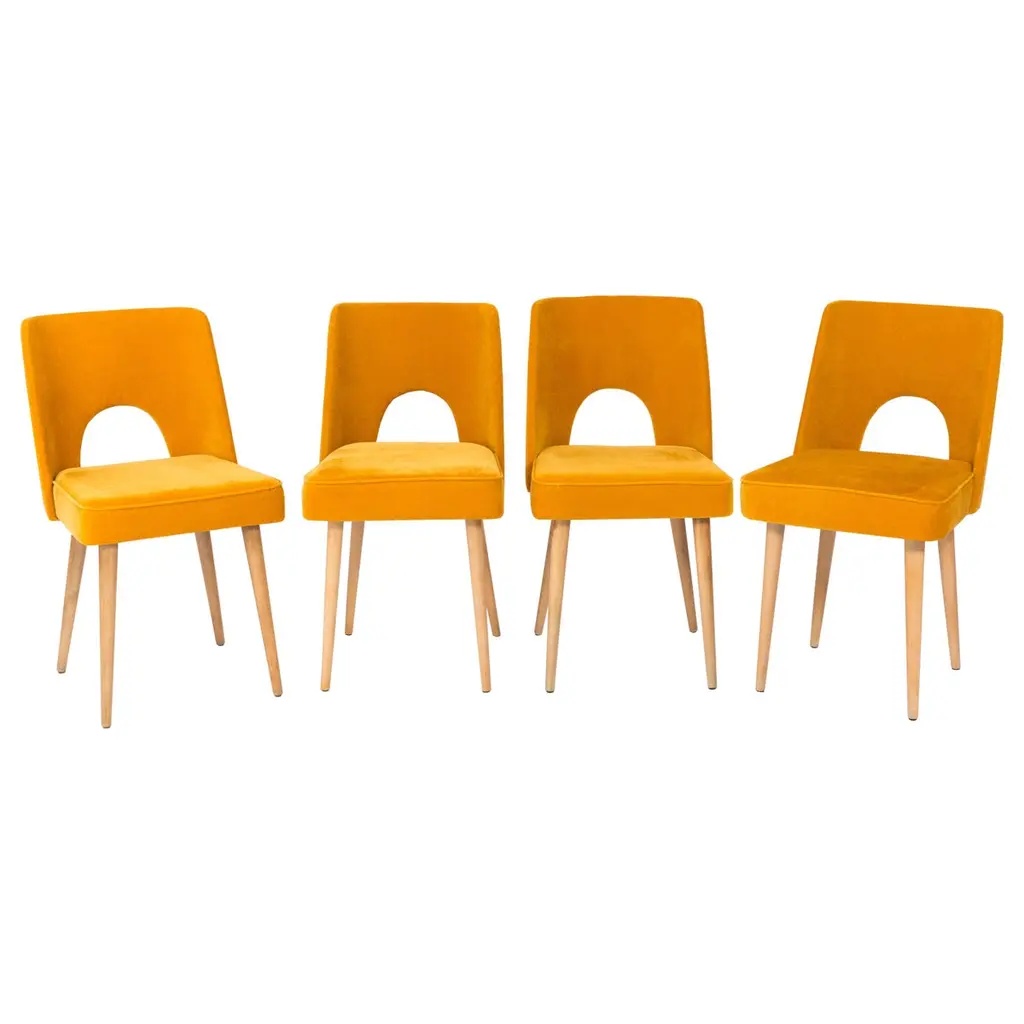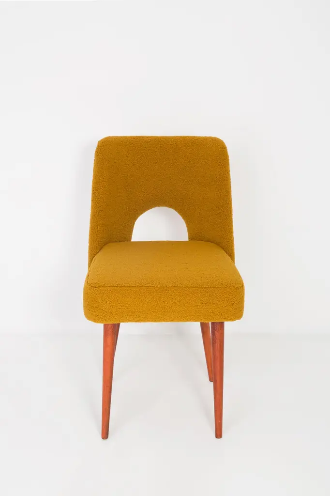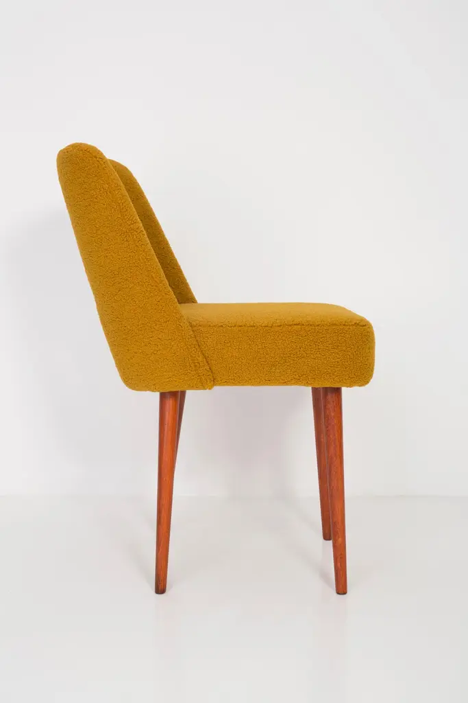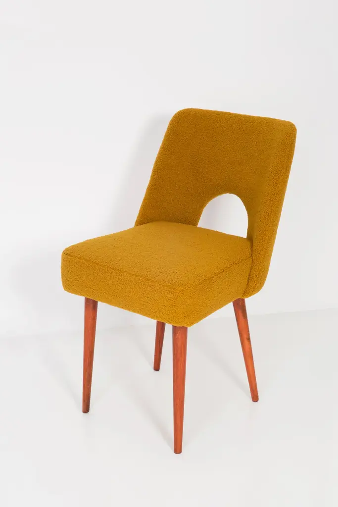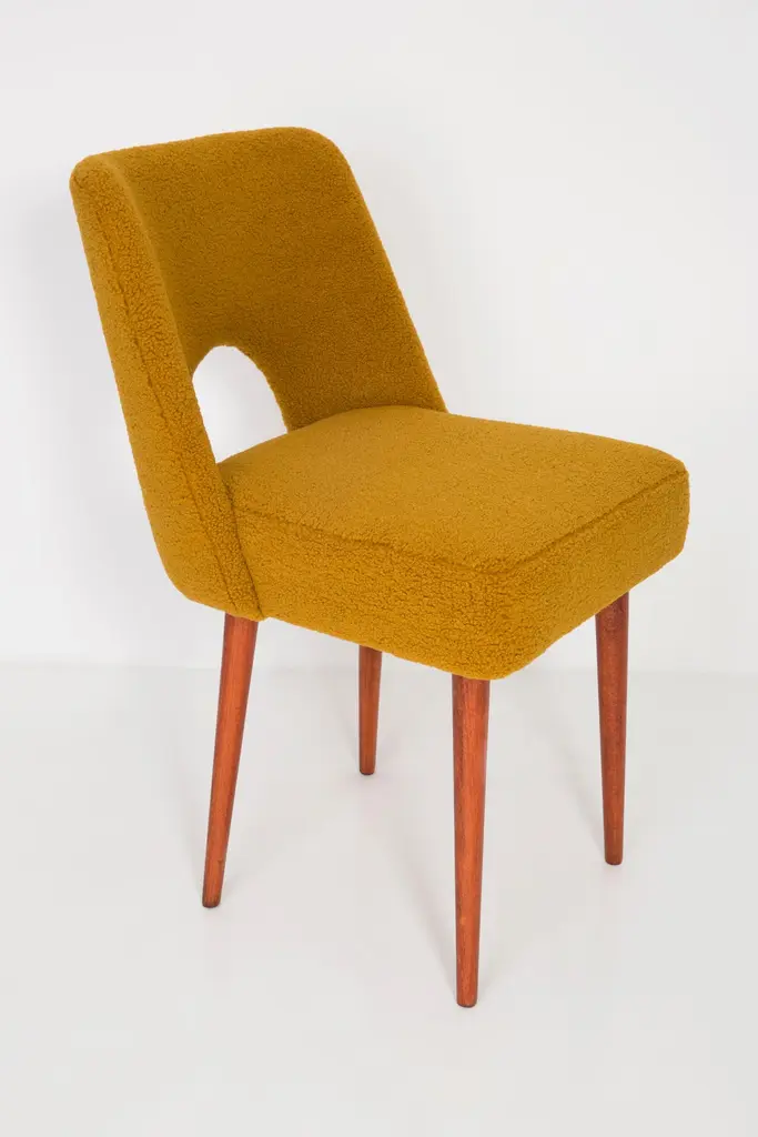 Four beautiful chairs type 1020 colloquially called "shells" produced by the Slupsk centre of furniture industry in the 1960s in Poland. They are after full renovation upholstery and carpentry. Seat and back is dressed in yellow ochre, durable and pleasant to the touch bouclé fabric (sample color nr 05). Wood was cleaned and varnished in teak wood color. We can prepare this set in every color of wood and fabric also in smaller or bigger sets. Please check the last picture with bouclé color samples.