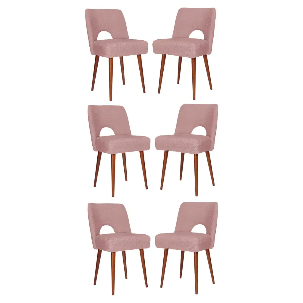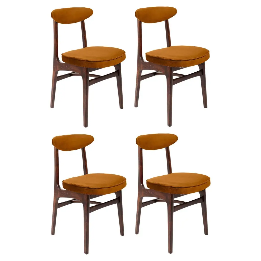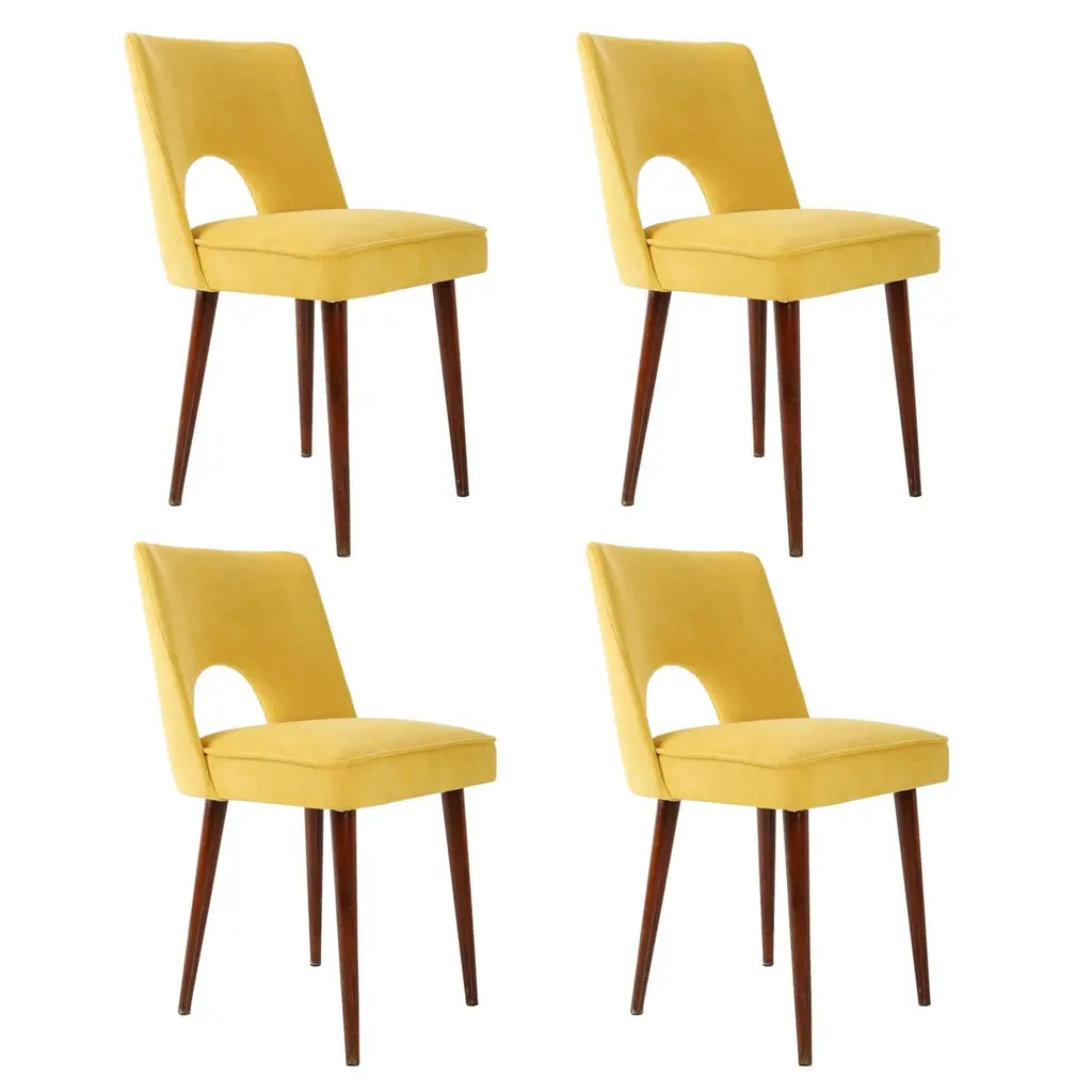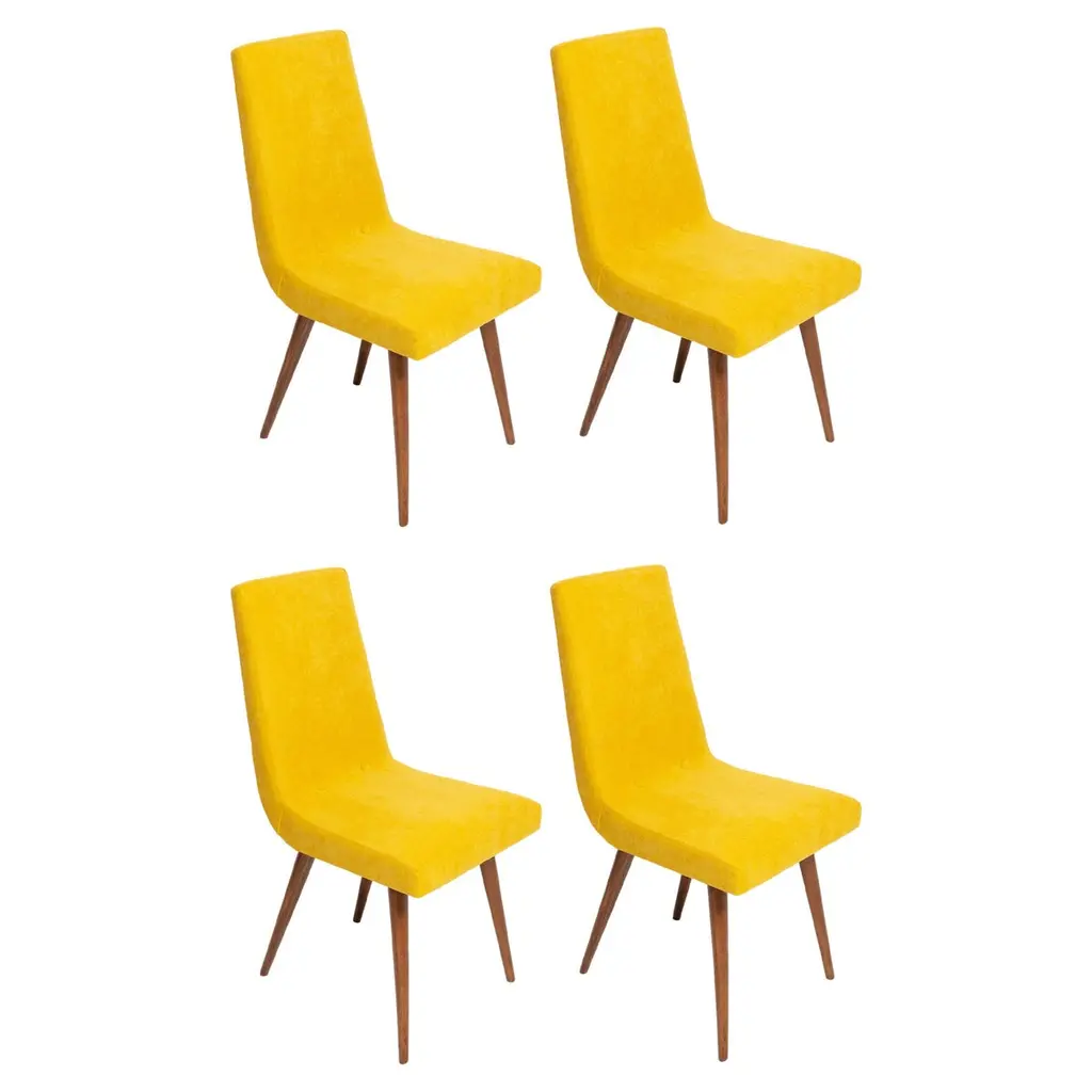 Four beautiful chairs type 1020 colloquially called "shells" produced by the Slupsk centre of furniture industry in the 1960s in Poland. They are after full renovation upholstery and carpentry. Seat and back is dressed in yellow ochre, durable and pleasant to the touch bouclé fabric (sample color nr 05). Wood was cleaned and varnished in teak wood color. We can prepare this set in every color of wood and fabric also in smaller or bigger sets. Please check the last picture with bouclé color samples.