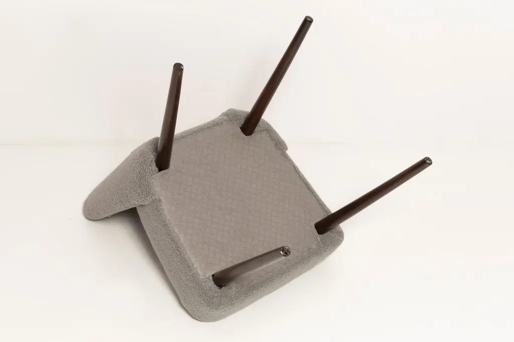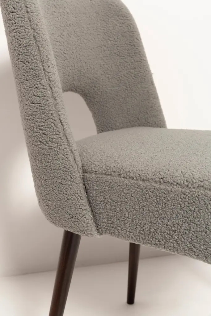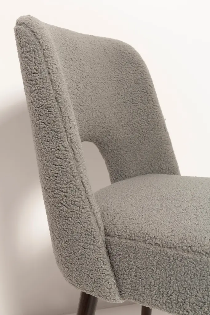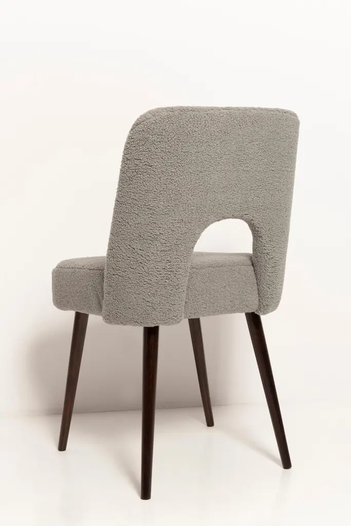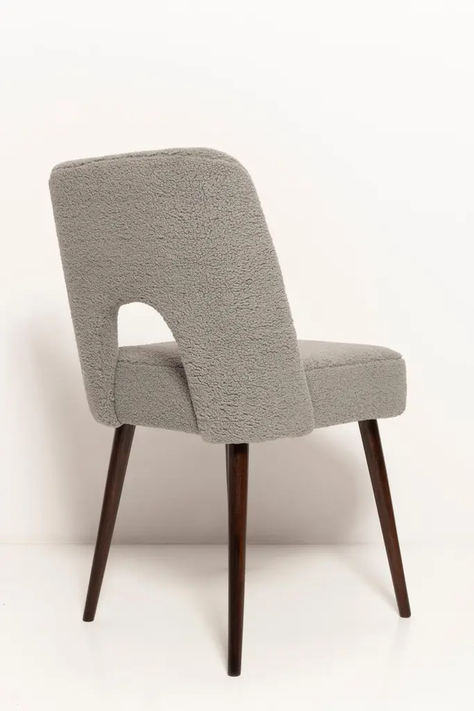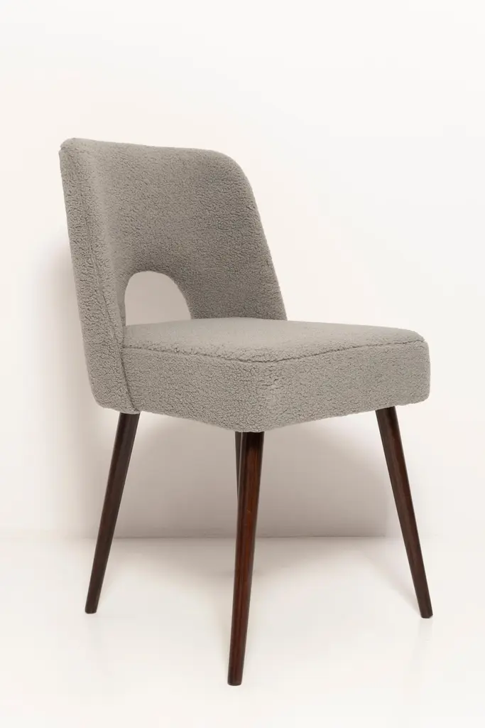 Set of Seven beautiful chairs type 1020 colloquially called "shell" produced by the Slupsk centre of furniture industry in the 1960s in Poland. They are after full renovation upholstery and carpentry. Seat and back is dressed in gray (number 06), durable and pleasant to the touch italian bouclé fabric. We can prepare this chairs in every color of wood and fabric also in bigger sets. Please check the last picture with boucle color samples.