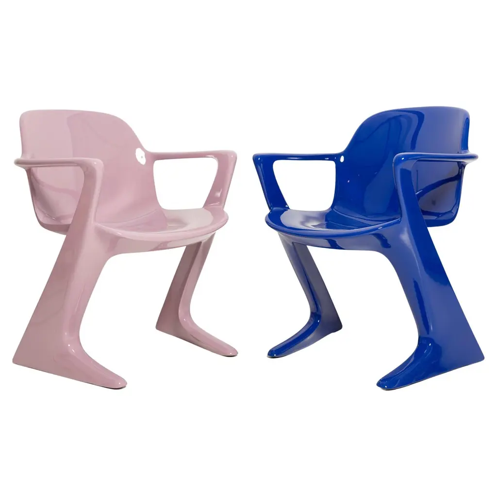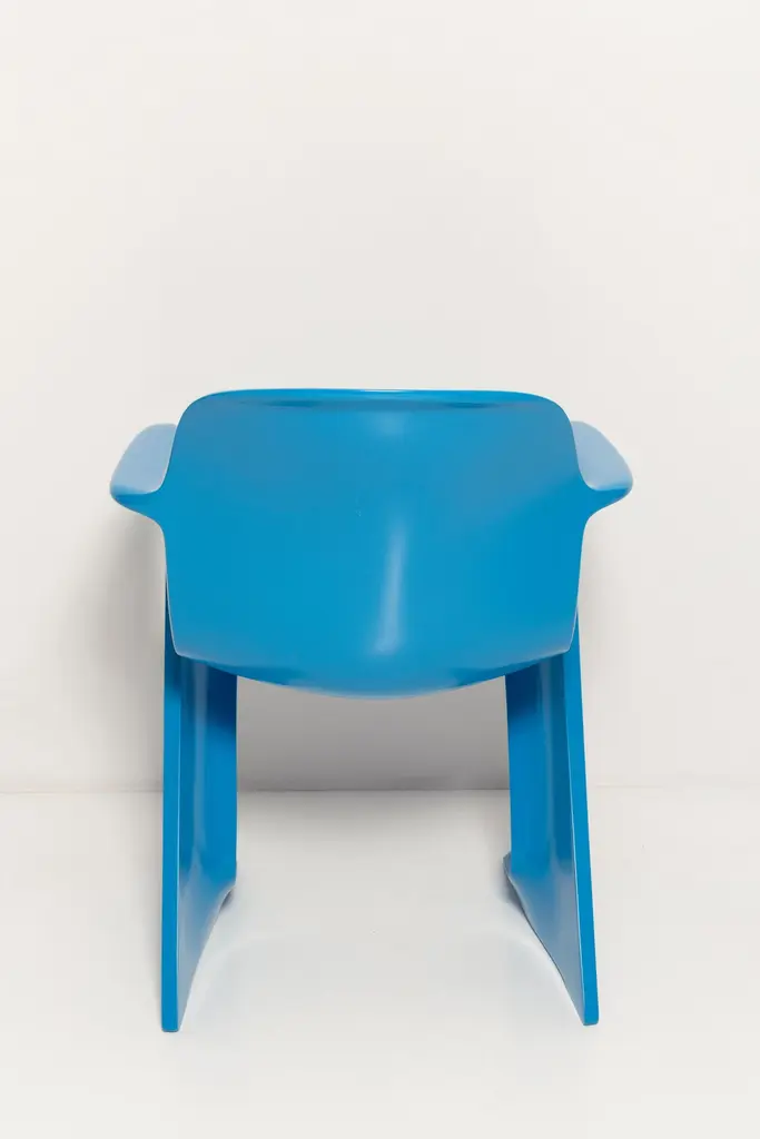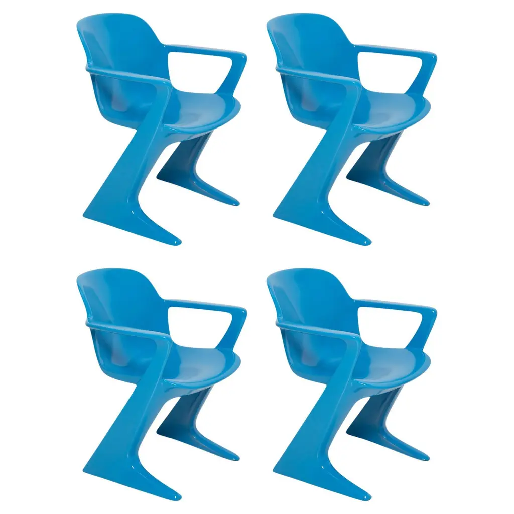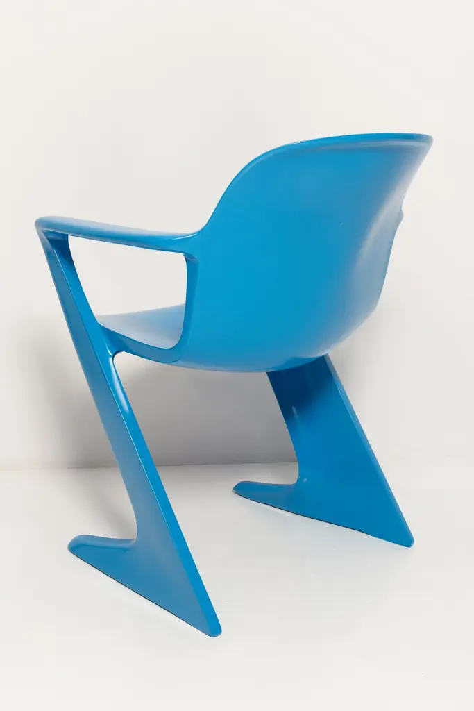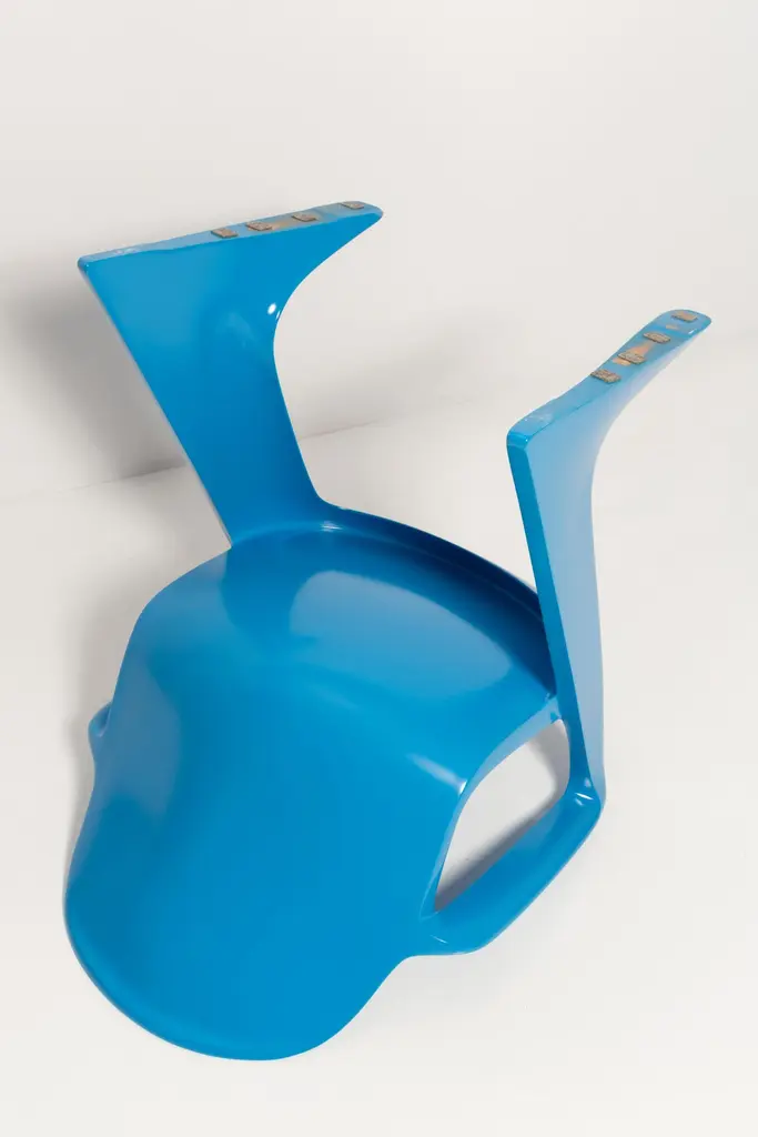 This model is called Z-chair. Designed in 1968 in the GDR by Ernst Moeckl and Siegfried Mehl, German Version of the Panton chair. Also called kangoroo chair or variopur chair. Produced in eastern Germany.Chairs are after renovation - new semi glossy blue color lacquer. Timeless form of the chair make them more unique. Extremely stabile and comfortable! Only one set available. We can prepare them also in another RAL/Pantone color.