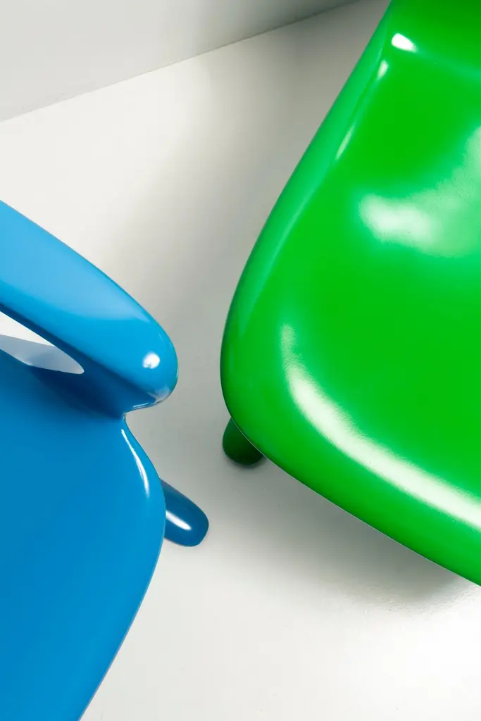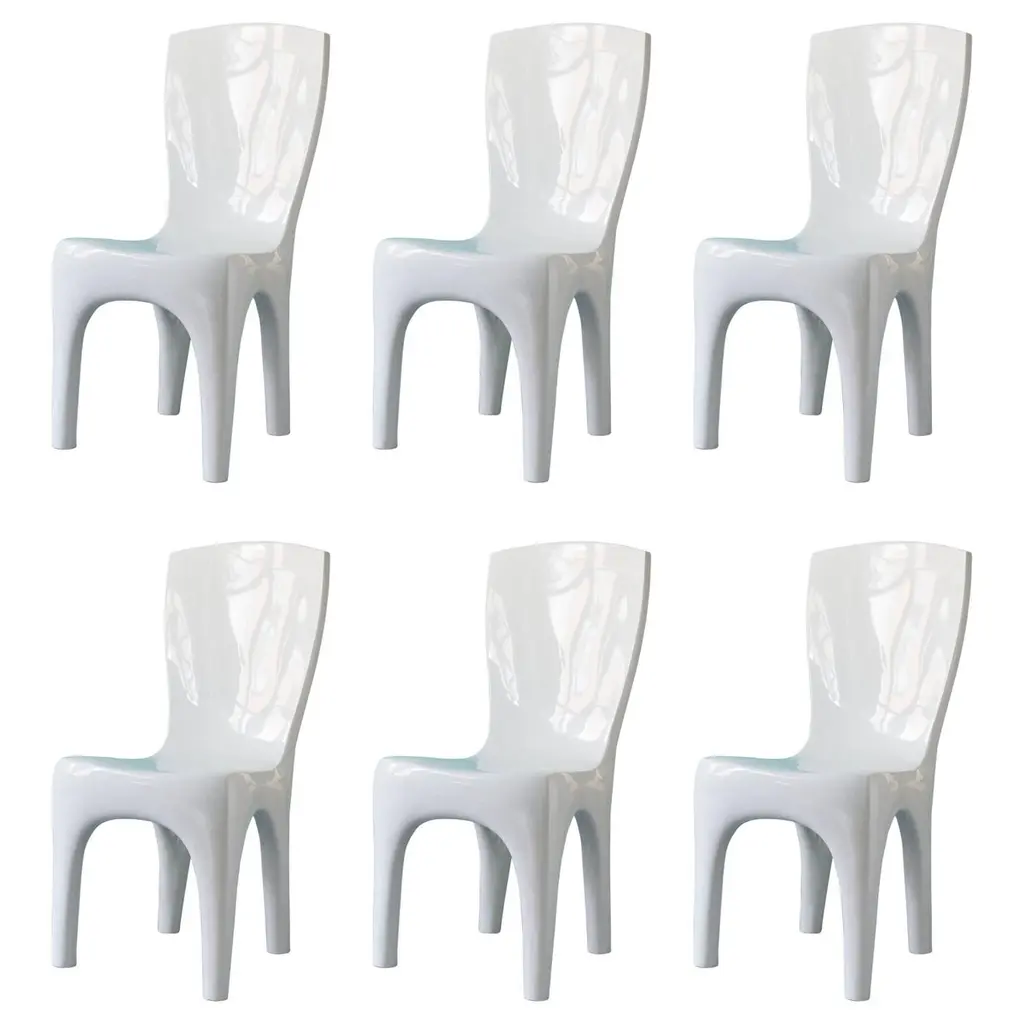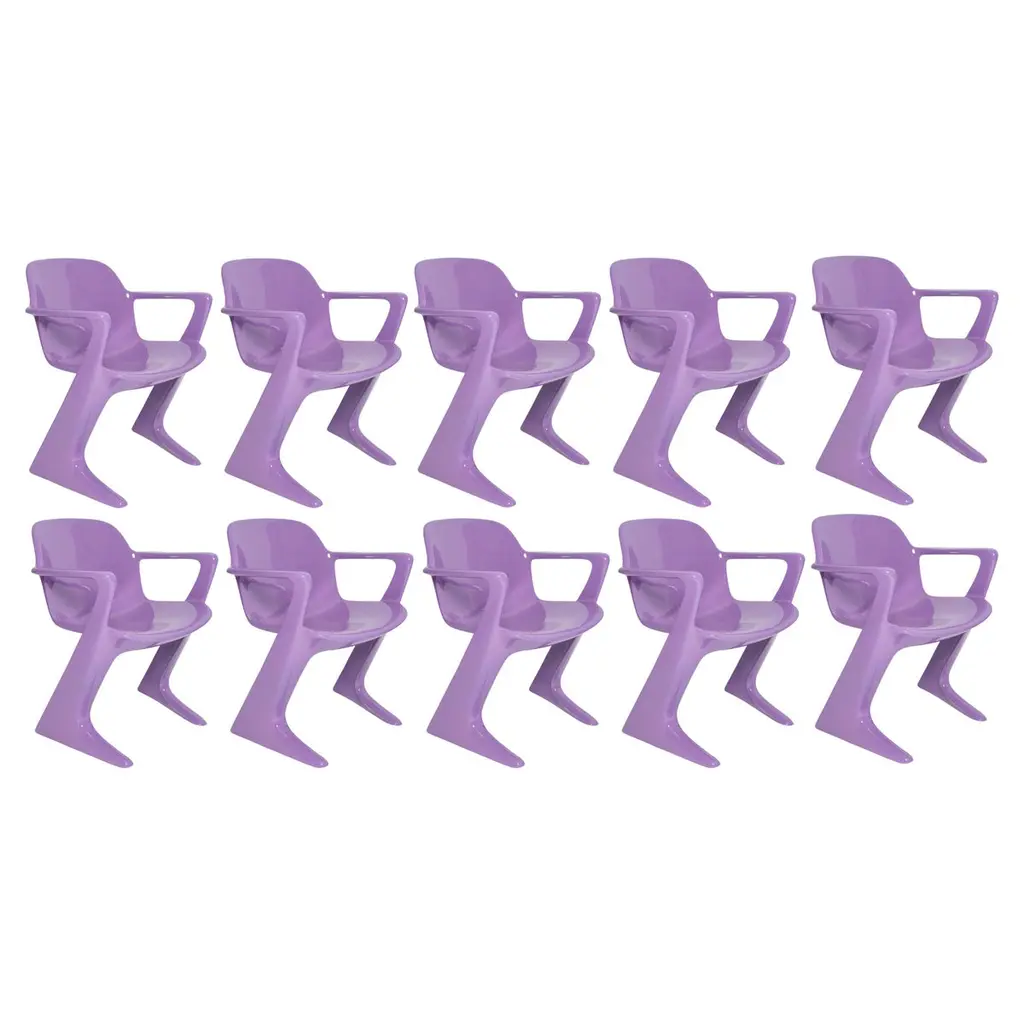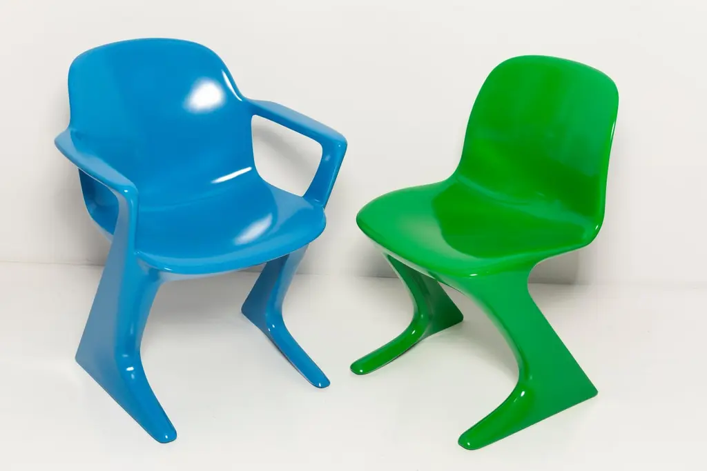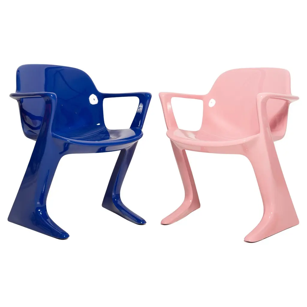 This model is called Z-chair. Designed in 1968 in the GDR by Ernst Moeckl and Siegfried Mehl, German Version of the Panton chair. Also called kangoroo chair or variopur chair. Produced in eastern Germany.Chairs are after renovation - new semi glossy blue color lacquer. Timeless form of the chair make them more unique. Extremely stabile and comfortable! Only one set available. We can prepare them also in another RAL/Pantone color.
