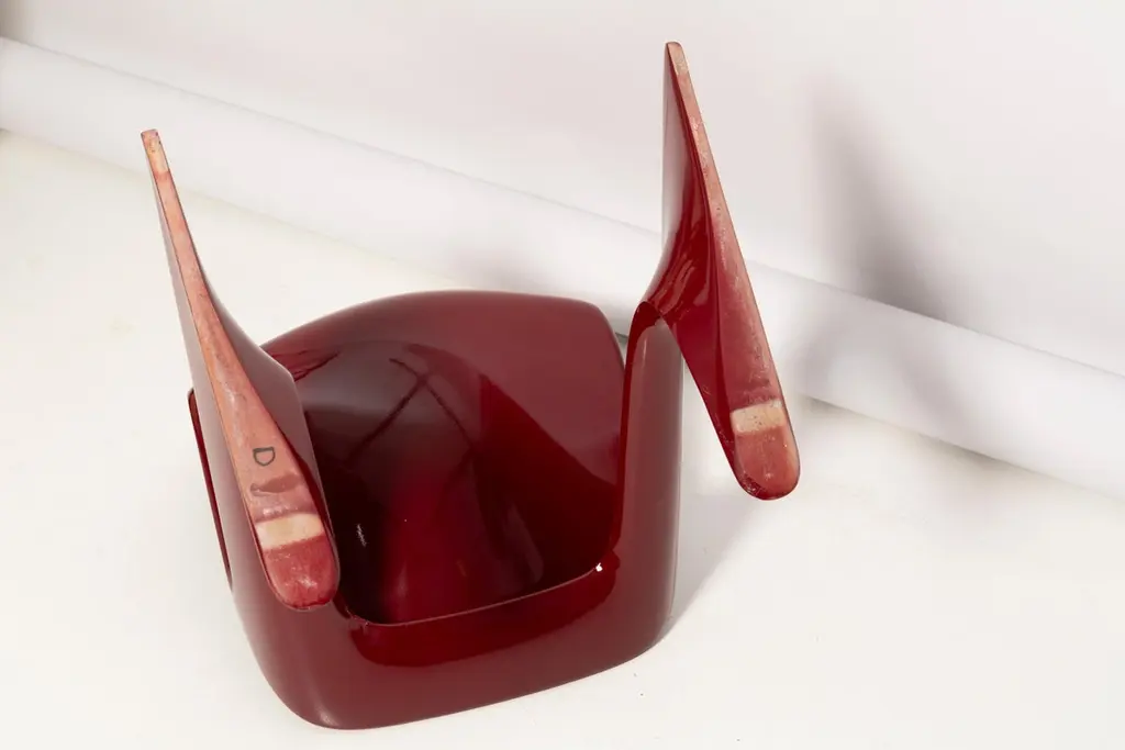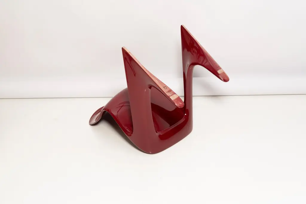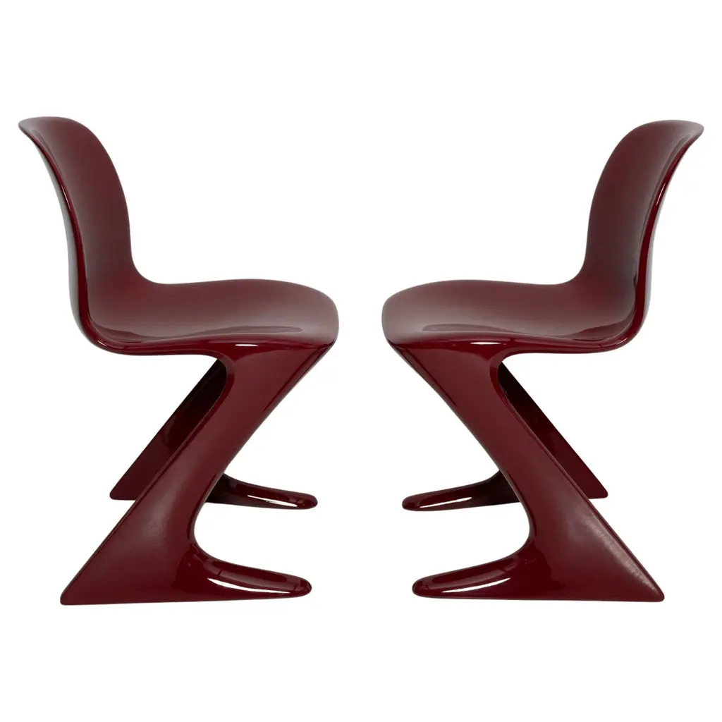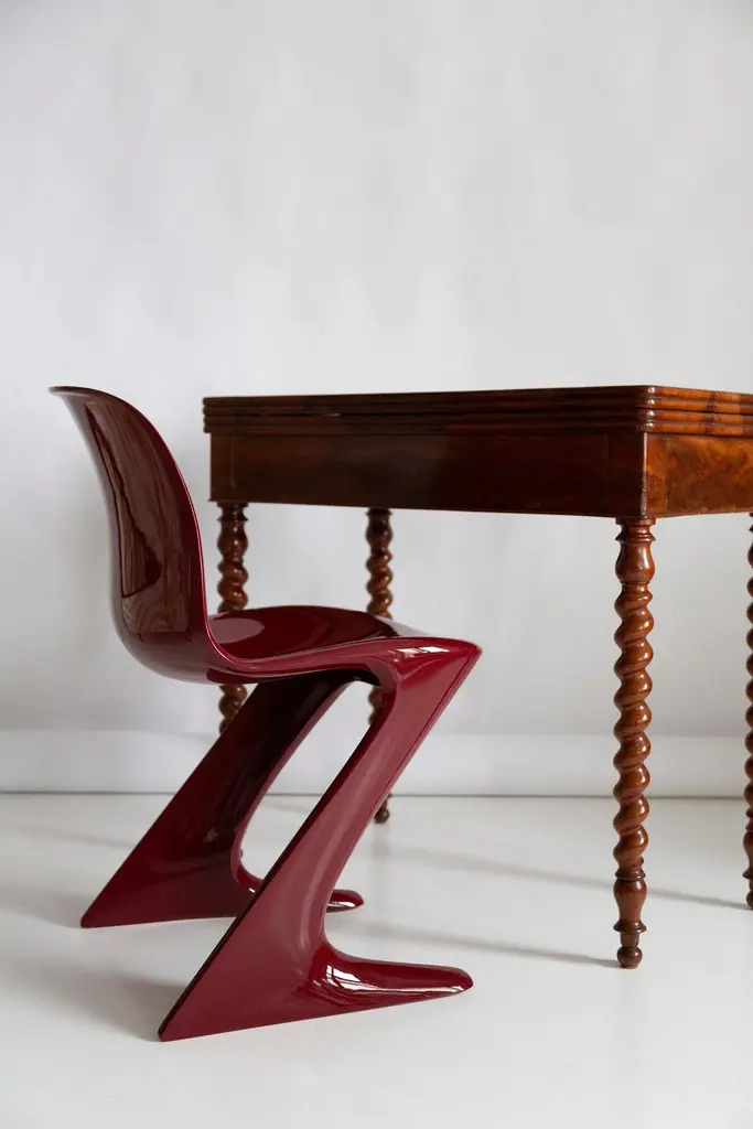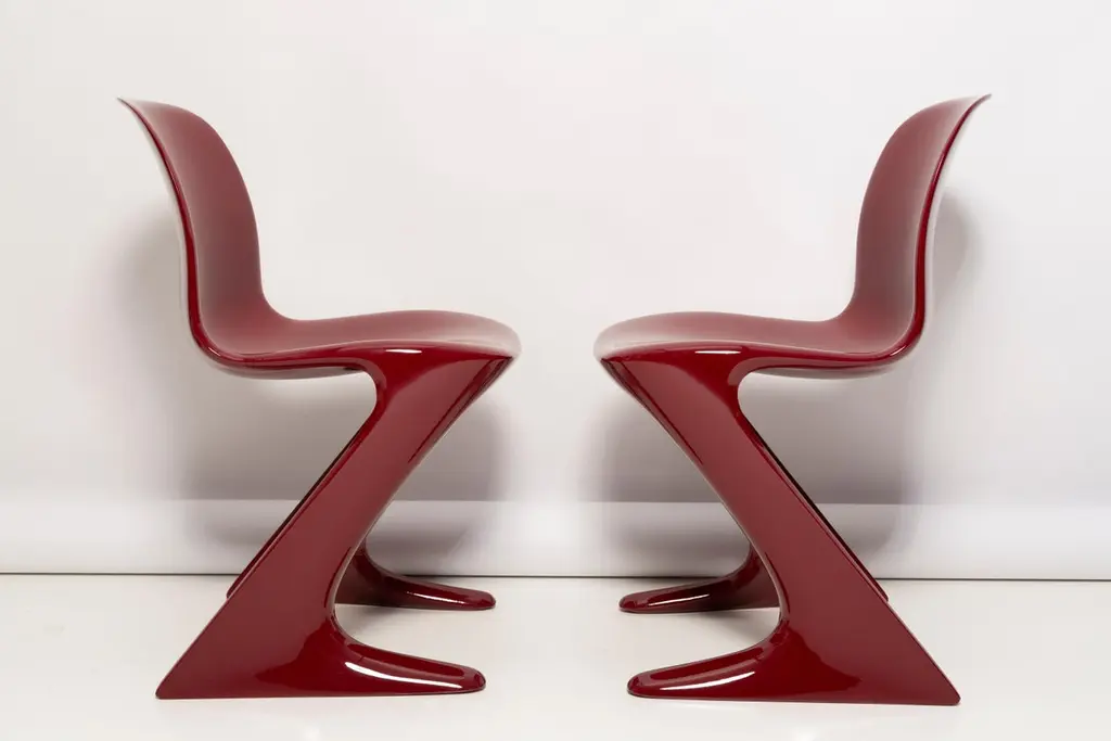 This model is called Z-chair. Designed in 1968 in the GDR by Ernst Moeckl and Siegfried Mehl, German Version of the Panton chair. Also called kangaroo chair or variopur chair. Produced in eastern Germany.Chair is after full renovation, glossy red wine color lacquer (RAL 3005). The chair is extremely comfortable! Beautiful organic shape make them timeless and fits to every interior. We can prepare also set of 4 or 8 or more, also in another RAL/Pantone color.