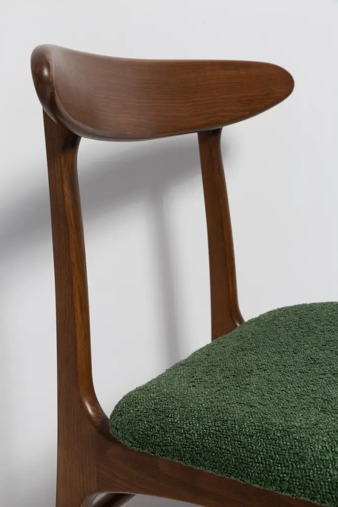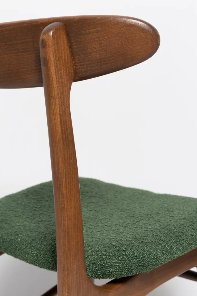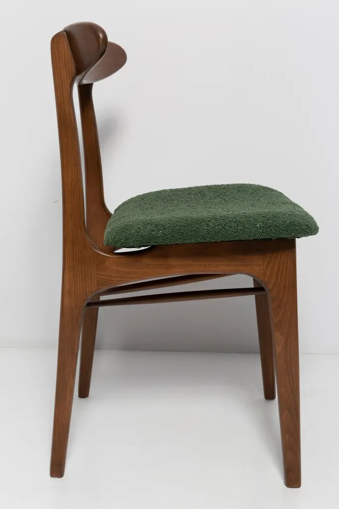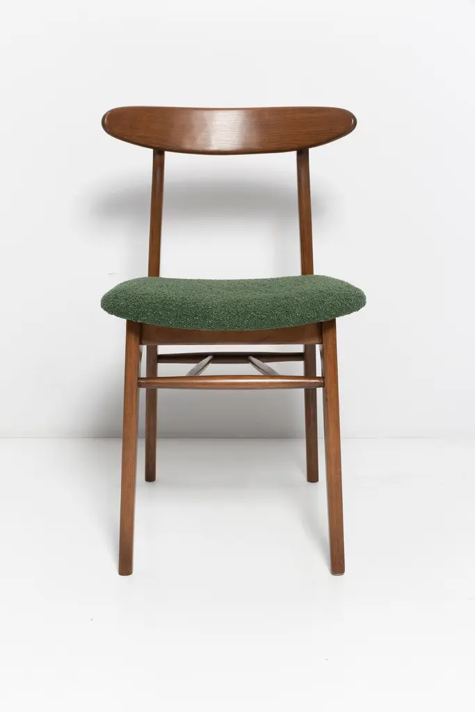 Chair designed by Prof. Rajmund Halas. Made of beechwood. Chair is after a complete upholstery renovation, the woodwork has been refreshed. Seat is dressed in green, durable and pleasant to the touch unique boucle spanish fabric. Chair is stable and very shapely. They was produced in former furniture factory in Goleniów in the 1960s. We can prepare this chair in every color of wood and fabric also in bigger sets.