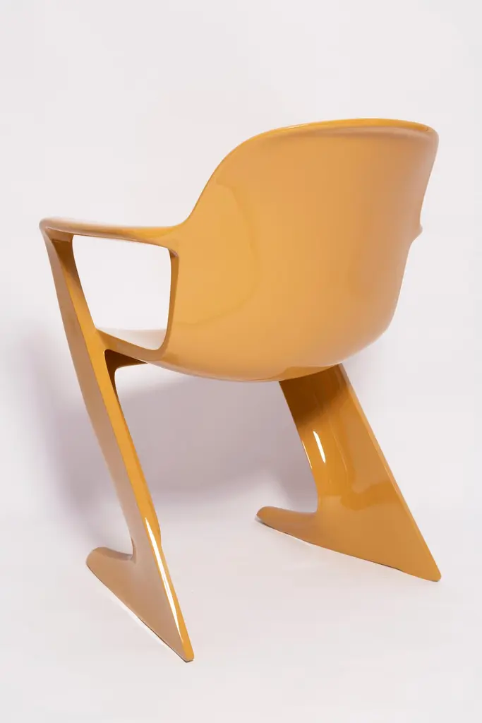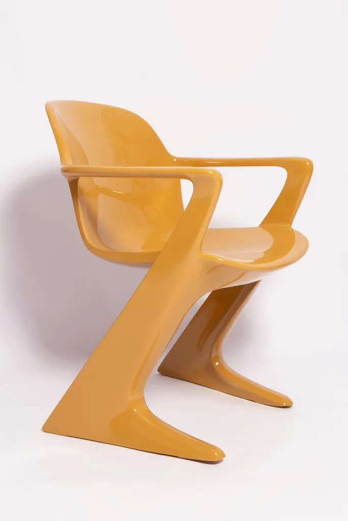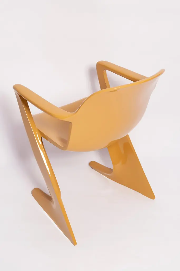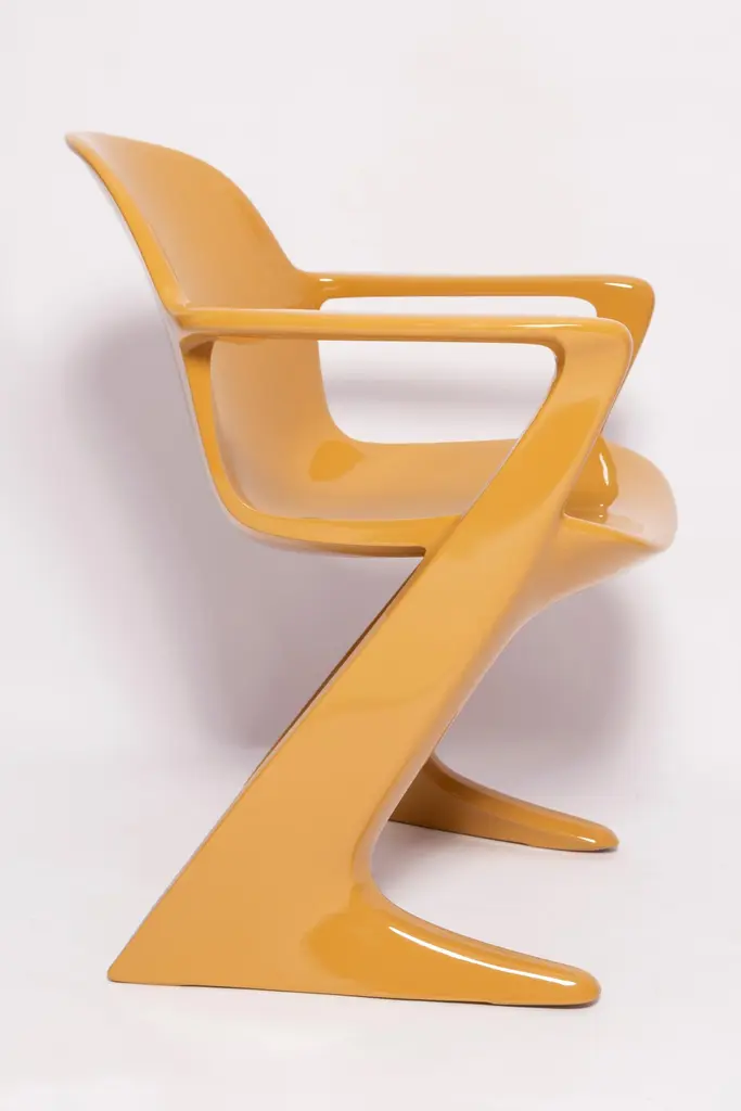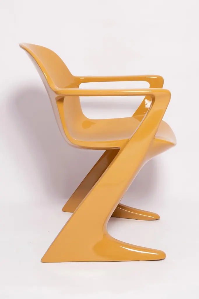 This model is called Z-chair. Designed in 1968 in the GDR by Ernst Moeckl and Siegfried Mehl, German Version of the Panton chair. Also called kangaroo chair or variopur chair. Produced in eastern Germany.The z.stuhl, designed by Ernst Moeckl (1931-2013) in the 1970s, is a cantilever chair made of polyurethane, which is available with and without armrests. In the vernacular, the chair is known by its geometry-related names such as "squatting man", "kangaroo" and "Z-chair".Chair is after full renovation, glossy sand beige color lacquer (RAL 1011). The chair is extremely comfortable! Beautiful organic shape make them timeless and fits to every interior. We can prepare also set of 2, 4 or 8 or more, also in another RAL/Pantone color.Here set of six is available.