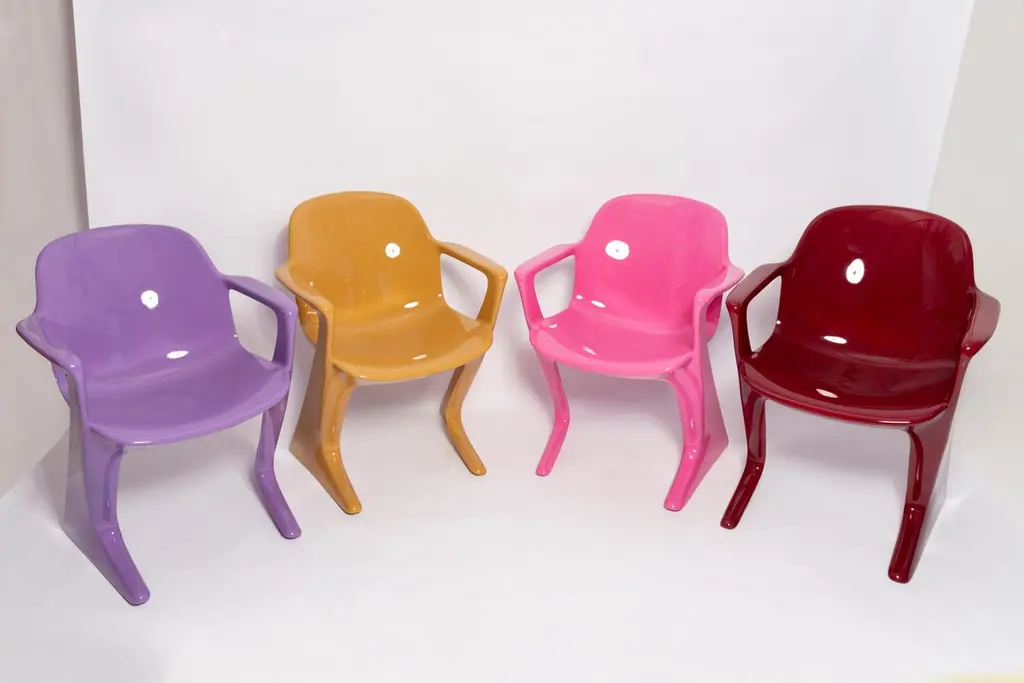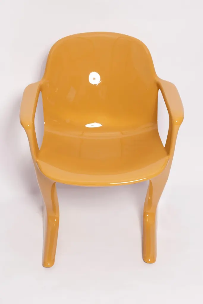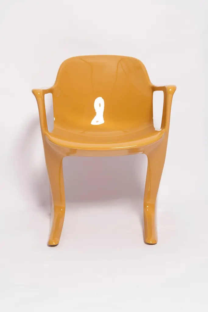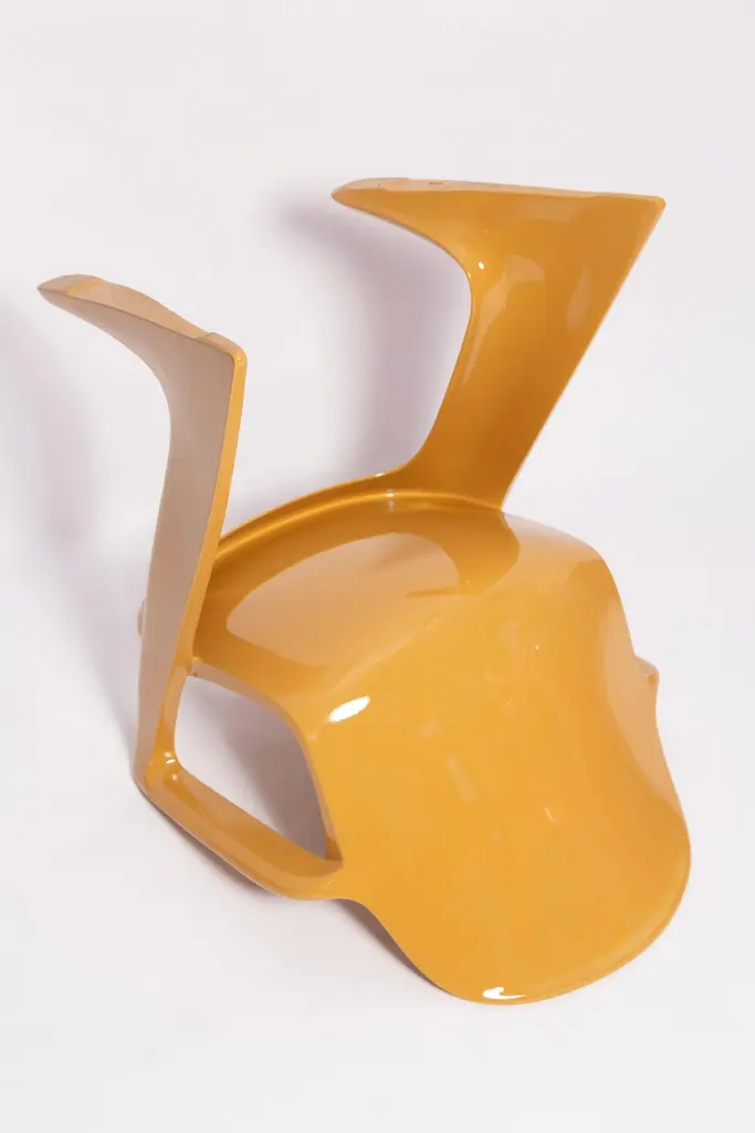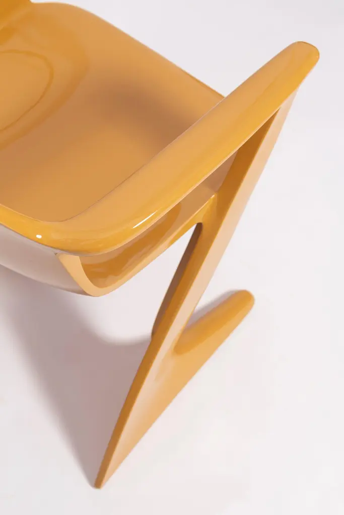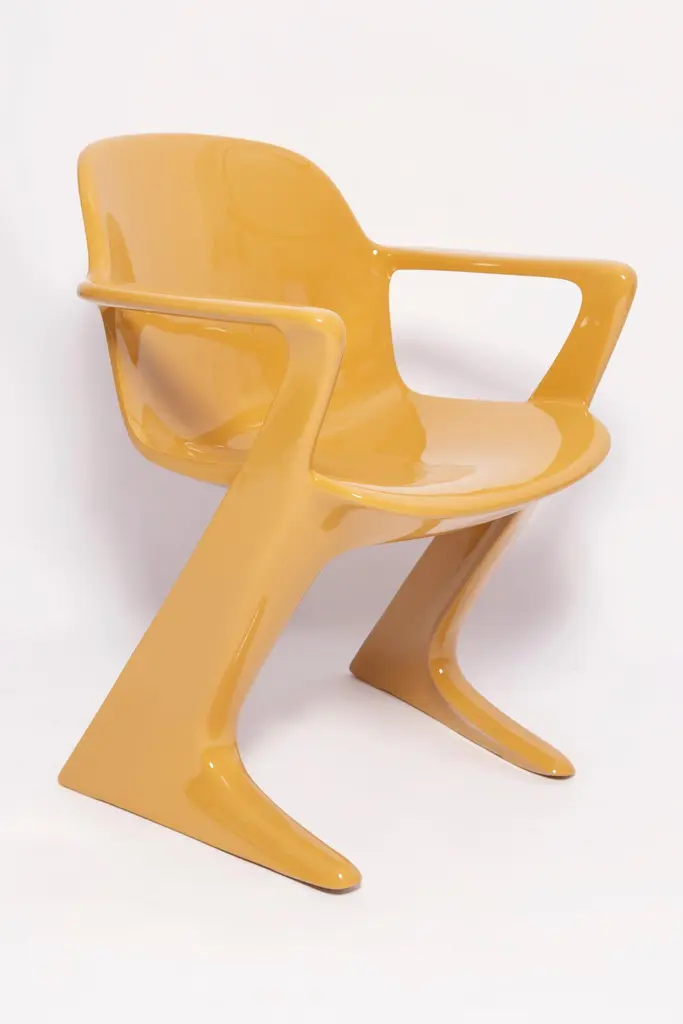 This model is called Z-chair. Designed in 1968 in the GDR by Ernst Moeckl and Siegfried Mehl, German Version of the Panton chair. Also called kangaroo chair or variopur chair. Produced in eastern Germany.The z.stuhl, designed by Ernst Moeckl (1931-2013) in the 1970s, is a cantilever chair made of polyurethane, which is available with and without armrests. In the vernacular, the chair is known by its geometry-related names such as "squatting man", "kangaroo" and "Z-chair".Chair is after full renovation, glossy sand beige color lacquer (RAL 1011). The chair is extremely comfortable! Beautiful organic shape make them timeless and fits to every interior. We can prepare also set of 2, 4 or 8 or more, also in another RAL/Pantone color.Here set of six is available.