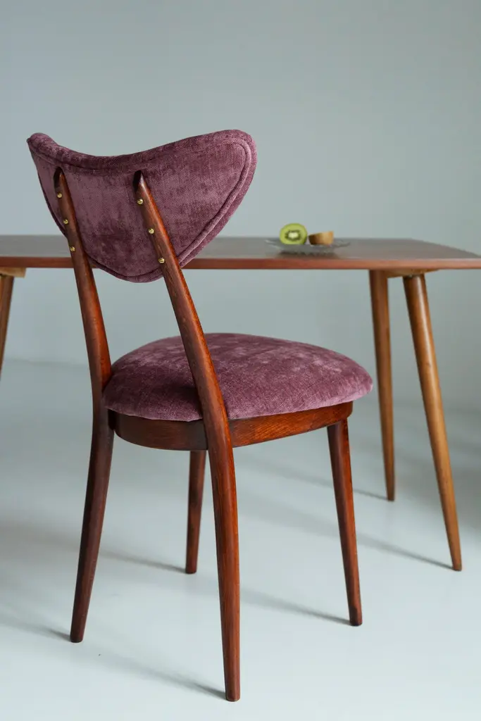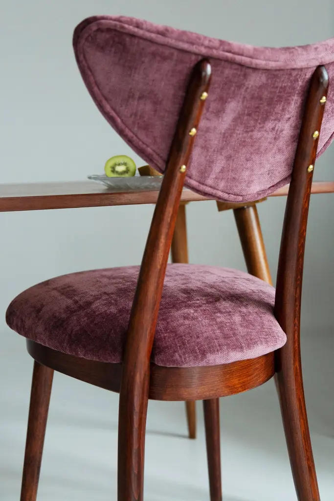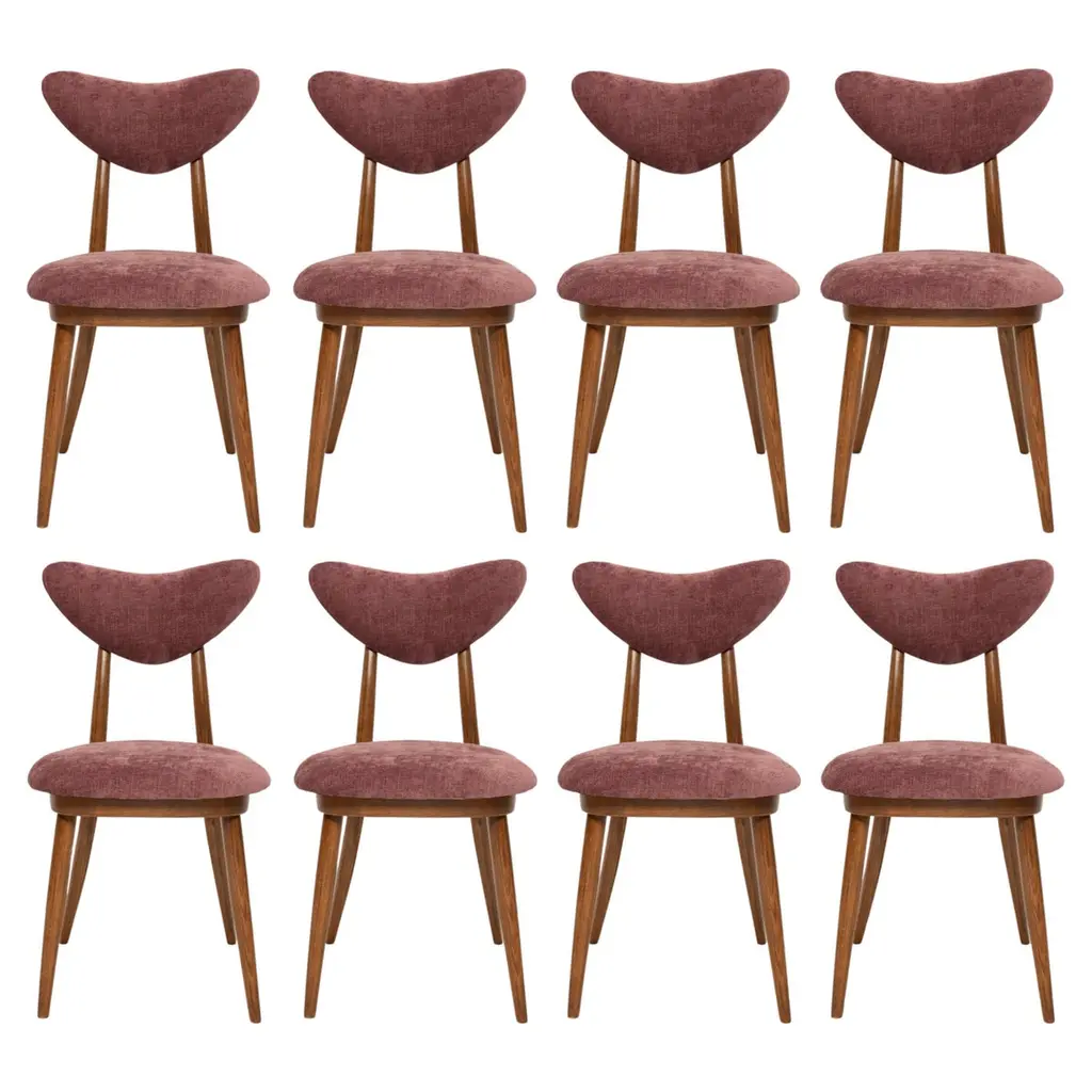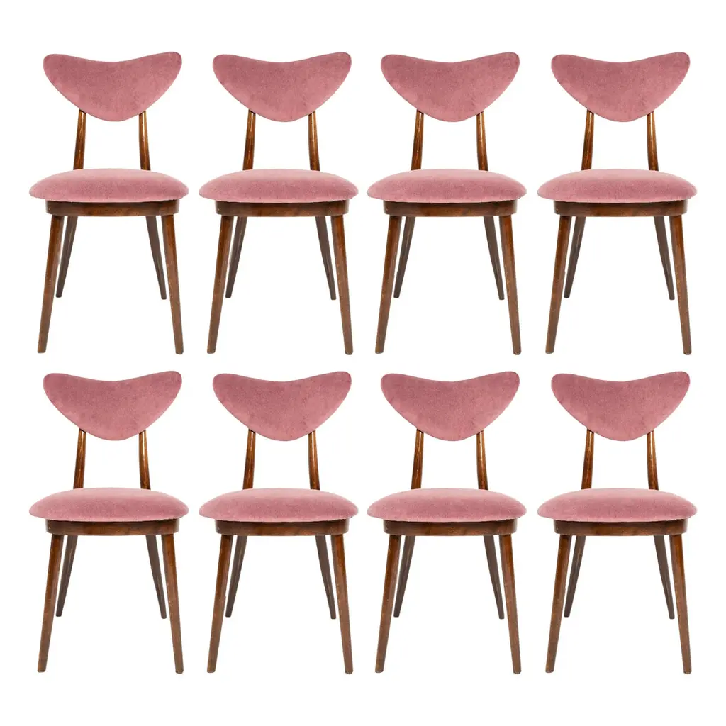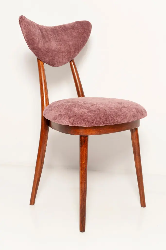 A set of six chairs type A5828. Colloquially called "heart". The furniture was designed by Helena and Jerzy Kurmanowicz. They were produced in Radomsko Woodworking Factory and we thoroughly renovated them. The construction is made of beech wood dyed with water stain brown. The chairs are protected with acrylic varnish with a satin glow. The upholstery fabric was produced in the Clean boo technology and has water-repellent properties. This means that the fabric limits the absorption of liquids. Spilled liquid on the surface will form balls. The chairs have undergone a complete carpentry and upholstery renovation. Seats covered with high-quality pink cotton-velvet fabric. ABRASION RESISTANCE Category A (50,000 cycles). This velvet is recommended for public buildings and private interiors. It has Oekotex. We confirm the flame retardancy of the fabric according to the French standard NF P 92-507, classified as M1.We can prepare also smaller or bigger sets of 2, 4, 8, 10 or more chairs in different wood and velvet color.
