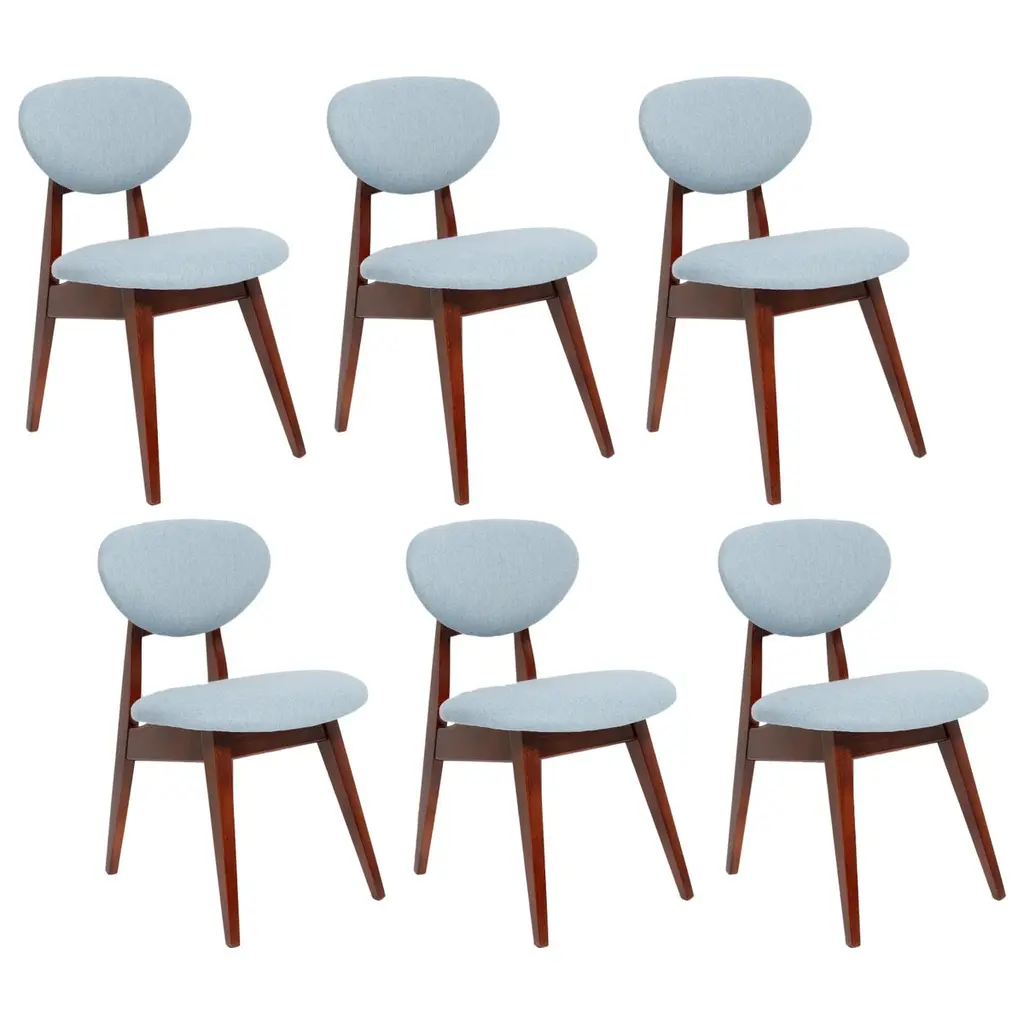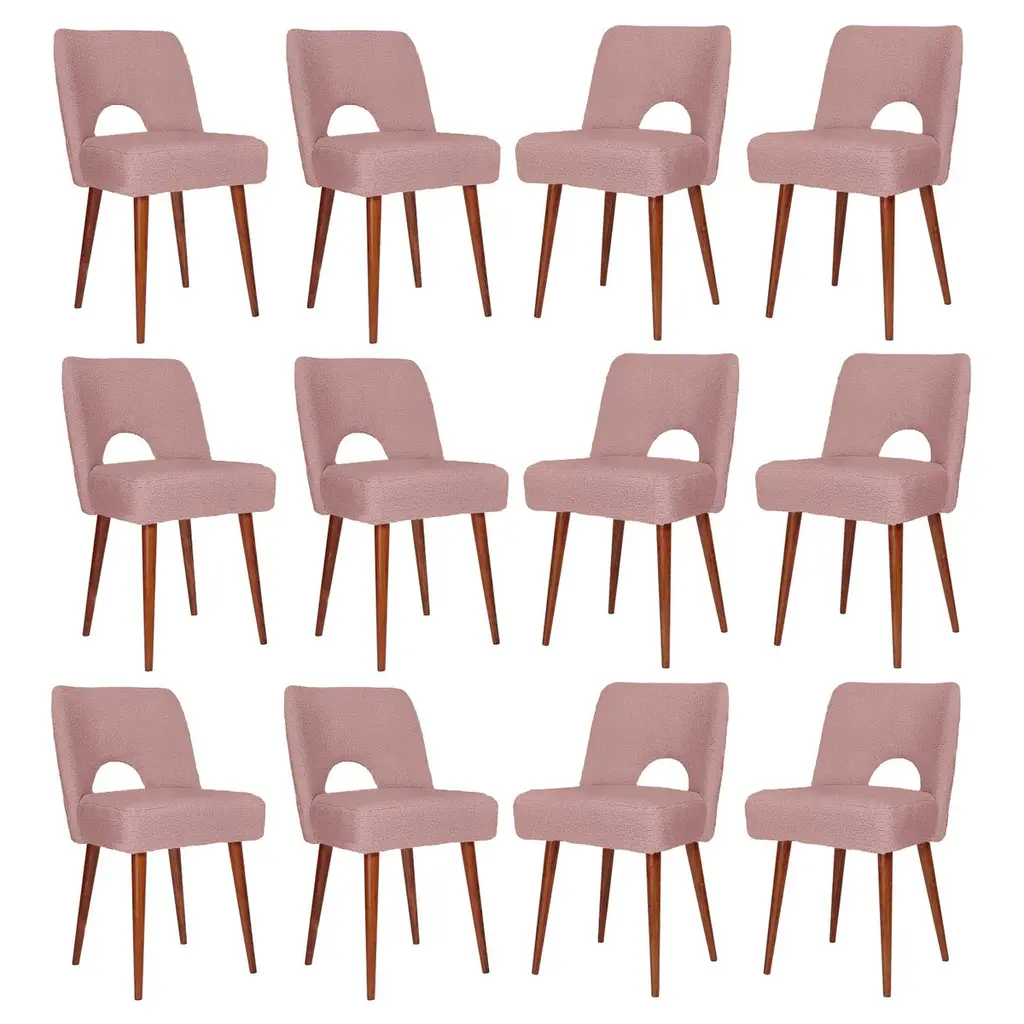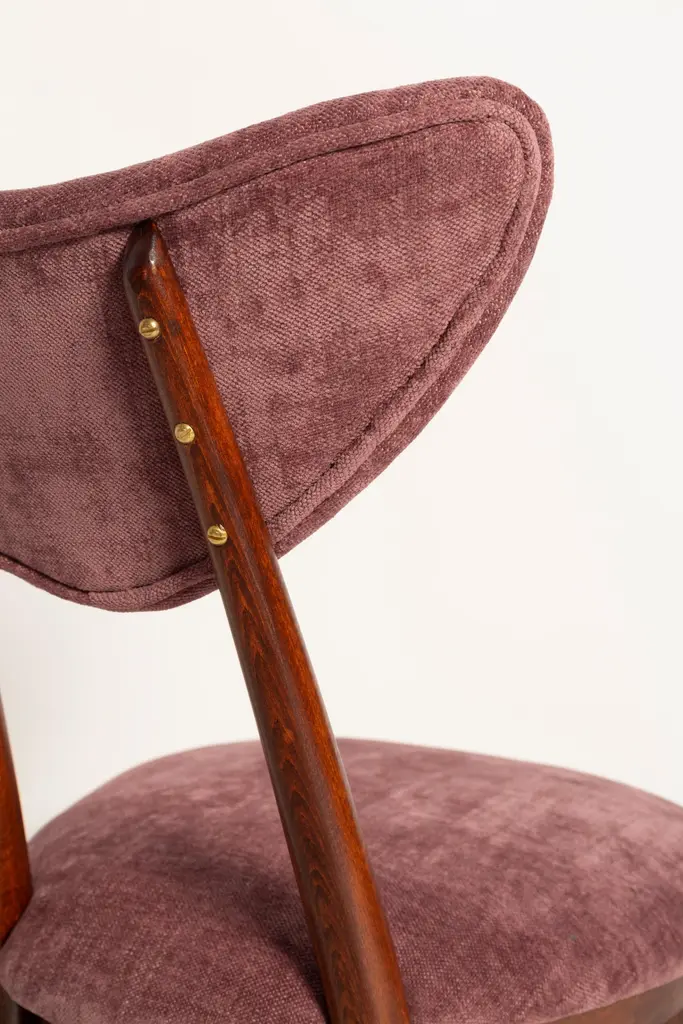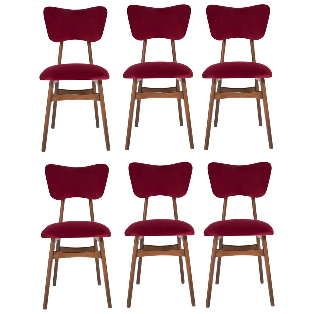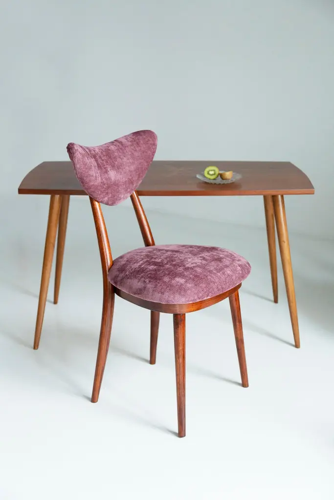 A set of six chairs type A5828. Colloquially called "heart". The furniture was designed by Helena and Jerzy Kurmanowicz. They were produced in Radomsko Woodworking Factory and we thoroughly renovated them. The construction is made of beech wood dyed with water stain brown. The chairs are protected with acrylic varnish with a satin glow. The upholstery fabric was produced in the Clean boo technology and has water-repellent properties. This means that the fabric limits the absorption of liquids. Spilled liquid on the surface will form balls. The chairs have undergone a complete carpentry and upholstery renovation. Seats covered with high-quality pink cotton-velvet fabric. ABRASION RESISTANCE Category A (50,000 cycles). This velvet is recommended for public buildings and private interiors. It has Oekotex. We confirm the flame retardancy of the fabric according to the French standard NF P 92-507, classified as M1.We can prepare also smaller or bigger sets of 2, 4, 8, 10 or more chairs in different wood and velvet color.
