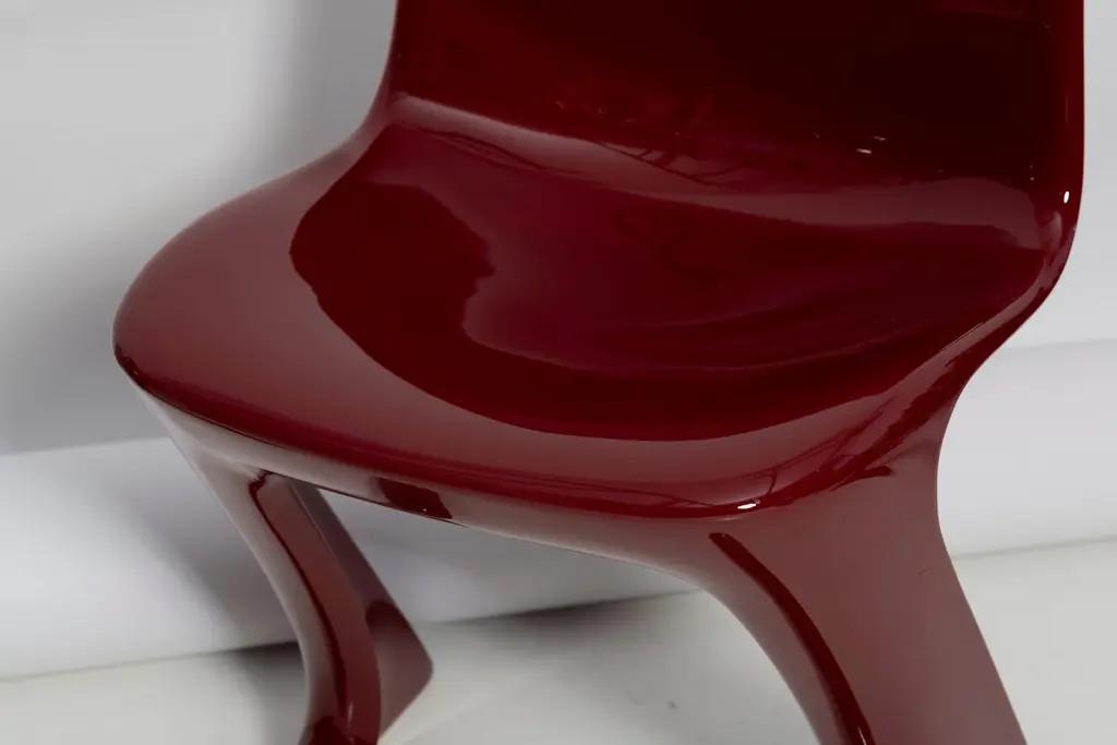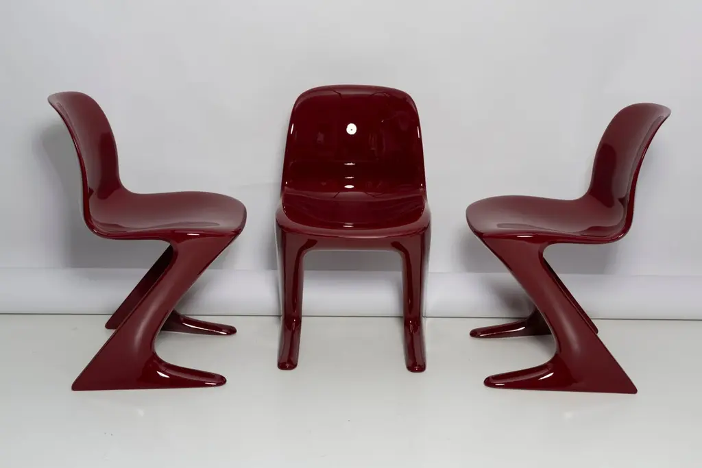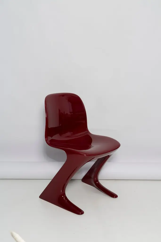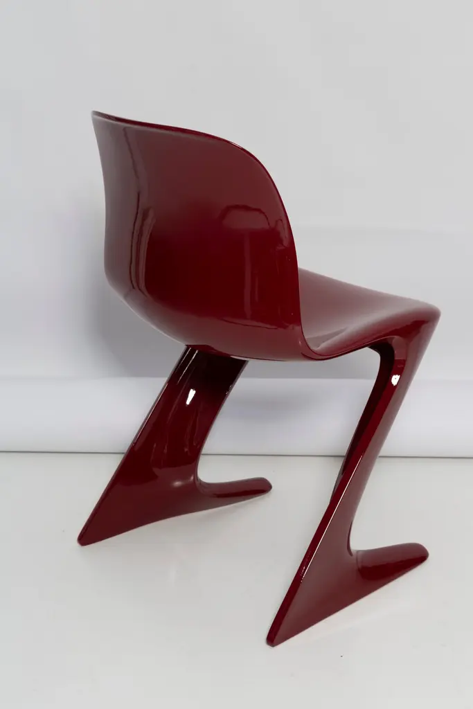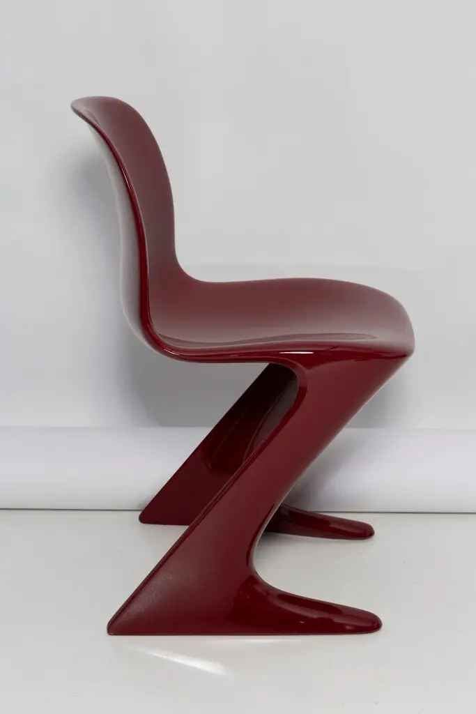 This model is called Z-chair. Designed in 1968 in the GDR by Ernst Moeckl and Siegfried Mehl, German Version of the Panton chair. Also called kangaroo chair or variopur chair. Produced in eastern Germany.Chair is after full renovation, glossy red wine color lacquer (RAL 3005). The chair is extremely comfortable! Beautiful organic shape make them timeless and fits to every interior. We can prepare also set of 4 or 8 or more, also in another RAL/Pantone color.