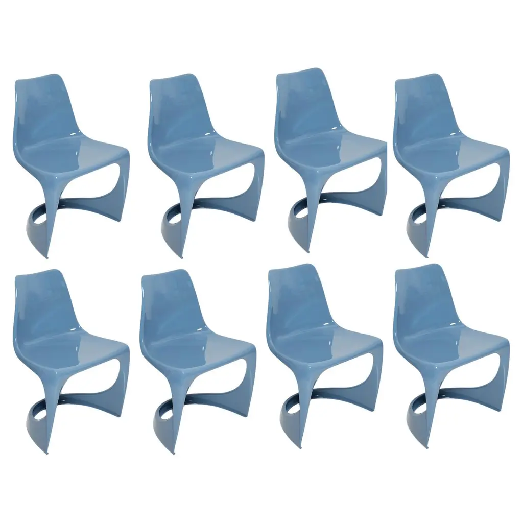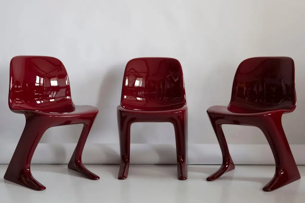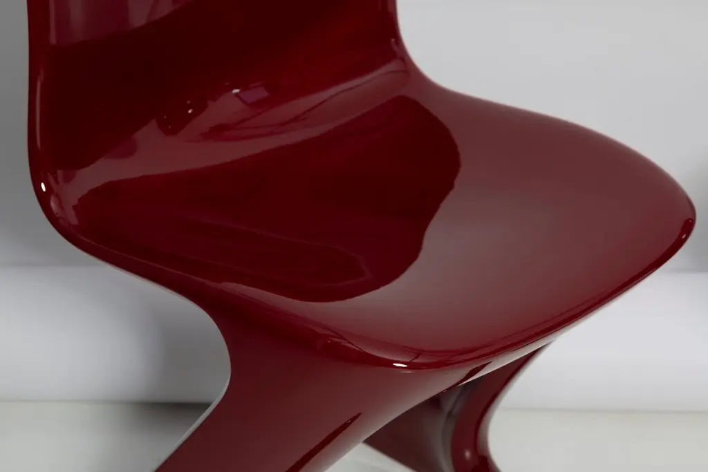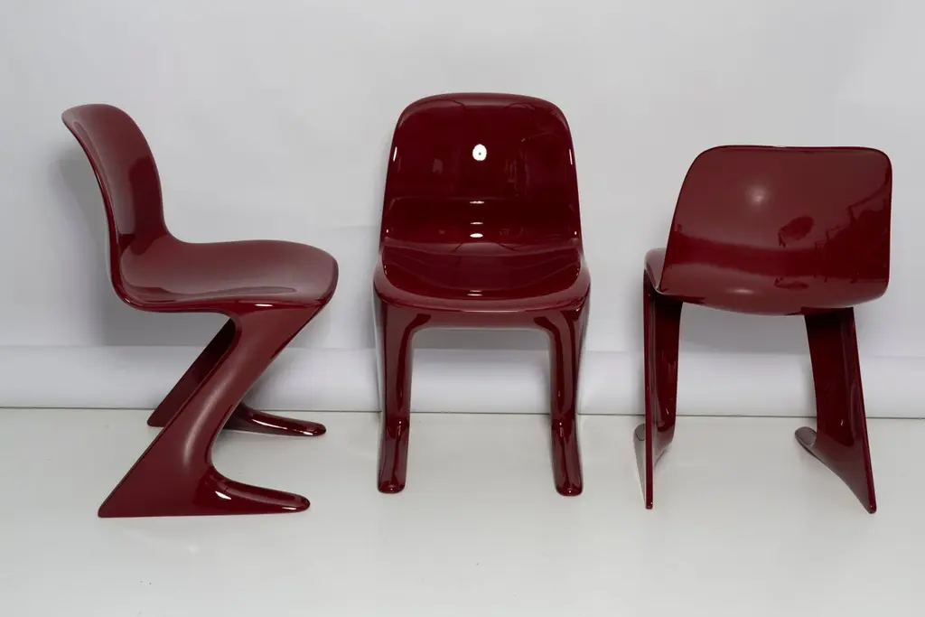 This model is called Z-chair. Designed in 1968 in the GDR by Ernst Moeckl and Siegfried Mehl, German Version of the Panton chair. Also called kangaroo chair or variopur chair. Produced in eastern Germany.Chair is after full renovation, glossy red wine color lacquer (RAL 3005). The chair is extremely comfortable! Beautiful organic shape make them timeless and fits to every interior. We can prepare also set of 4 or 8 or more, also in another RAL/Pantone color.