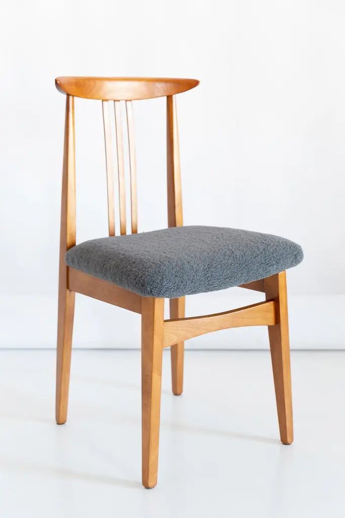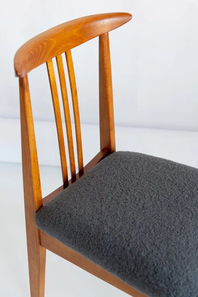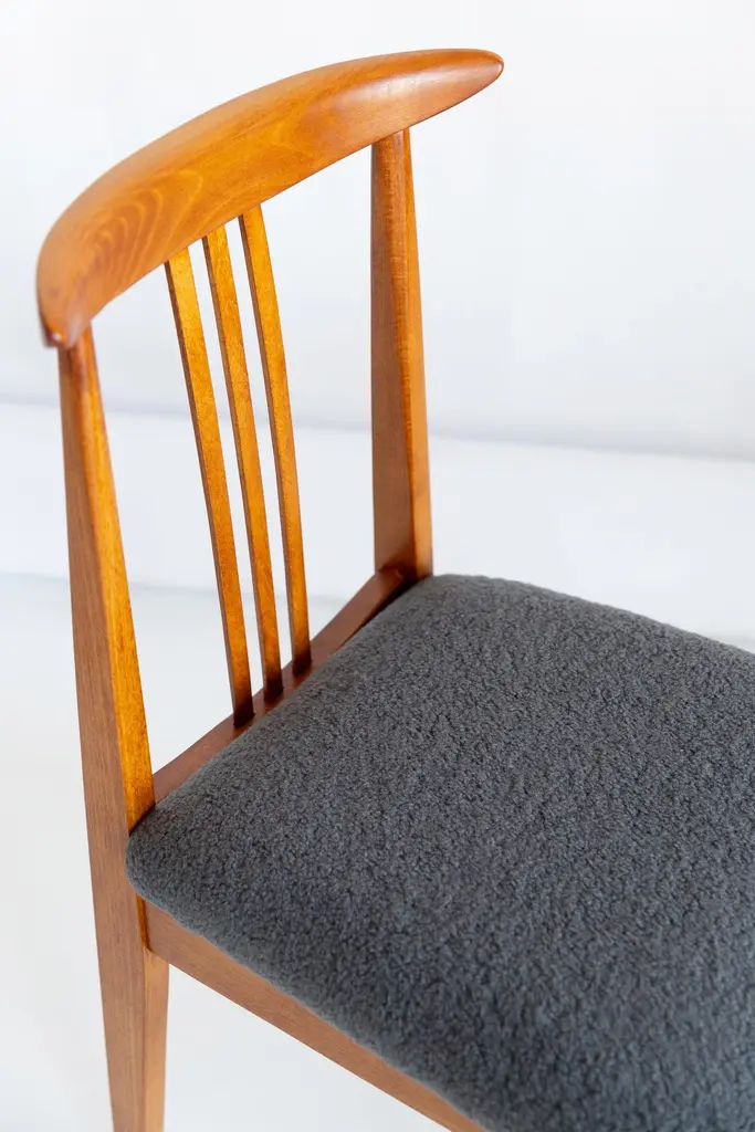 Set of ten beech chairs designed by M. Zielinski, type 200 / 100B. Manufactured by the Opole Furniture Industry Center at the end of the 1960s in Poland. The chairs have undergone a complete carpentry and upholstery renovation. Seats covered with high-quality italian gray boucle (color 07). If you want this set in another wood or fabric color please check the last picture. We can prepare also smaller and bigger sets.