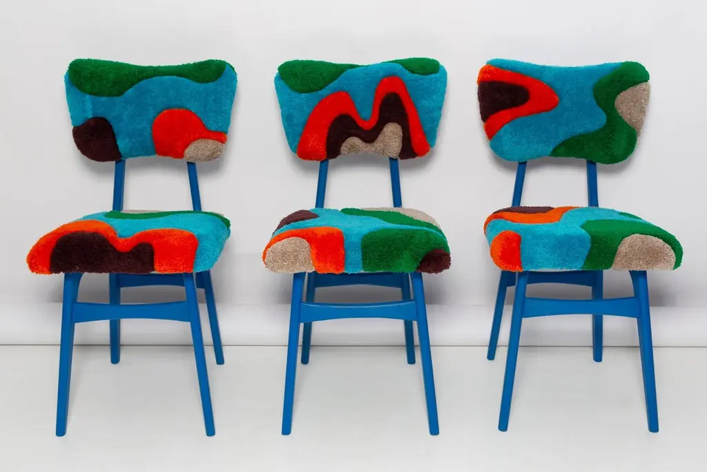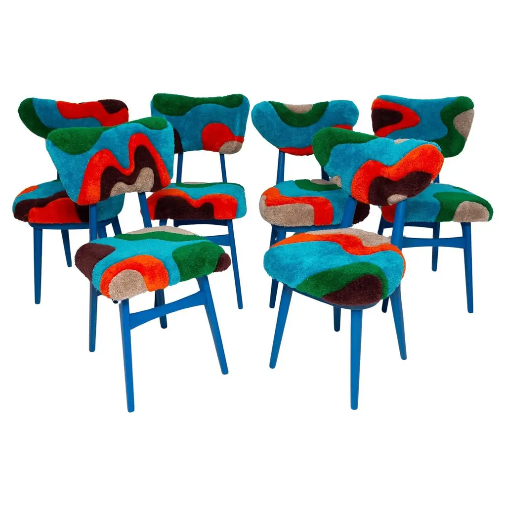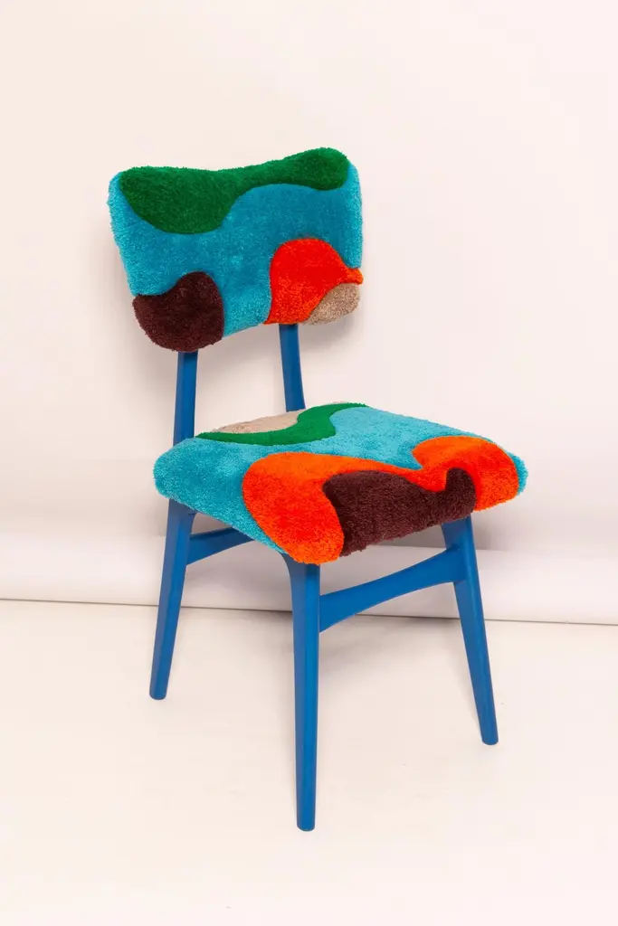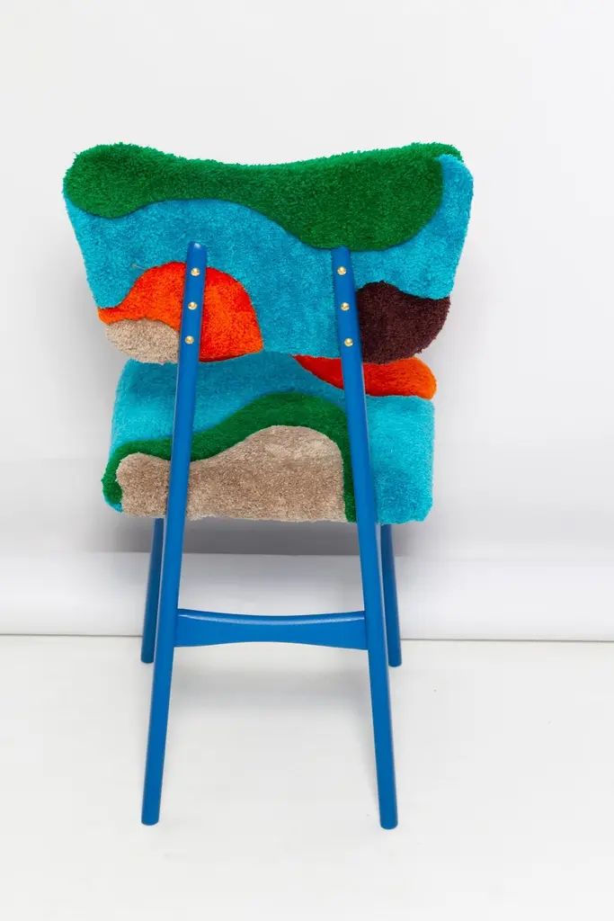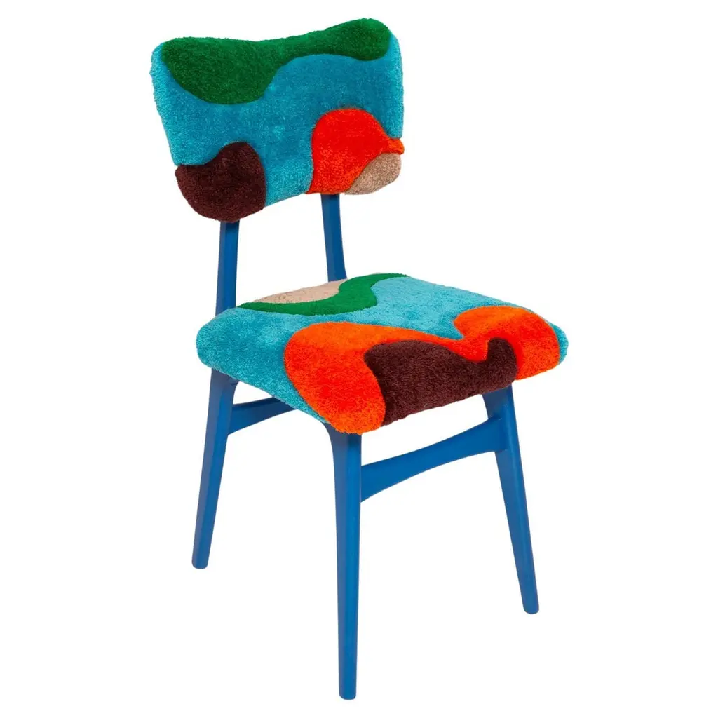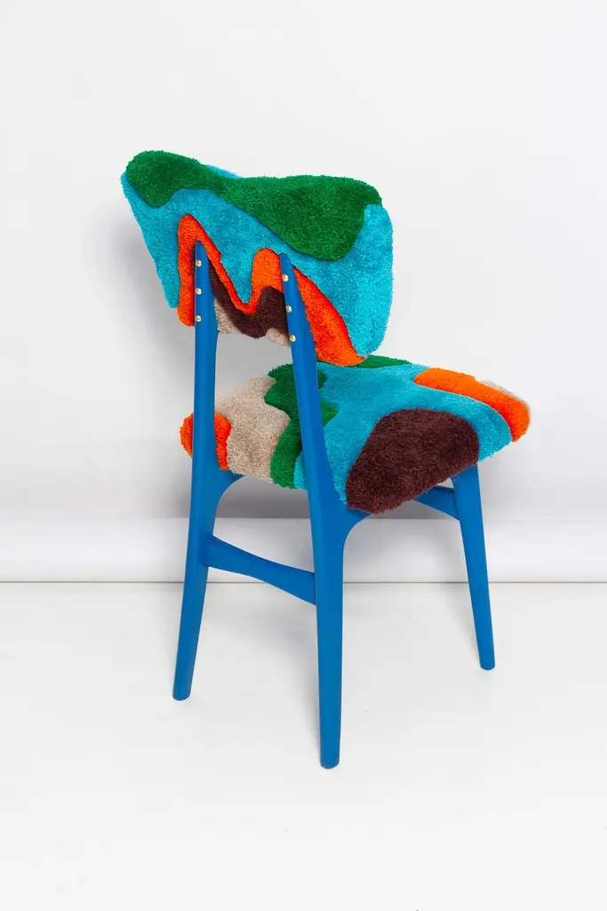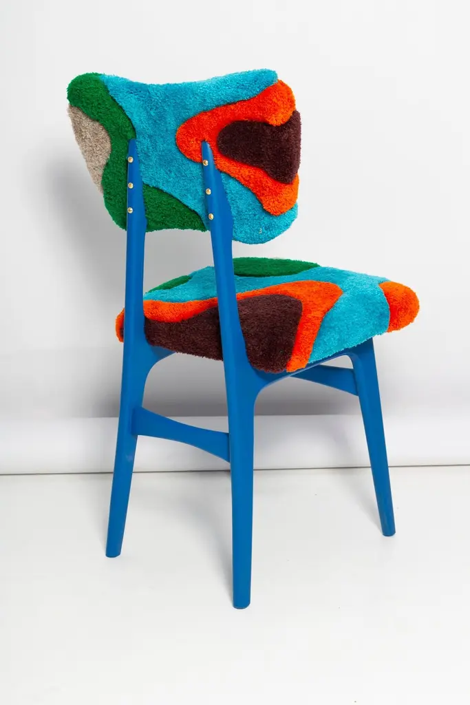 Dining chair called "Butterfly" with beautiful blue stained beech legs and fully upholstered seat and back in beautiful hand tufting wool fabric.This chair can be customized to your specifications or COM. Wood, stain, finish, fabric and custom options are available. Check the last pictures with color samples. This is vintage chair after professional renovation. Designed in 1960s in Poland.About the fabric used in this option:Seat and back is hand tufting multicolor wool. Absolutely hand made technic. Every chair is unique and can be a bit different. They are extremely comfortable and highly decorative. We can prepare this chair in another wool tufting colors.Different patterns are also possible.Waiting time is 3-4 weeks. Hand made in Poland.
