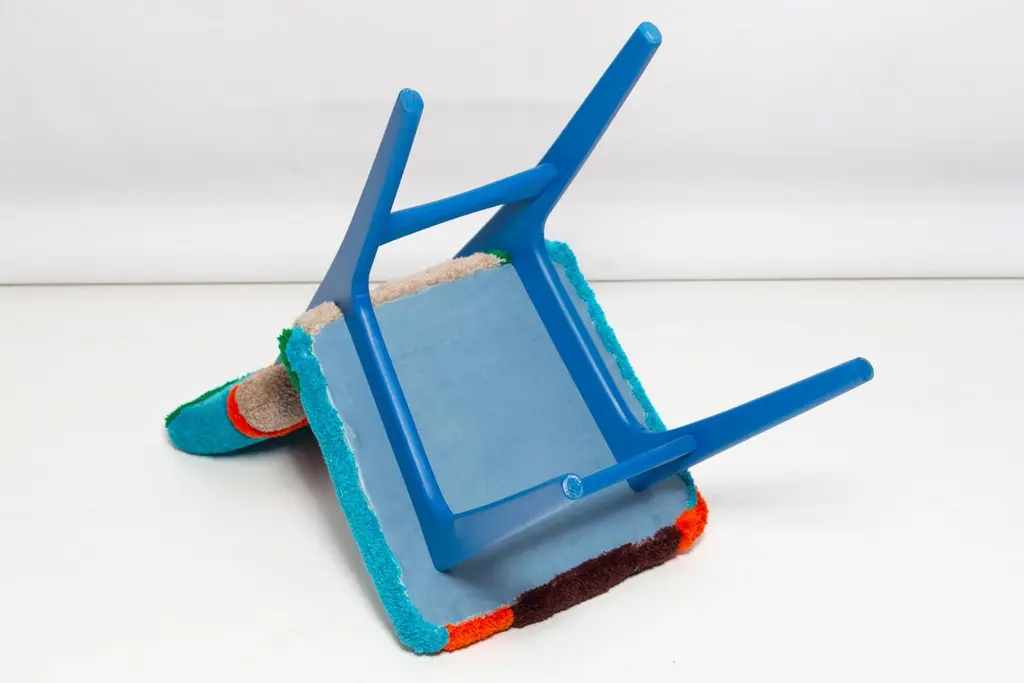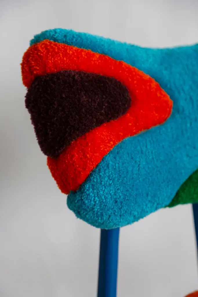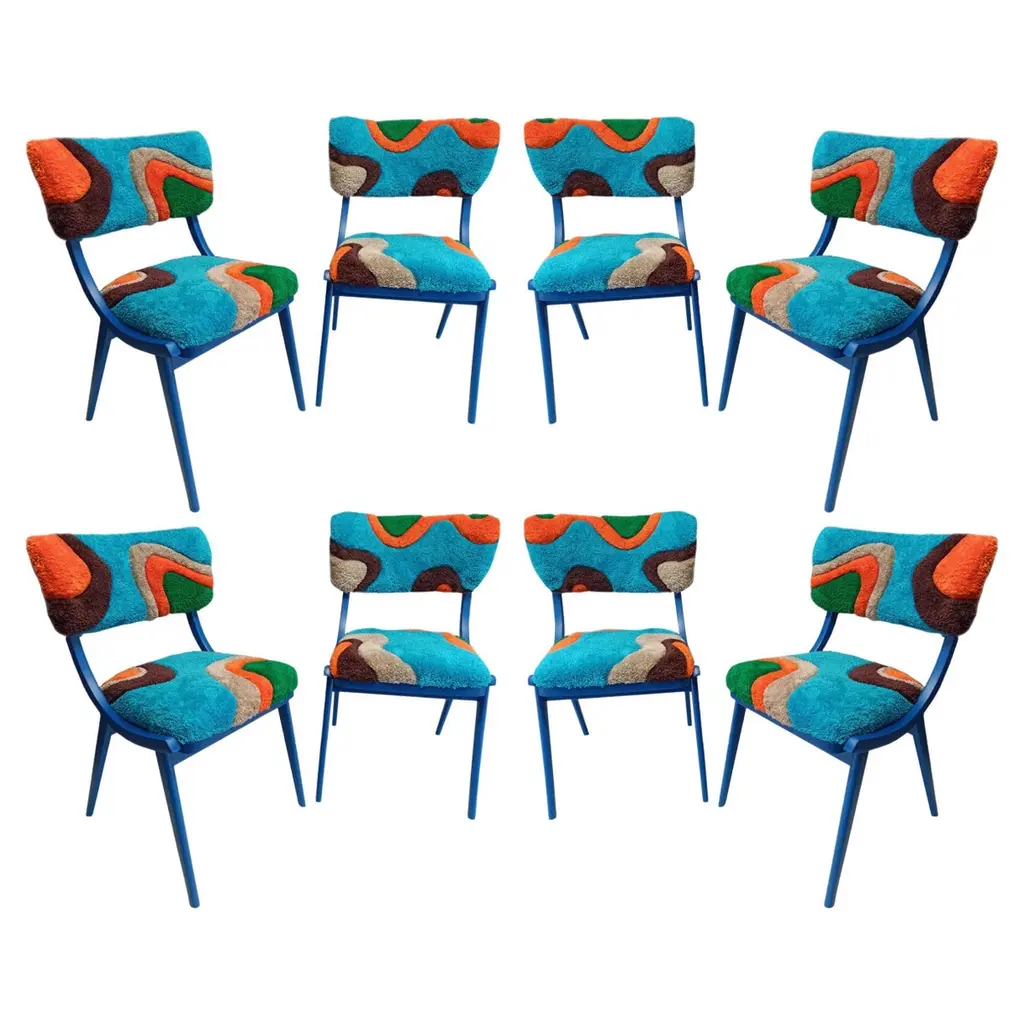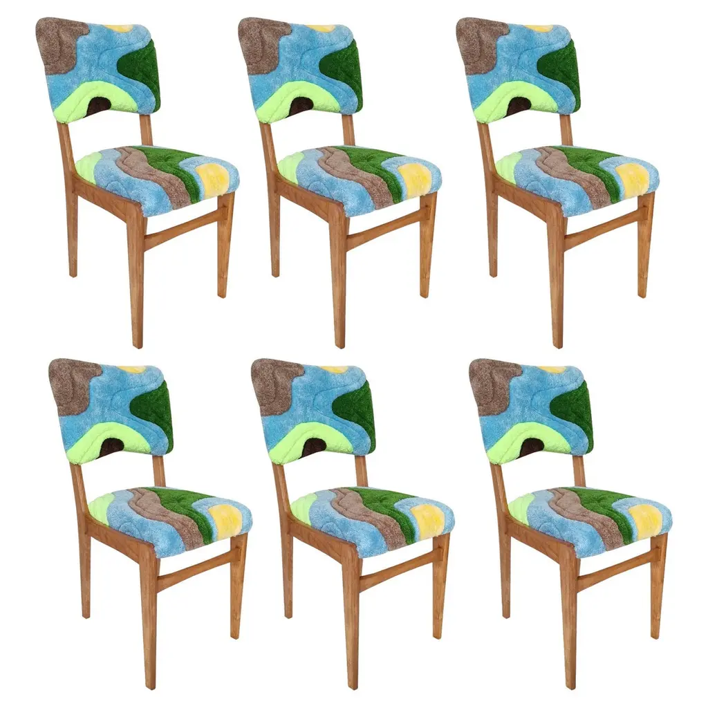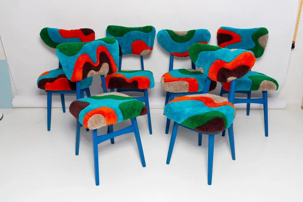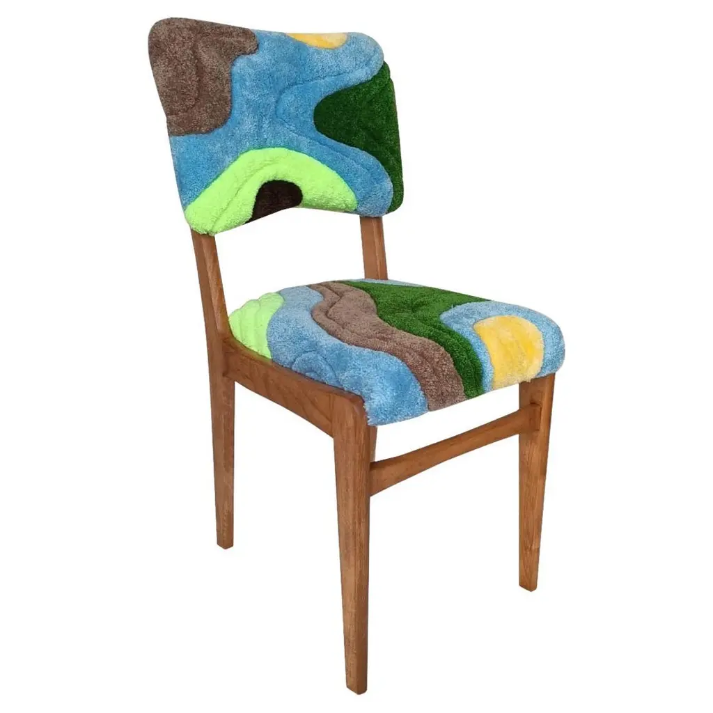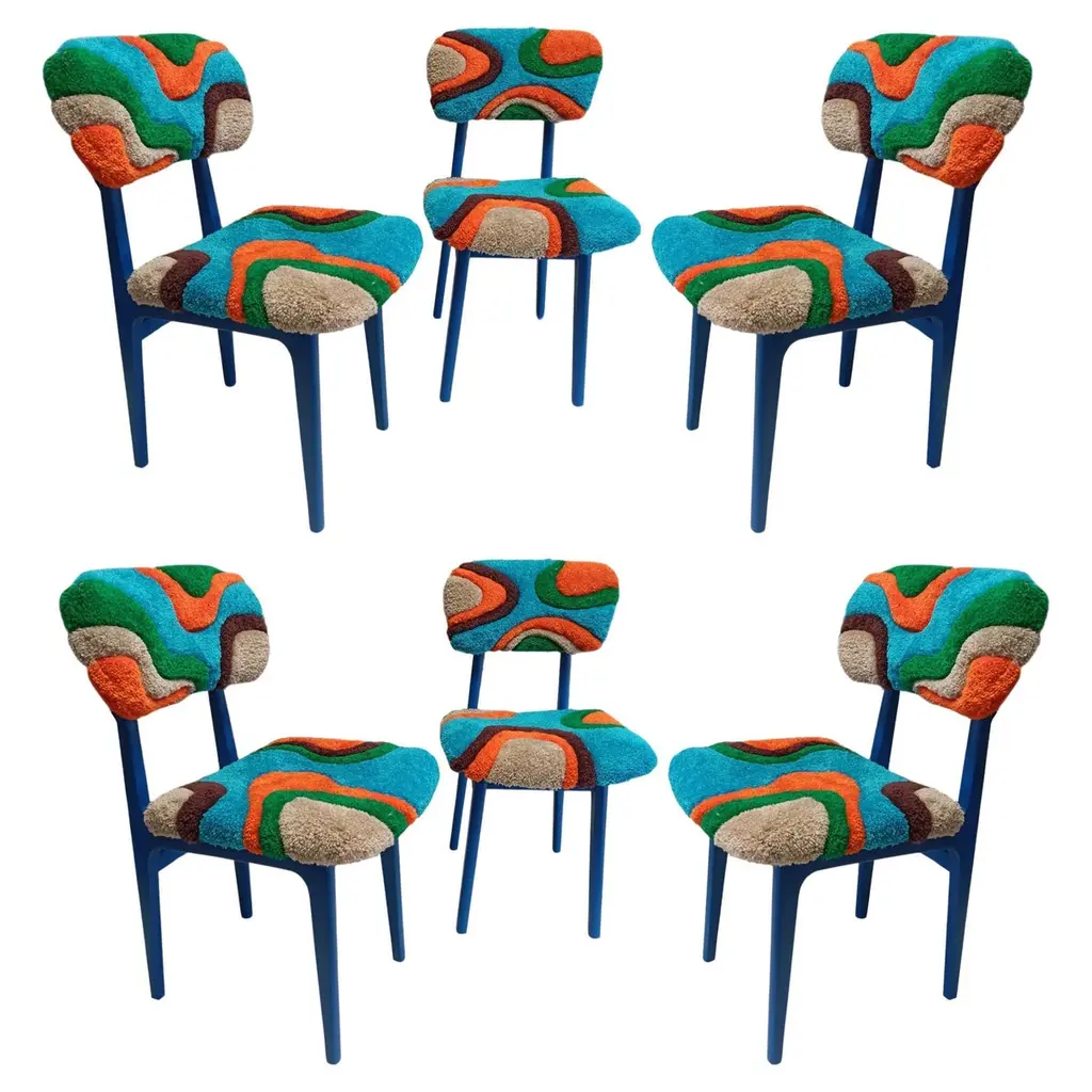 Dining chair called "Butterfly" with beautiful blue stained beech legs and fully upholstered seat and back in beautiful hand tufting wool fabric.This chair can be customized to your specifications or COM. Wood, stain, finish, fabric and custom options are available. Check the last pictures with color samples. This is vintage chair after professional renovation. Designed in 1960s in Poland.About the fabric used in this option:Seat and back is hand tufting multicolor wool. Absolutely hand made technic. Every chair is unique and can be a bit different. They are extremely comfortable and highly decorative. We can prepare this chair in another wool tufting colors.Different patterns are also possible.Waiting time is 3-4 weeks. Hand made in Poland.