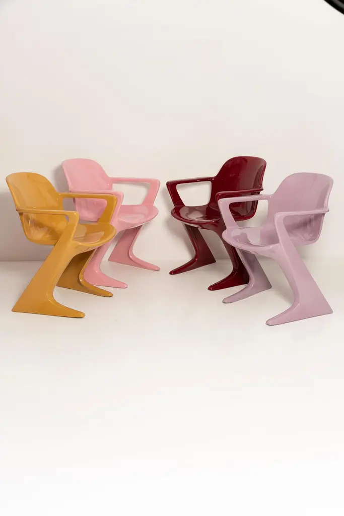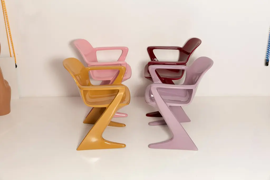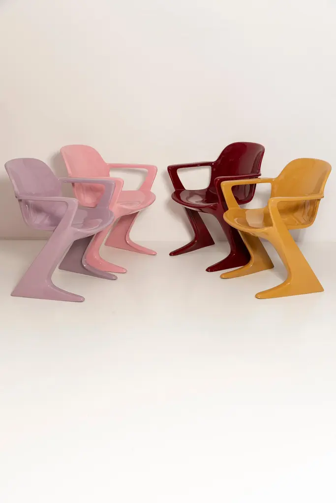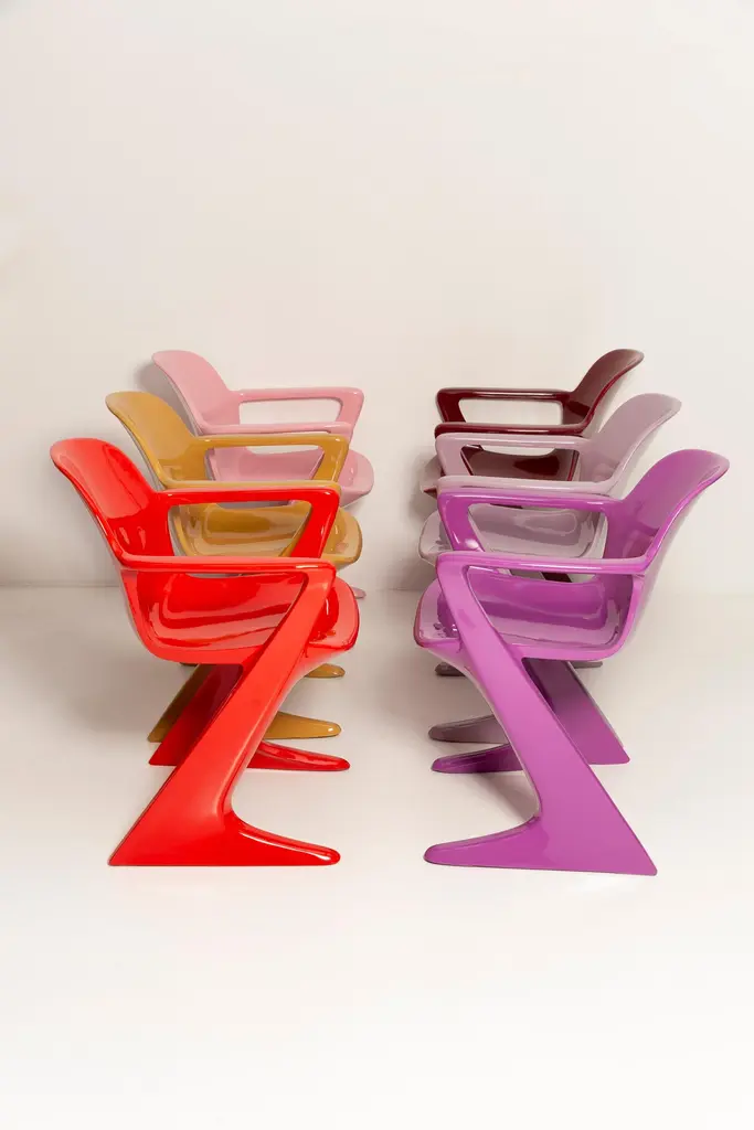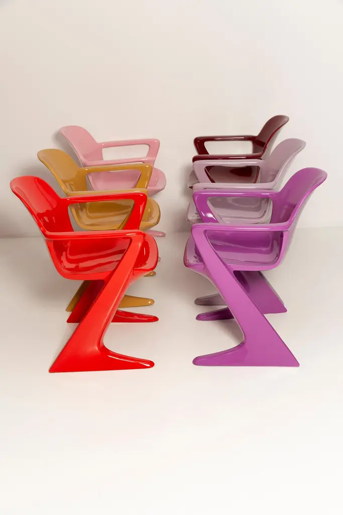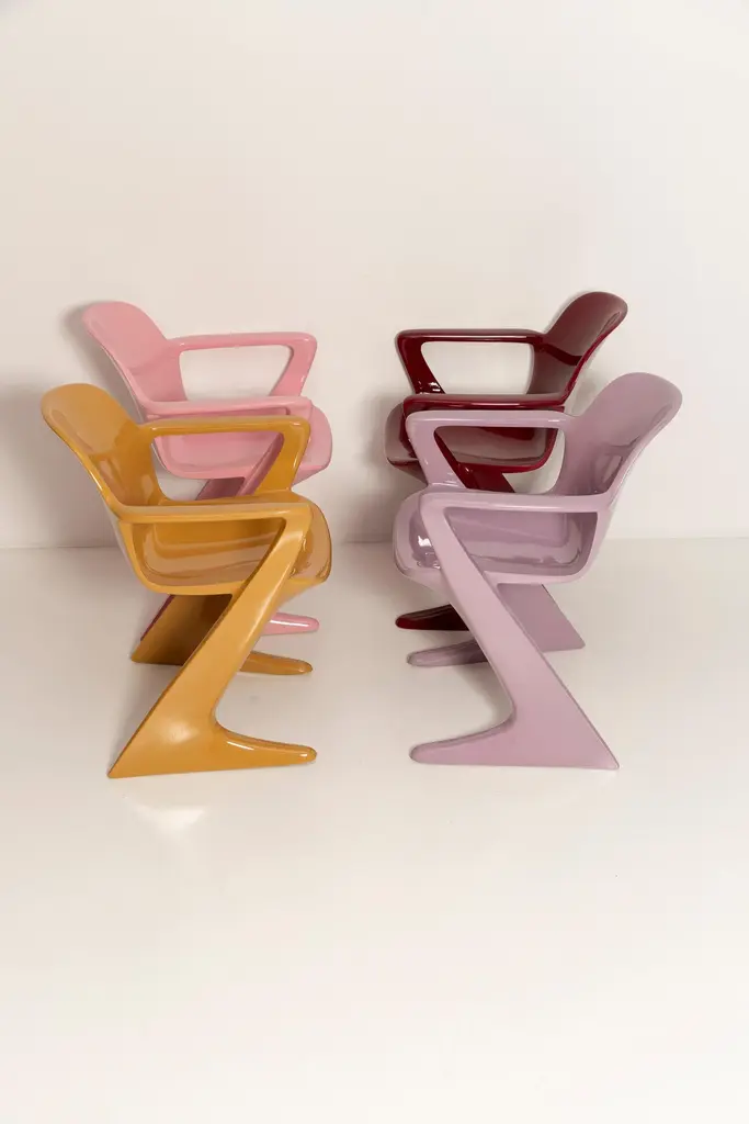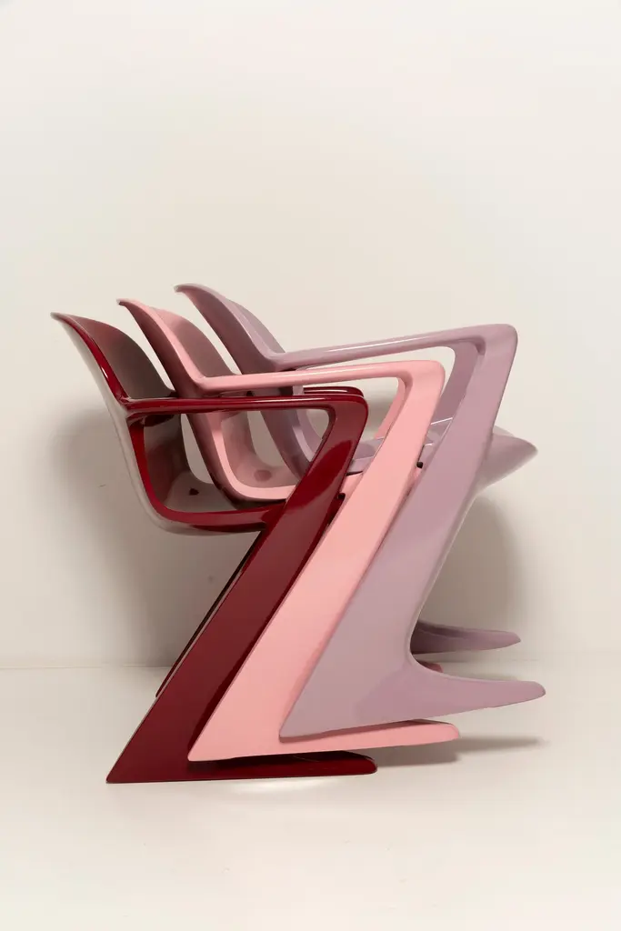 The z.stuhl chair, designed by Ernst Moeckl (1931-2013) in the 1970s, is a cantilever chair made of polyurethane, which is available with and without armrests. In the vernacular, the chair is known by its geometry-related names such as "squatting man", "kangaroo" and "Z-chair". German Version of the Panton chair. Also called kangaroo chair or variopur chair. Produced in eastern Germany.Chairs are after full renovation, new glossy blue lacquer. This model is extremely comfortable! Beautiful organic shape make them timeless and fits to every interior. We can prepare also set of 4 or 8 or more, also in another RAL/Pantone color.Here set of 3 is available - red, light pink and sand beige.