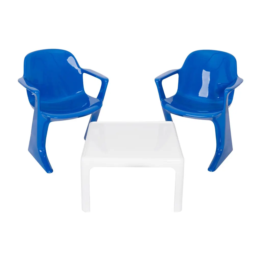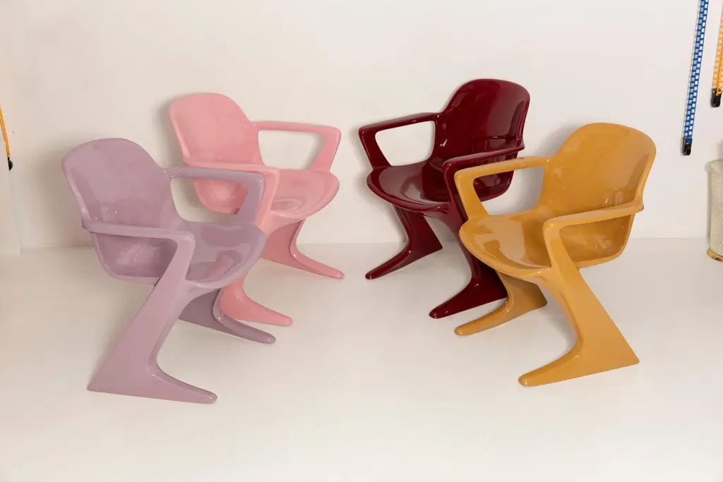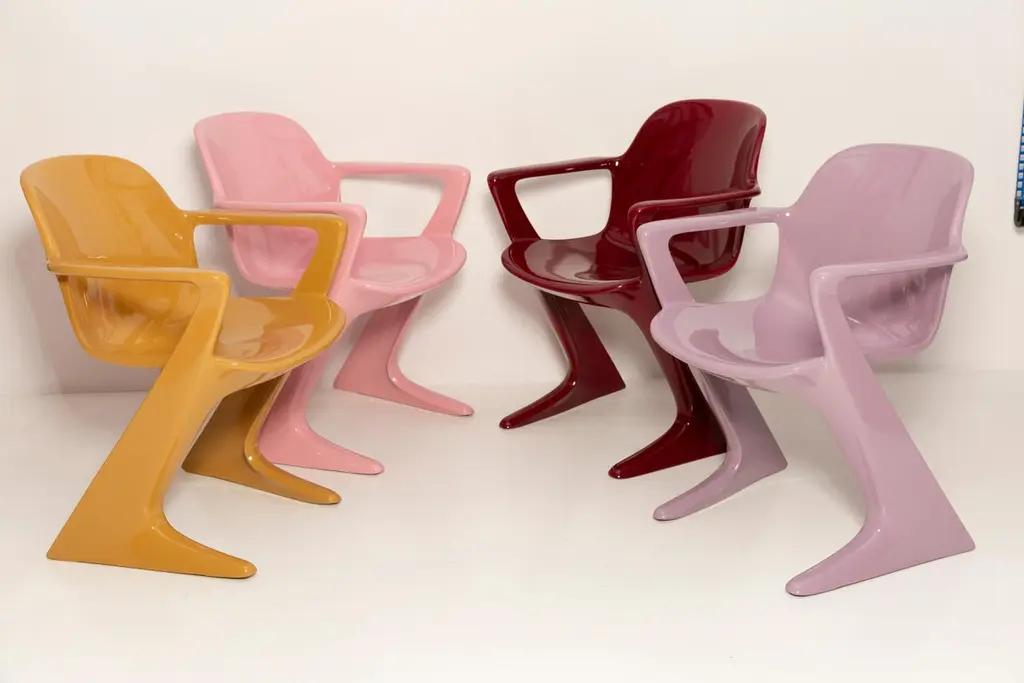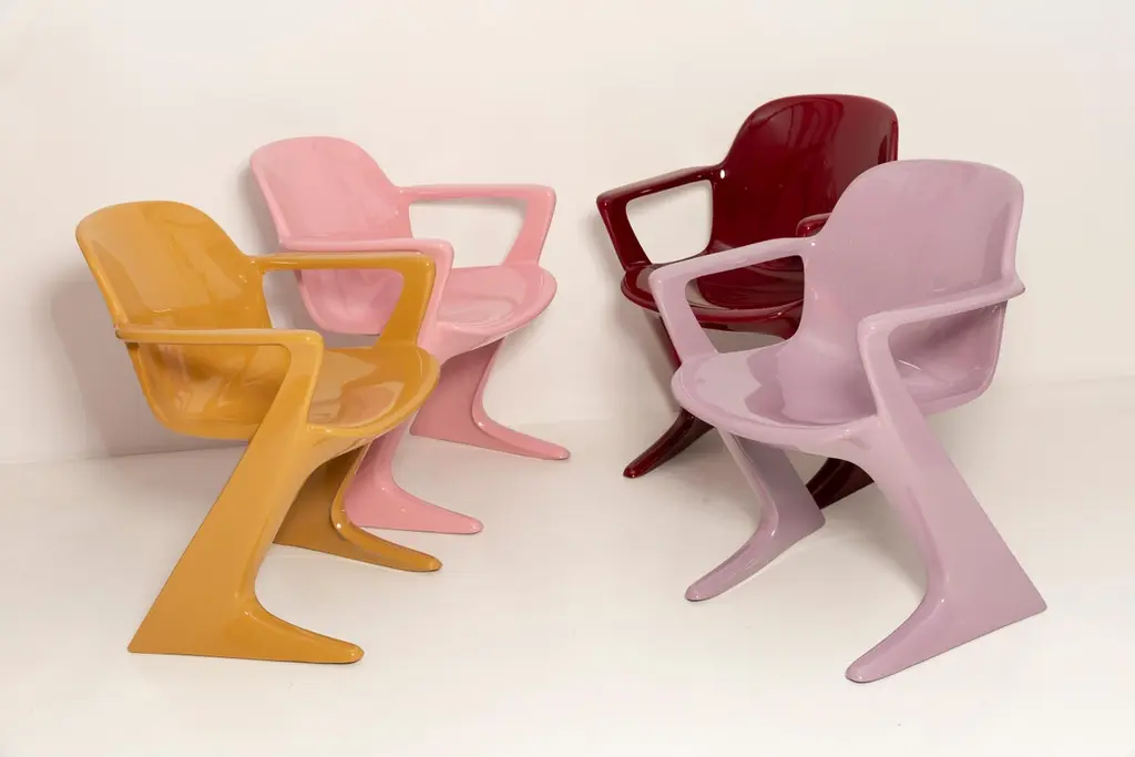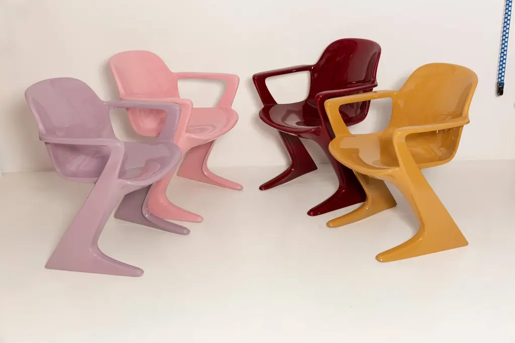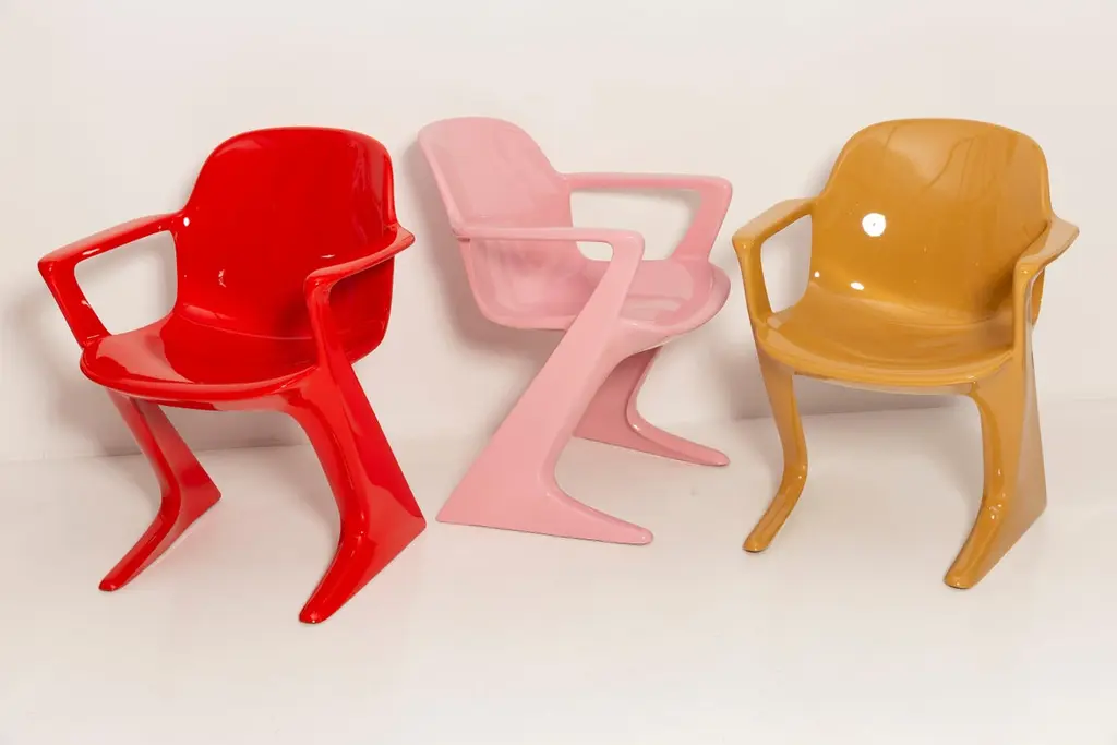 The z.stuhl chair, designed by Ernst Moeckl (1931-2013) in the 1970s, is a cantilever chair made of polyurethane, which is available with and without armrests. In the vernacular, the chair is known by its geometry-related names such as "squatting man", "kangaroo" and "Z-chair". German Version of the Panton chair. Also called kangaroo chair or variopur chair. Produced in eastern Germany.Chairs are after full renovation, new glossy blue lacquer. This model is extremely comfortable! Beautiful organic shape make them timeless and fits to every interior. We can prepare also set of 4 or 8 or more, also in another RAL/Pantone color.Here set of 3 is available - red, light pink and sand beige.