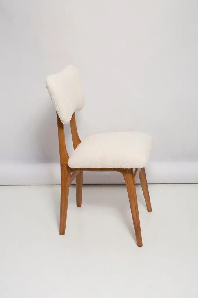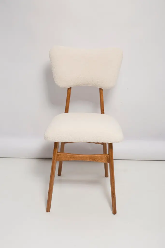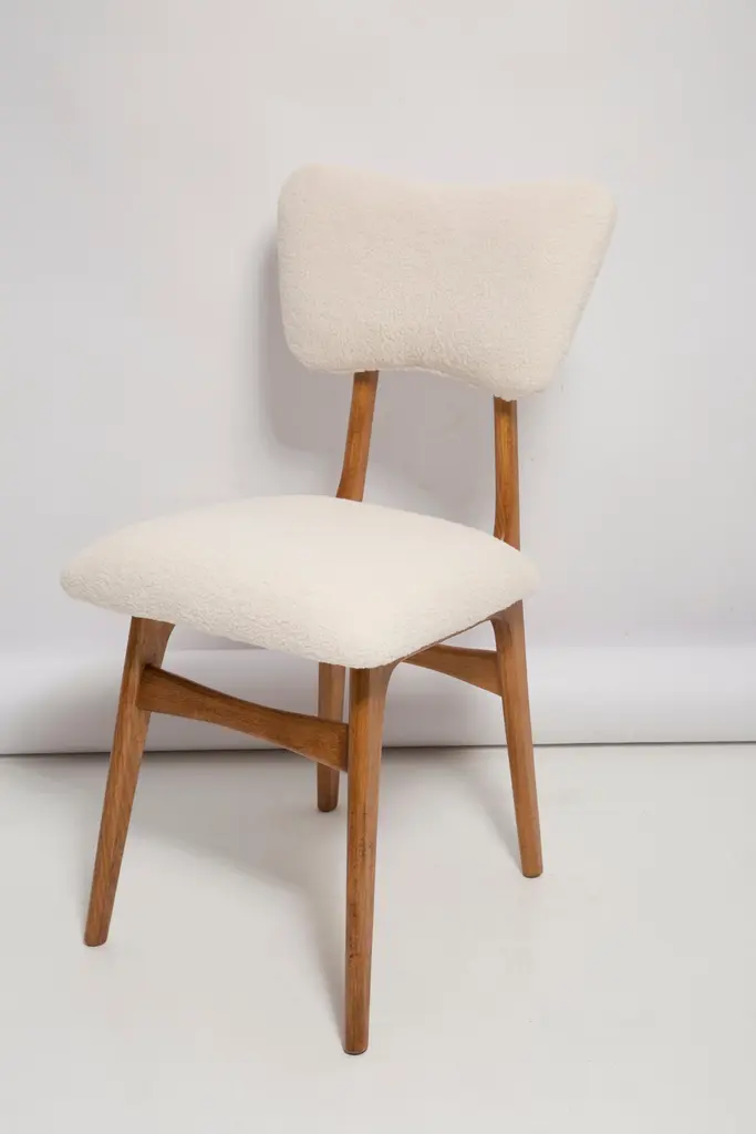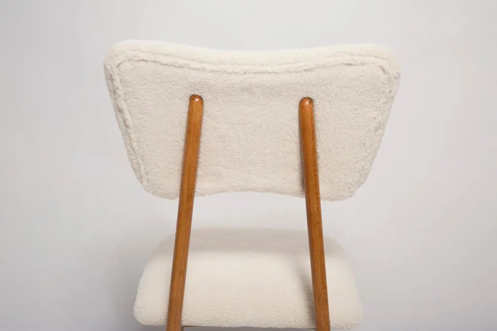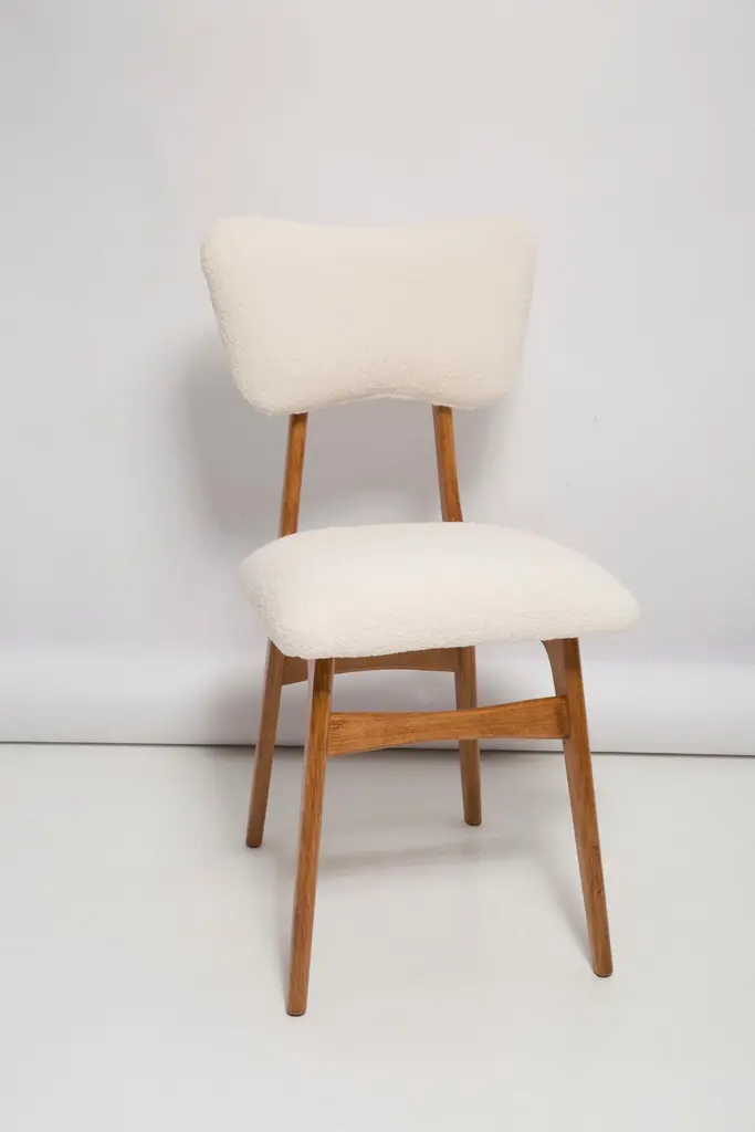 Chairs designed by Prof. Rajmund Halas. Made of beechwood. Chairs are after a complete upholstery renovation; the woodwork has been refreshed and painted in cherry lacquer. Seat and back is dressed in light cream (color 01), durable and pleasant to the touch bouclé fabric. Chairs are stabile and very shapely. They were produced in former furniture factory in Goleniów in the 1960s. We can prepare this set in every color of wood and fabric also in bigger sets. Please check the last picture with bouclé and wood color samples.