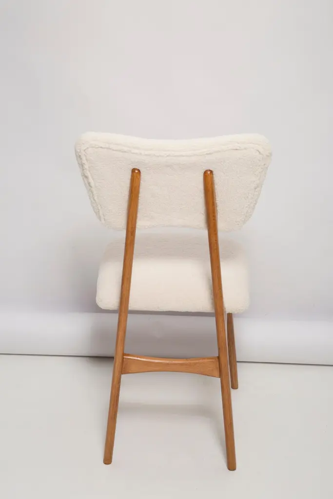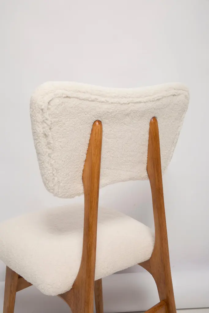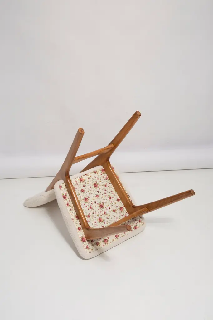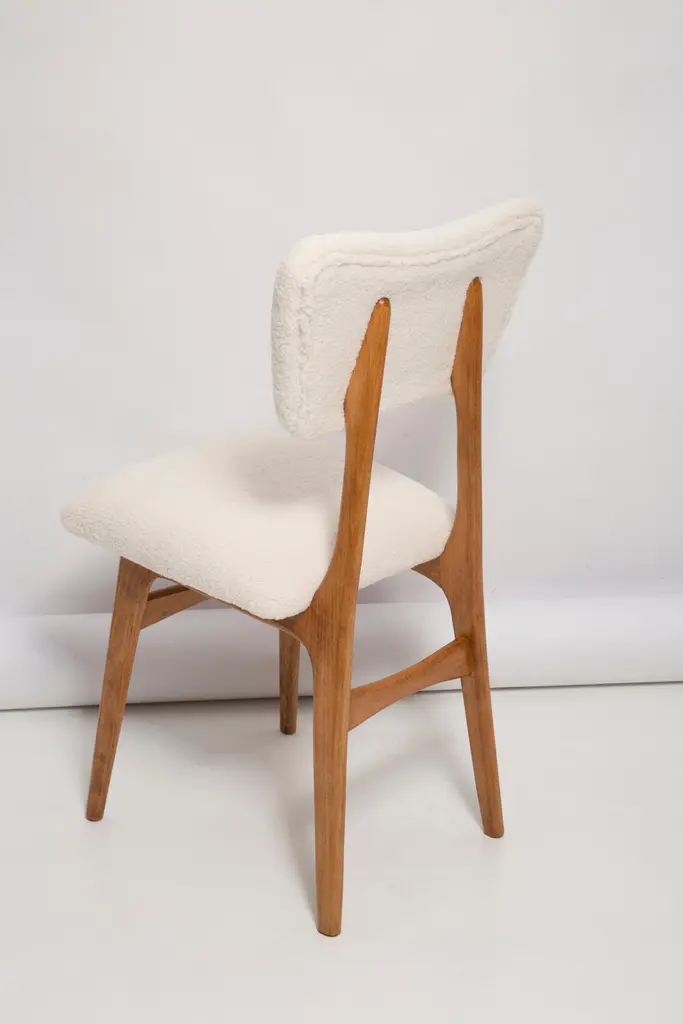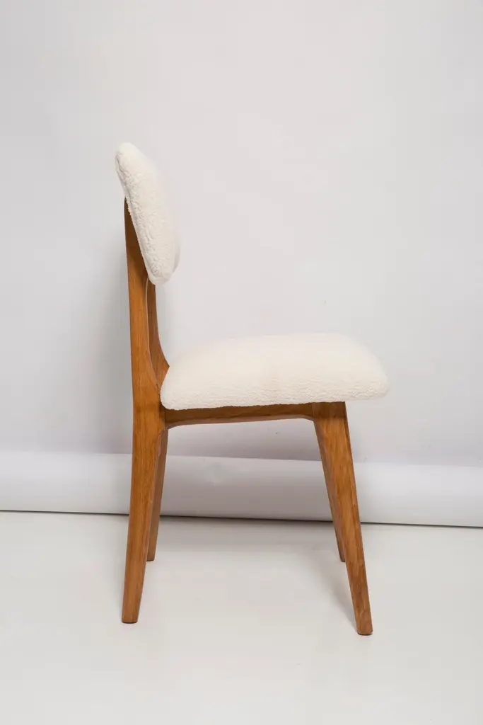 Chairs designed by Prof. Rajmund Halas. Made of beechwood. Chairs are after a complete upholstery renovation; the woodwork has been refreshed and painted in cherry lacquer. Seat and back is dressed in light cream (color 01), durable and pleasant to the touch bouclé fabric. Chairs are stabile and very shapely. They were produced in former furniture factory in Goleniów in the 1960s. We can prepare this set in every color of wood and fabric also in bigger sets. Please check the last picture with bouclé and wood color samples.