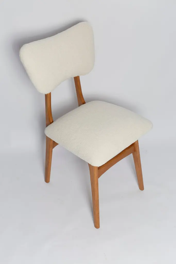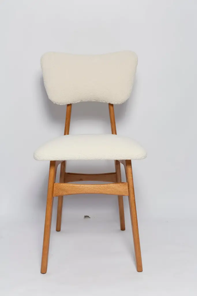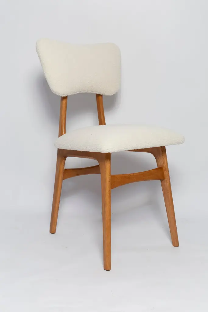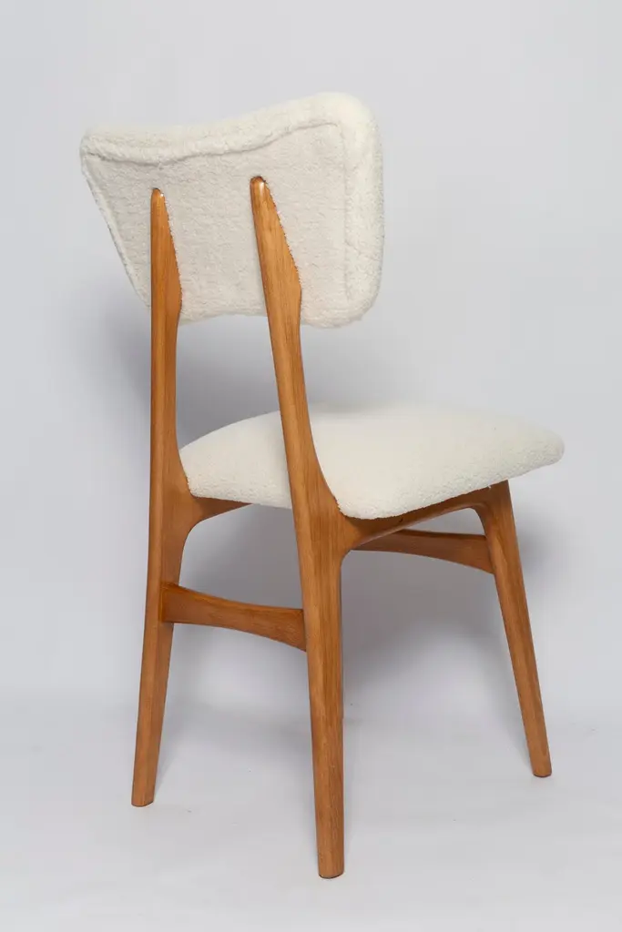 Dining chair called "Butterfly" with medium light stained beech legs and fully upholstered seat and back in beautiful boucle italian fabric (color number 01). This chair can be customized to your specifications or COM. Wood, stain, finish, fabric and custom dimensions options are available. Check the last picture with color samples. This is vintage chair after professional renovation. Designed in 1960s in Poland.Here set of twelve chairs is available.