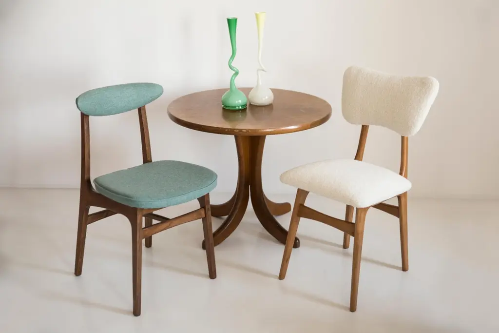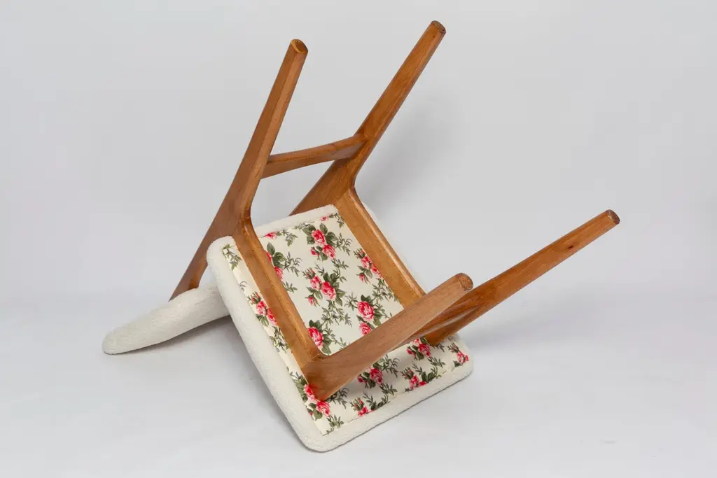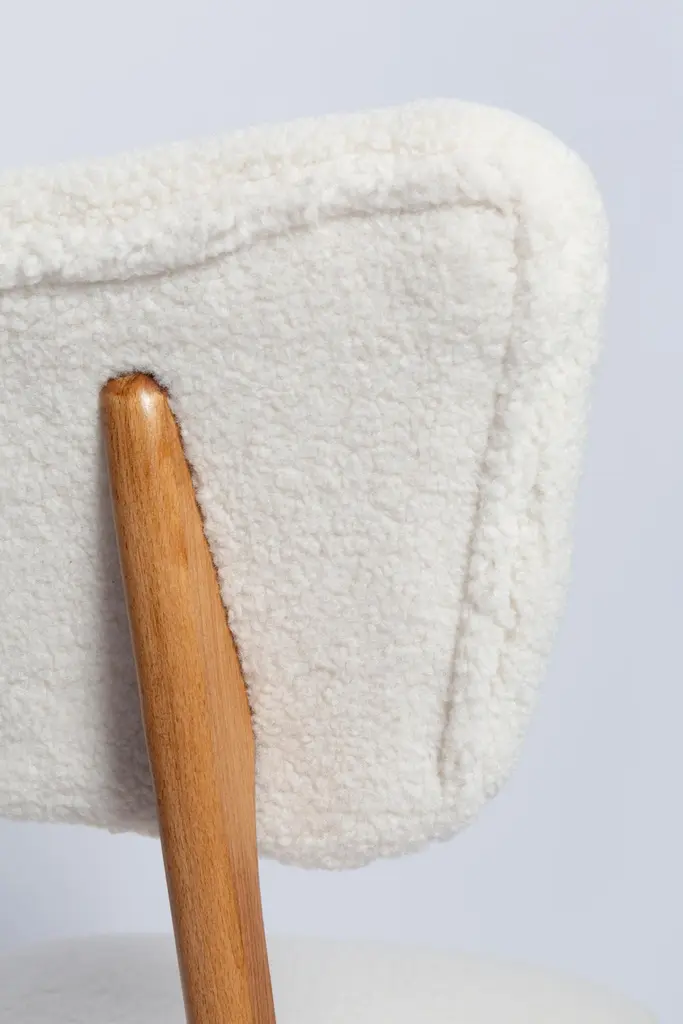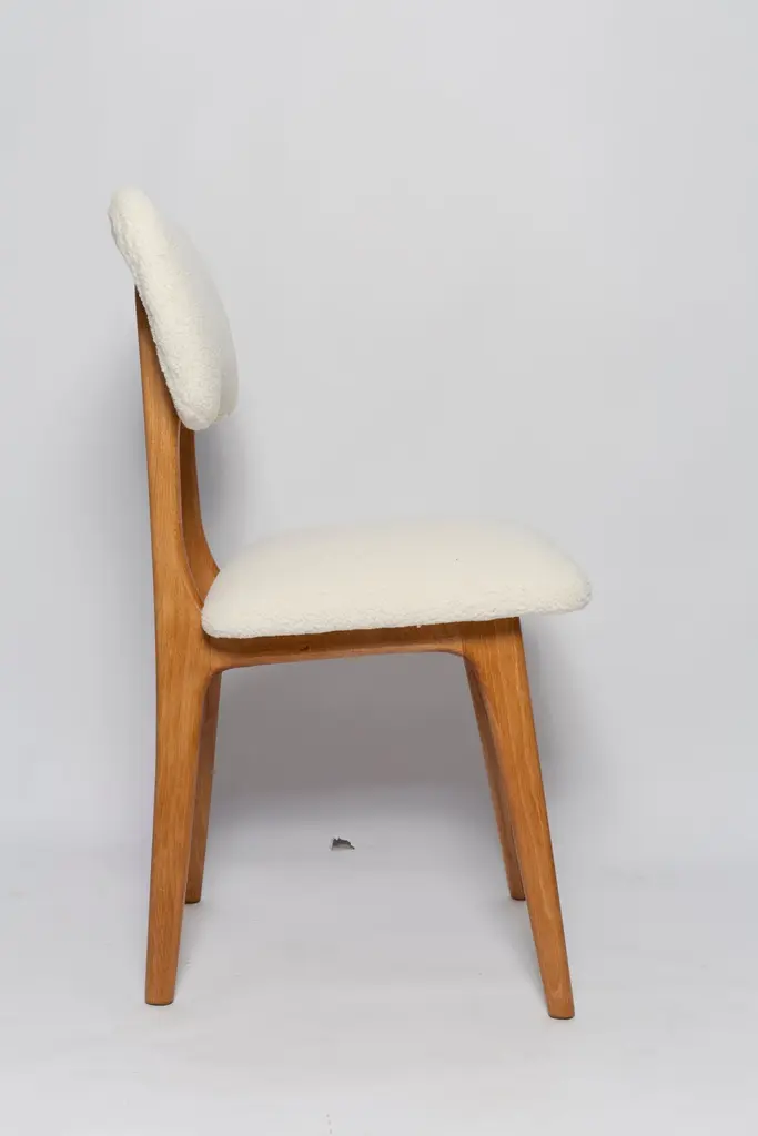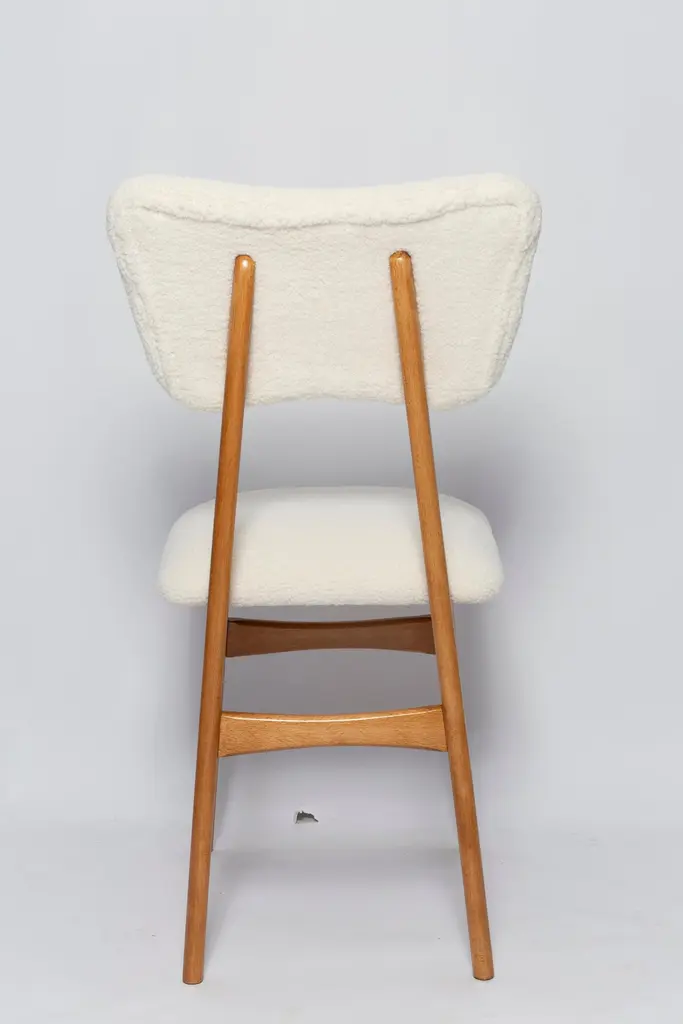 Dining chair called "Butterfly" with medium light stained beech legs and fully upholstered seat and back in beautiful boucle italian fabric (color number 01). This chair can be customized to your specifications or COM. Wood, stain, finish, fabric and custom dimensions options are available. Check the last picture with color samples. This is vintage chair after professional renovation. Designed in 1960s in Poland.Here set of twelve chairs is available.