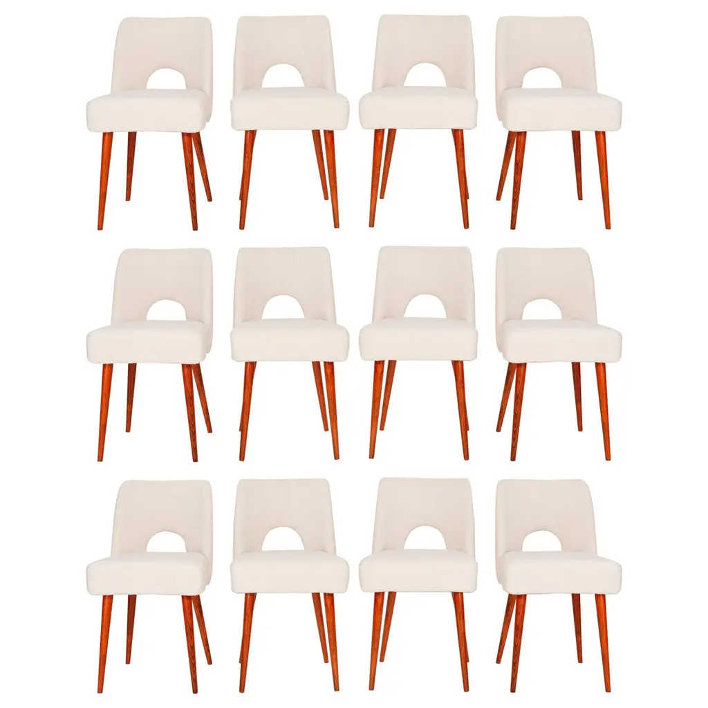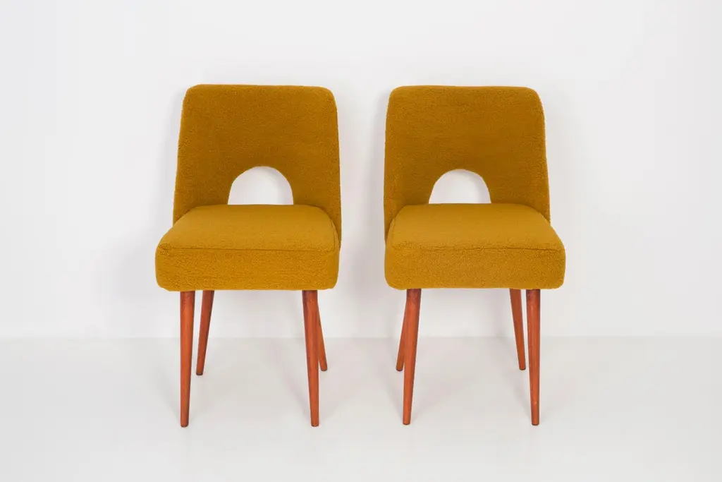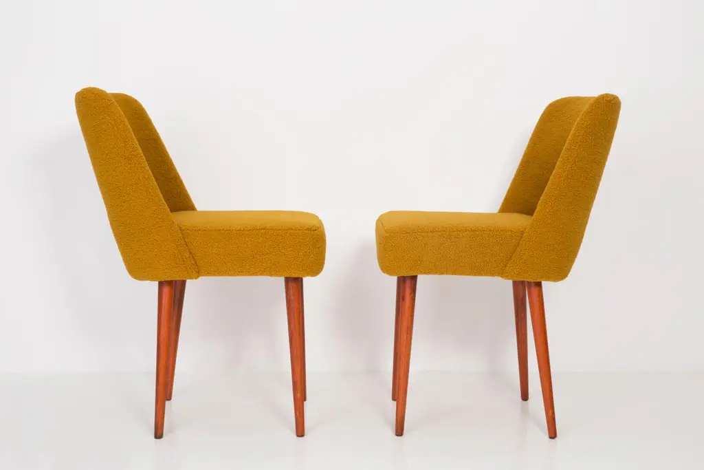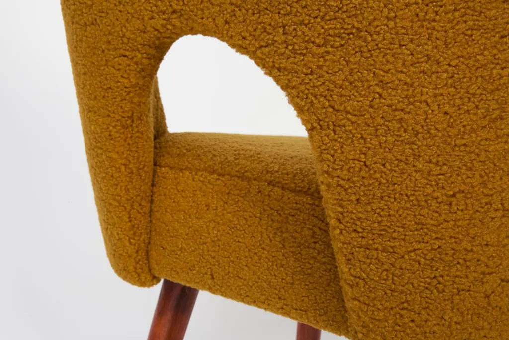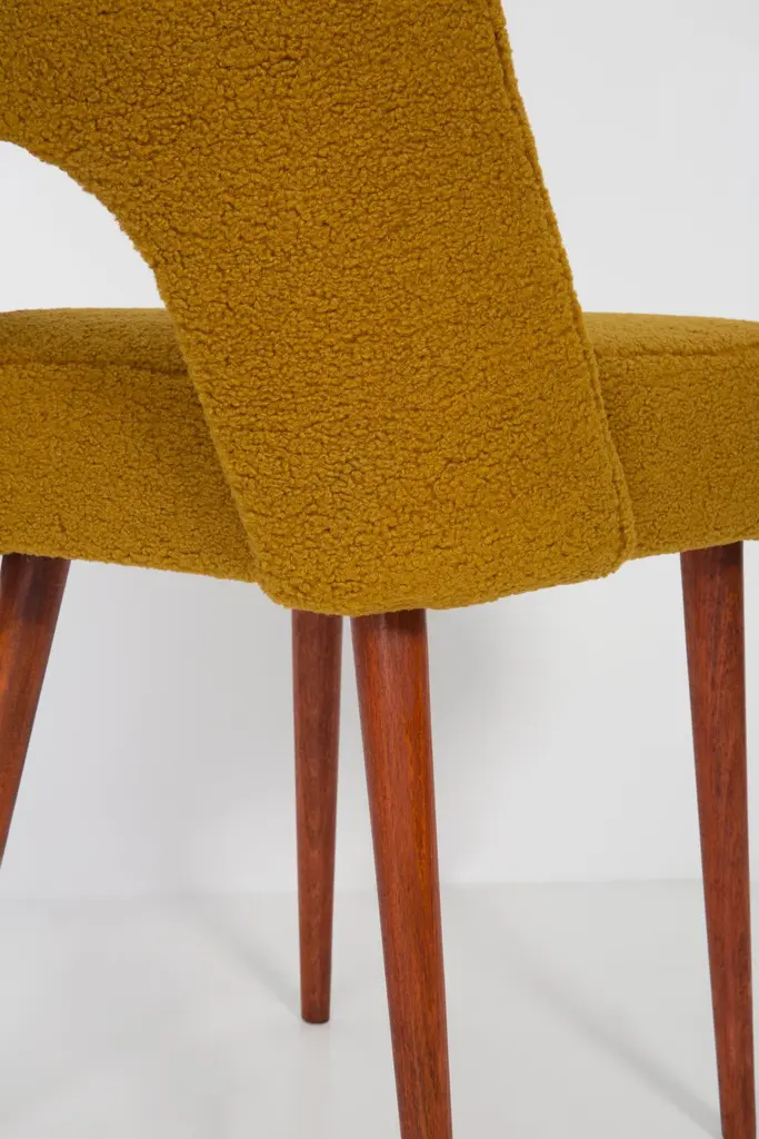 Twelve beautiful chairs type 1020 colloquially called "shells" produced by the Slupsk centre of furniture industry in the 1960s in Poland. They are after full renovation upholstery and carpentry. Seat and back is dressed in yellow ochre, durable and pleasant to the touch bouclé fabric. Wood was cleaned and varnished in teak wood color. We can prepare this set in every color of wood and fabric also in smaller or bigger sets. Please check the last picture with bouclé color samples.