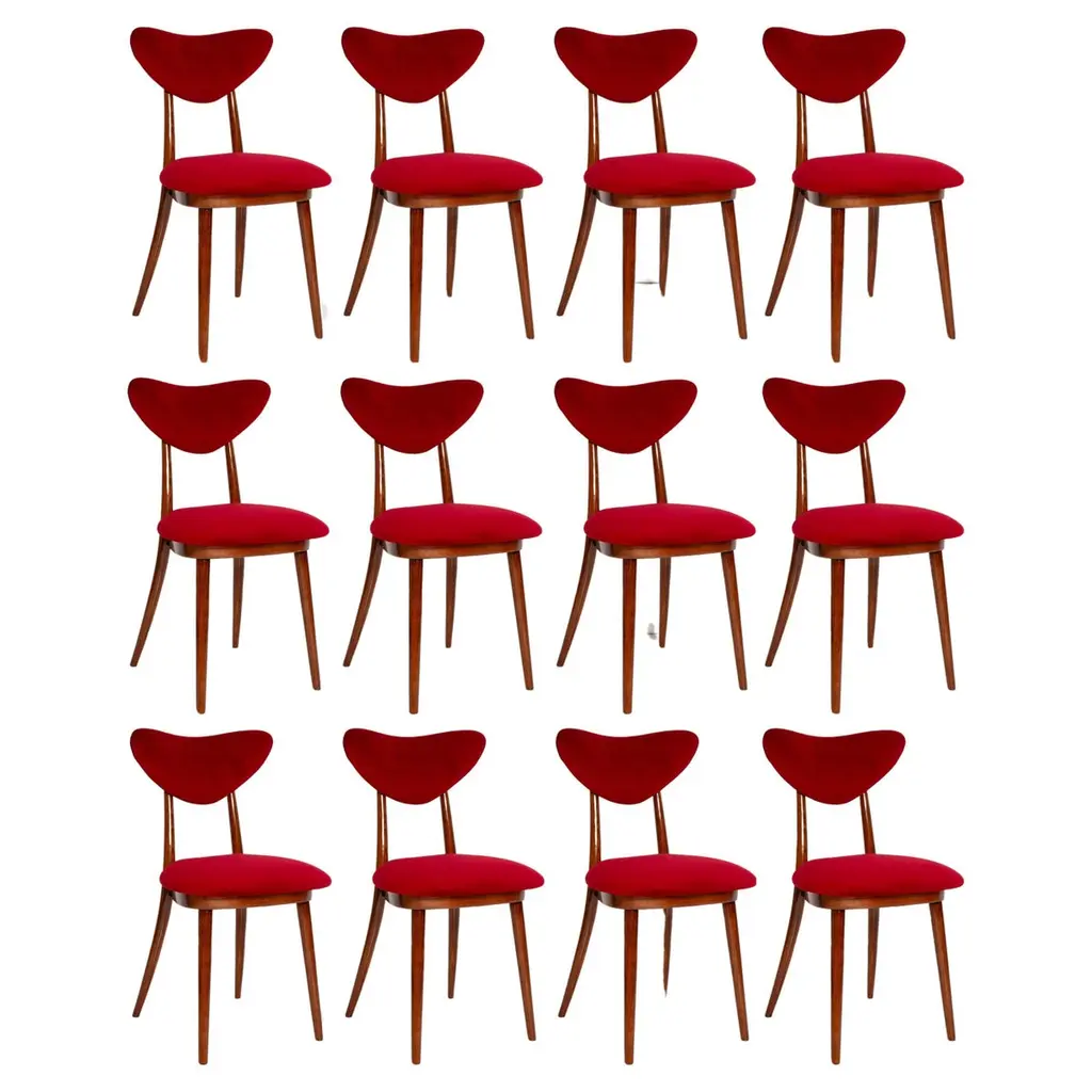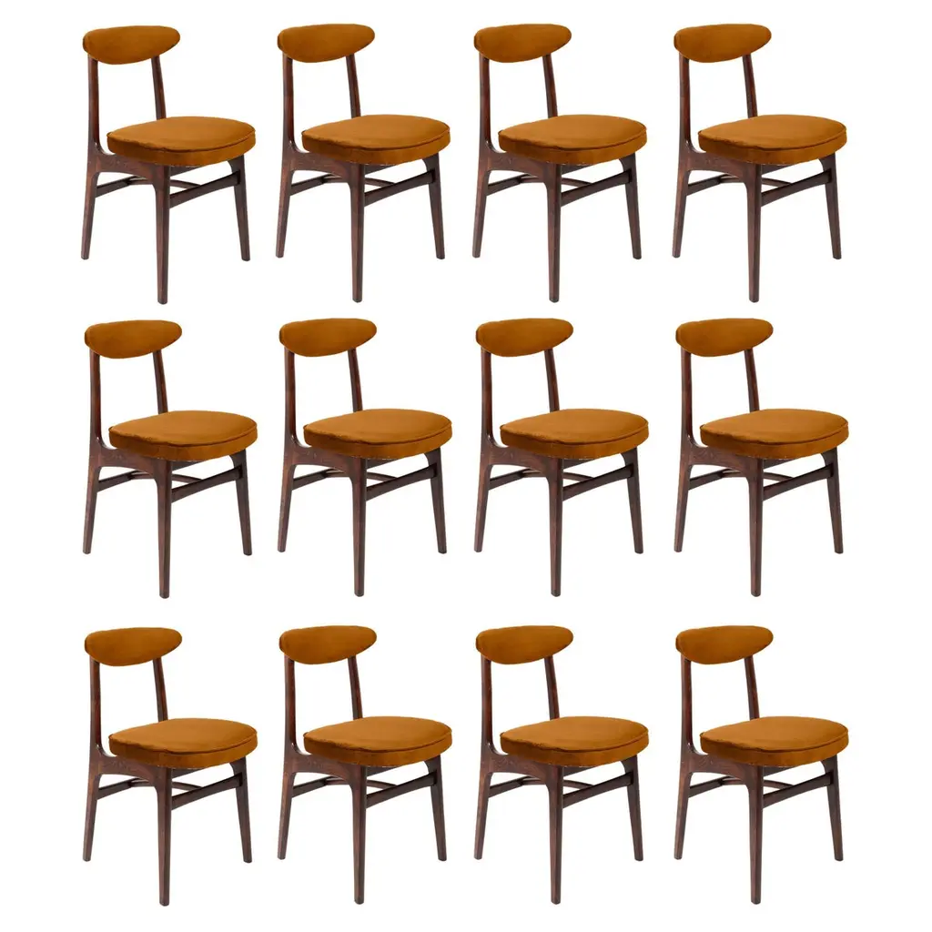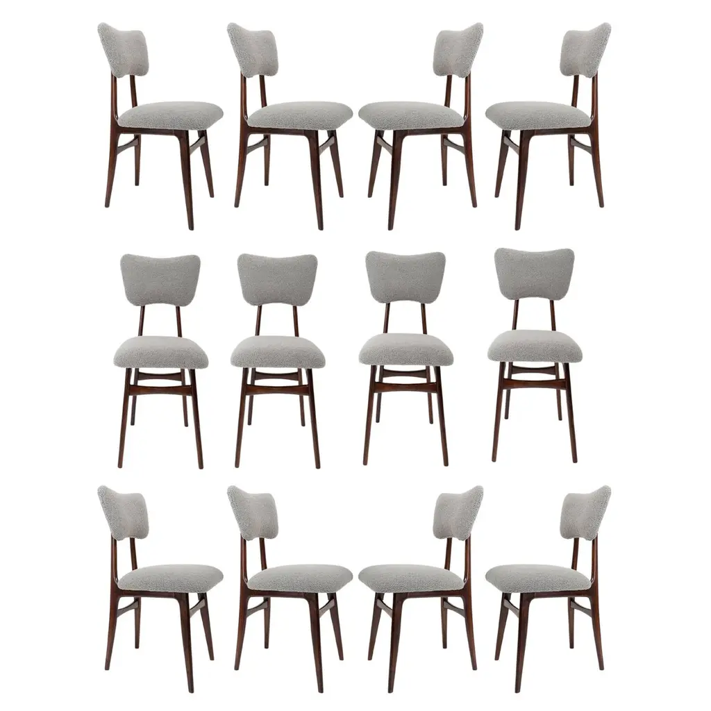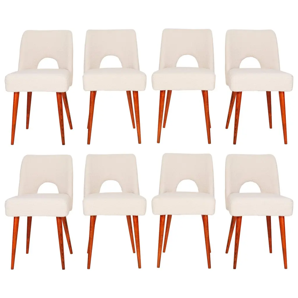 Twelve beautiful chairs type 1020 colloquially called "shells" produced by the Slupsk centre of furniture industry in the 1960s in Poland. They are after full renovation upholstery and carpentry. Seat and back is dressed in yellow ochre, durable and pleasant to the touch bouclé fabric. Wood was cleaned and varnished in teak wood color. We can prepare this set in every color of wood and fabric also in smaller or bigger sets. Please check the last picture with bouclé color samples.