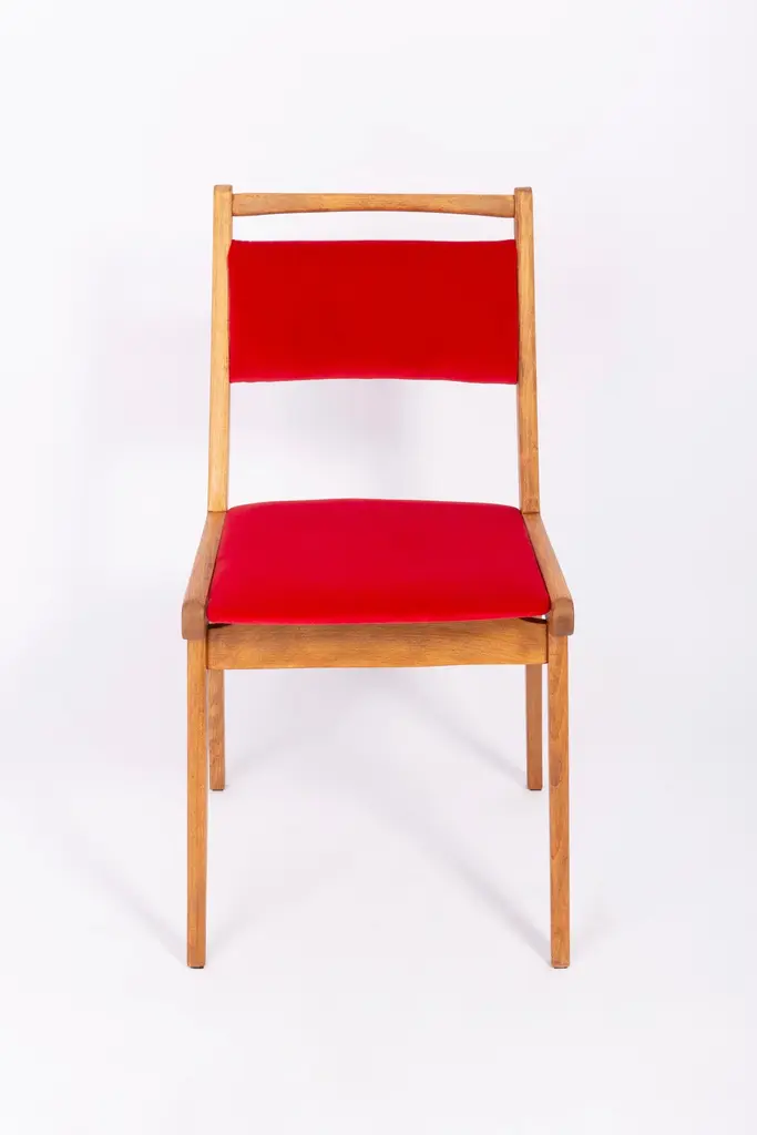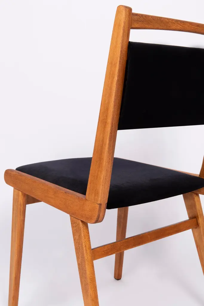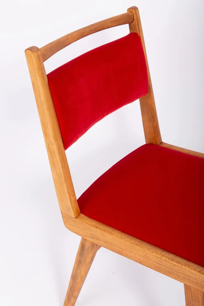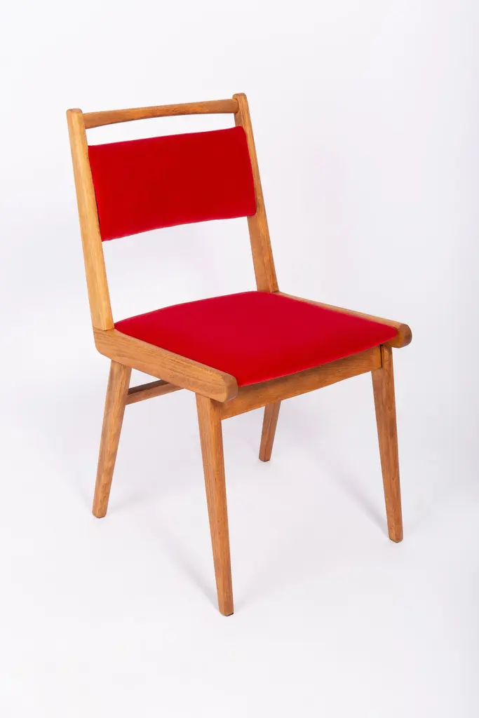 Chairs designed by Prof. Rajmund Halas. It is JAR type model. Made of beechwood. Chairs are after a complete upholstery renovation, the woodwork has been refreshed. Seat and back is dressed in a black and red, durable and pleasant to the touch velvet fabric. Chairs are stable and very shapely. Chairs were produced in former furniture factory in Goleniów in the 1960s. We can prepare this set in every color of wood and fabric.
