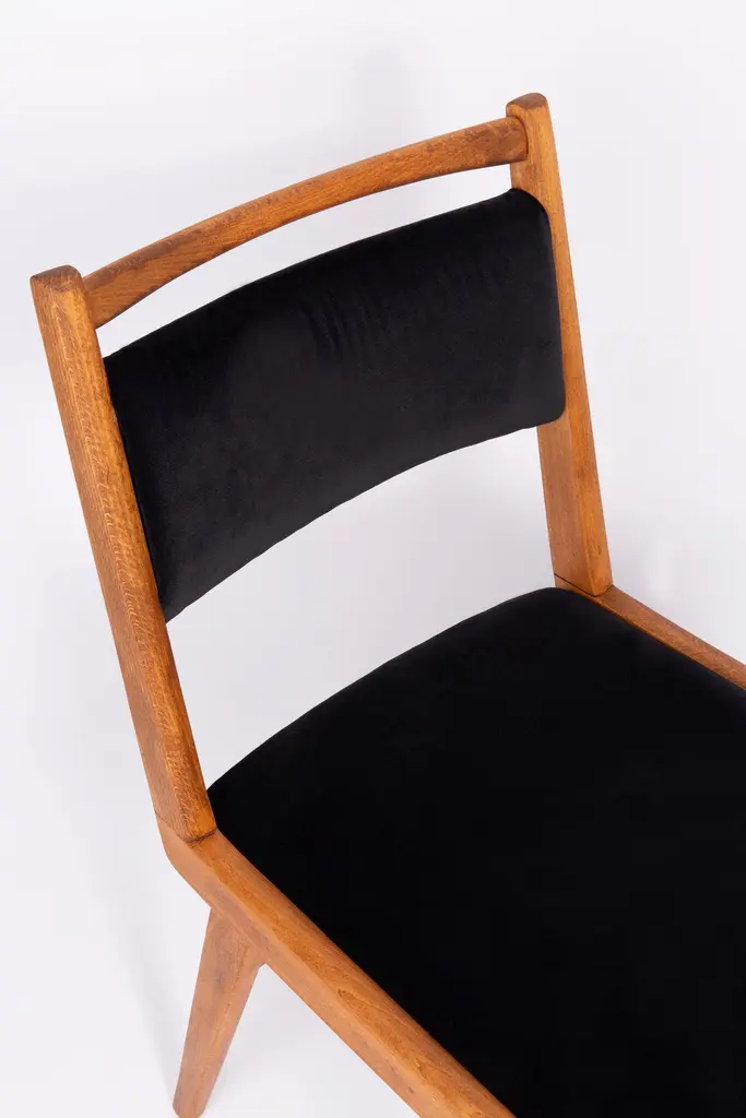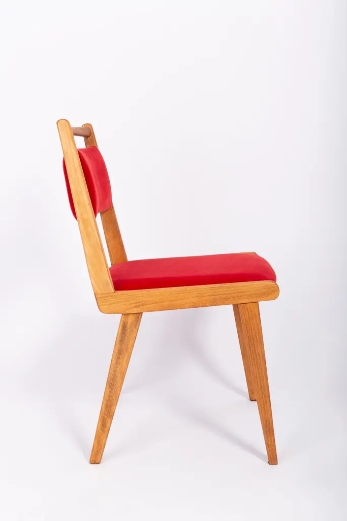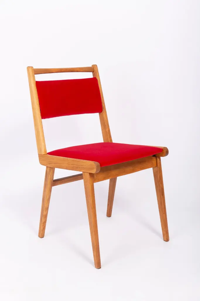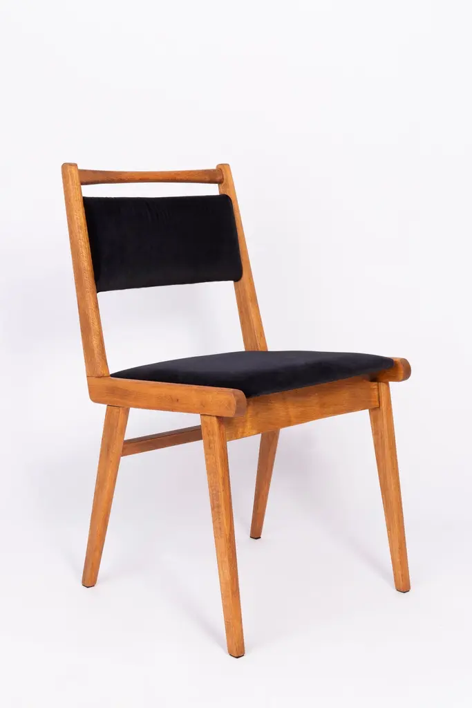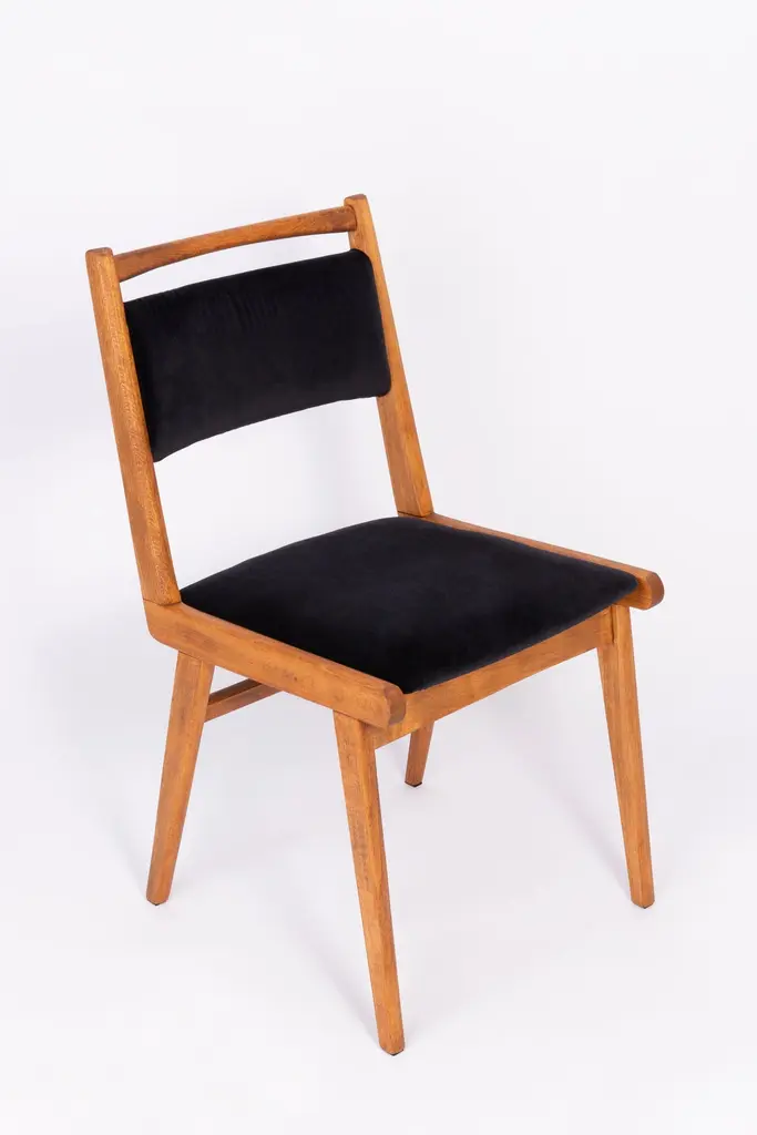 Chairs designed by Prof. Rajmund Halas. It is JAR type model. Made of beechwood. Chairs are after a complete upholstery renovation, the woodwork has been refreshed. Seat and back is dressed in a black and red, durable and pleasant to the touch velvet fabric. Chairs are stable and very shapely. Chairs were produced in former furniture factory in Goleniów in the 1960s. We can prepare this set in every color of wood and fabric.