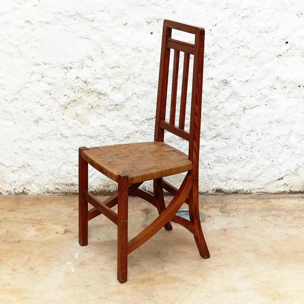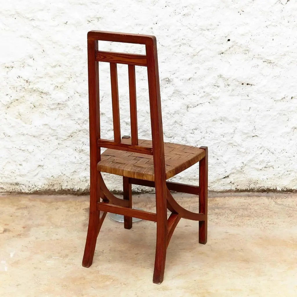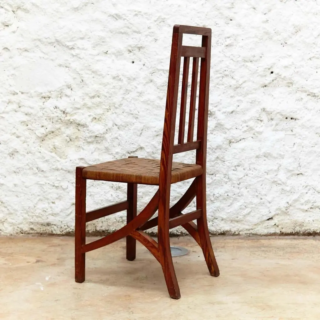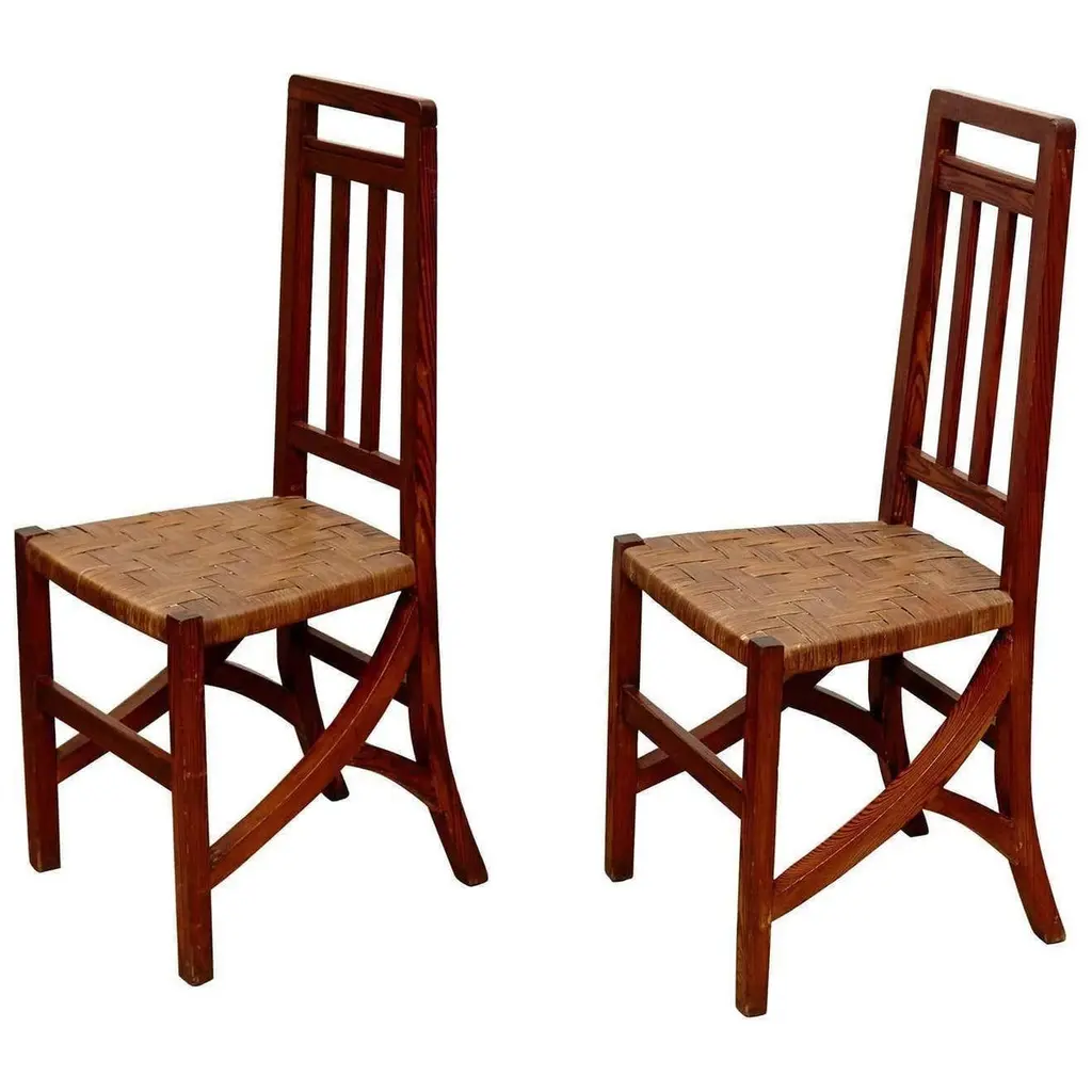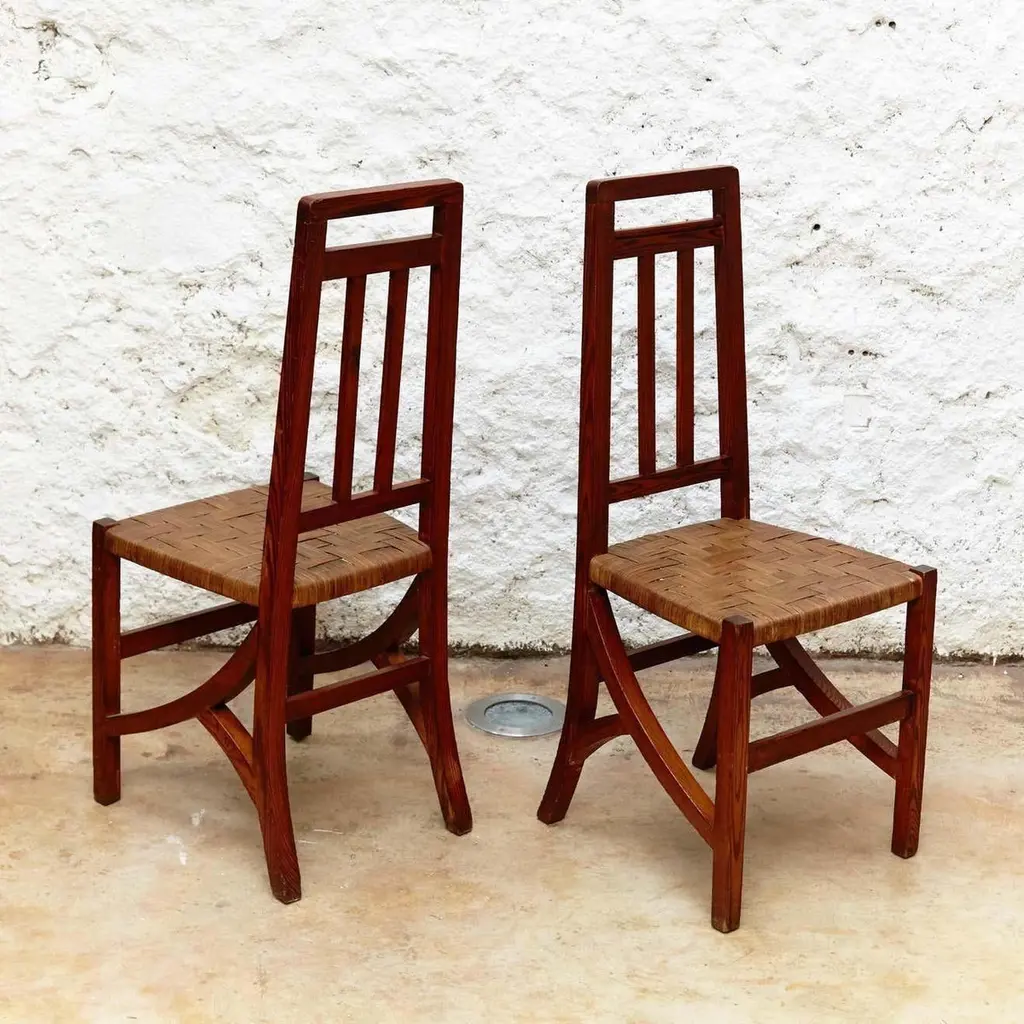 Set of two Arts & Crafts chairs in wood and rattan, circa 1910 By unknown designer and manufacturer. Manufactured in Spain, circa 1910. Wood and rattan. In original condition with minor wear consistent of age and use, preserving a beautiful patina.
