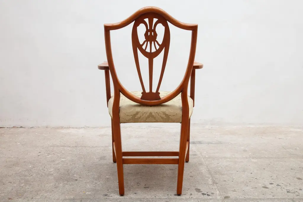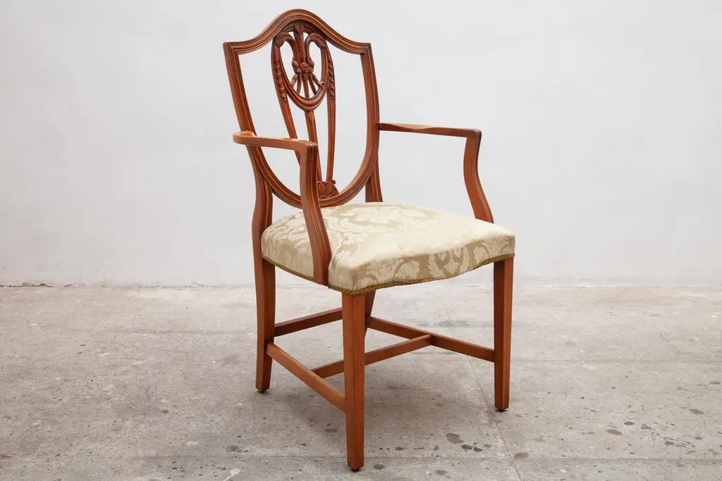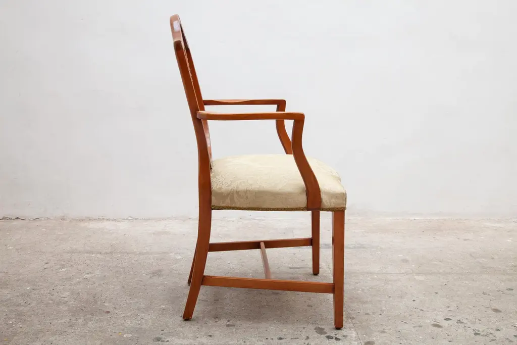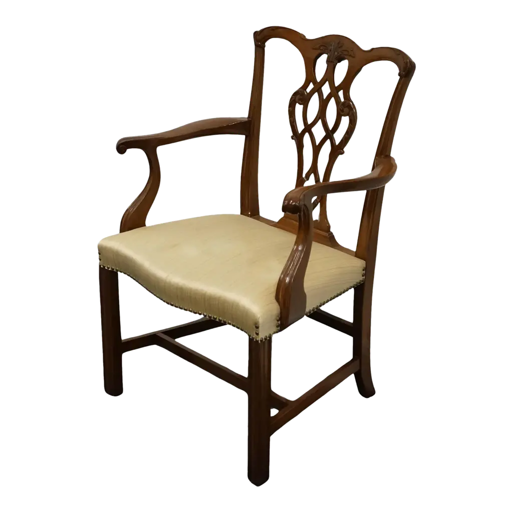 A set of two fine quality 20th century Georgian style chairs. Walnut frame with a carved bow and floral motif at the backrest the seats are upholstered in a neutral damask style material in excellent condition. Also six dining chairs available see other listing.