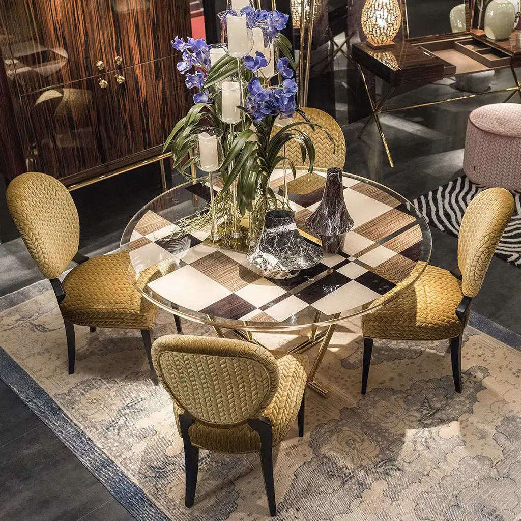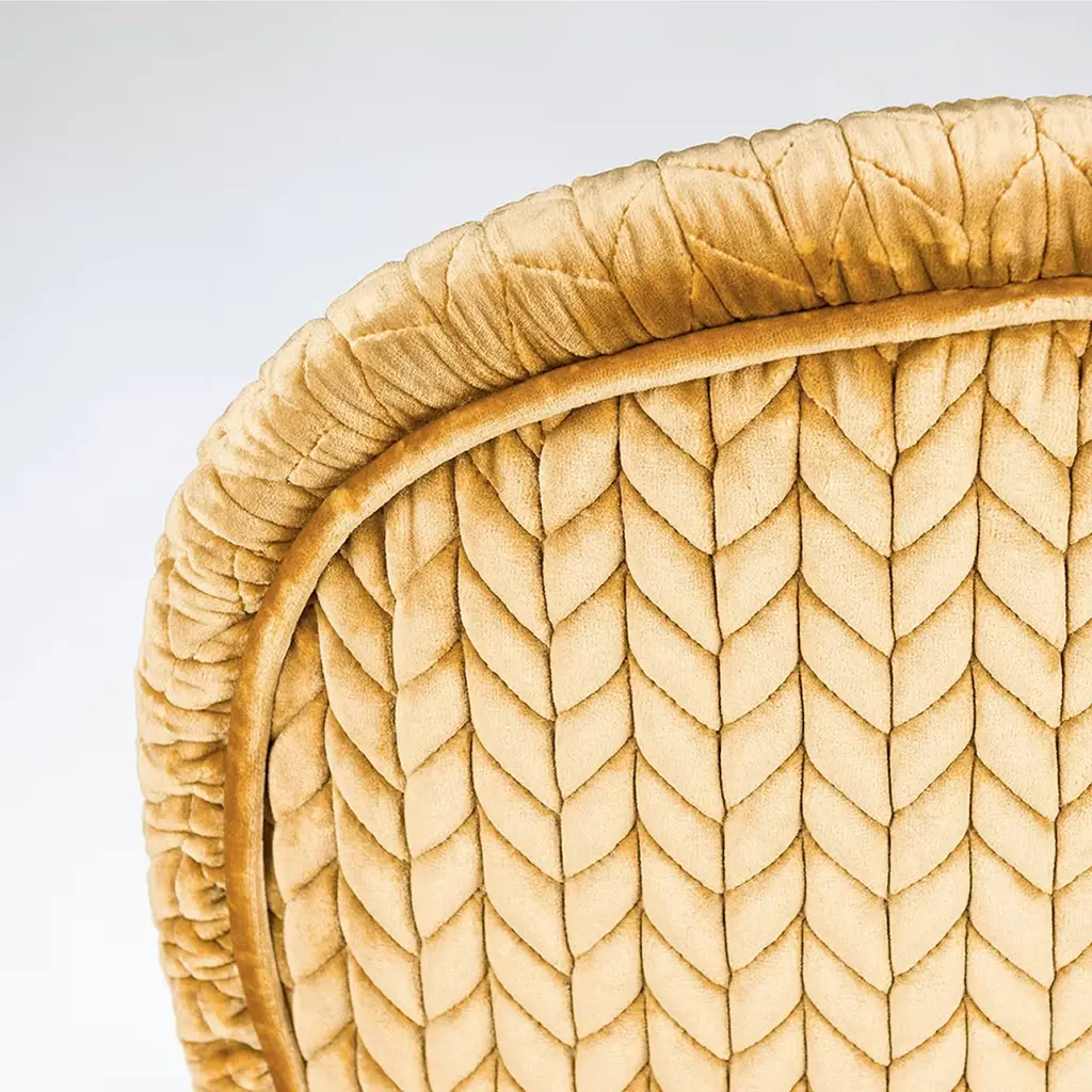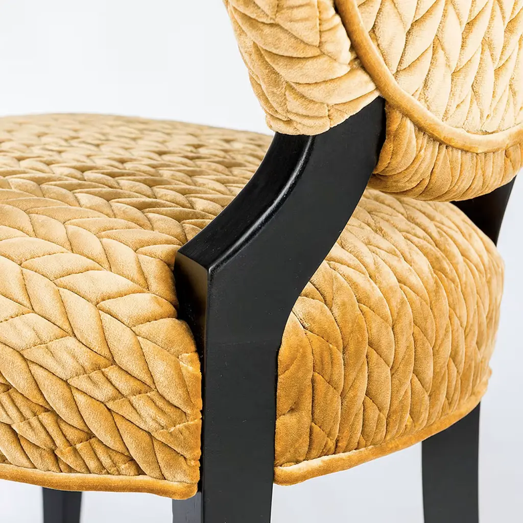 This elegant set of chairs is a re-intepretation of a classical design, with the oval backrest and the striking Antique Gold fabric that upholsters the back and seat cushions. The warm glow of the fabric and its luxurious texture complements the simple wooden structure and its matte black finish. The exquisite sophistication of these chairs makes them suitable for any decor, either used by a dining table or as accent pieces. Contract and commercial certifications available upon request.