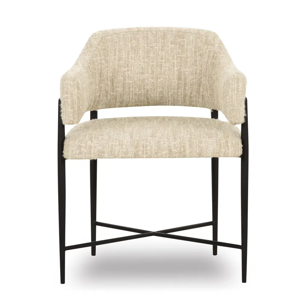 Transform your dining space with the stunning Sezanne Dining Chair, offered in Taupe Textured Boucle, and Cream or Tan Vegan Leather. Featuring a black iron finished metal frame, this art deco-inspired chair combines artsy flair with modern usability, offering excellent comfort and a polished look that complements any trendy dining room. The highly textured, liquid-repellent fabric and easy-to-clean vegan leather make it as practical as it is stylish.