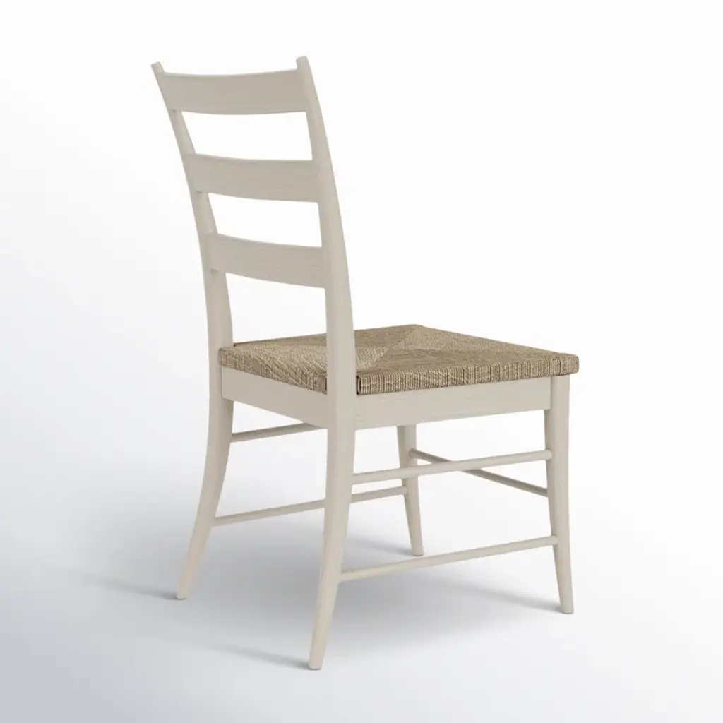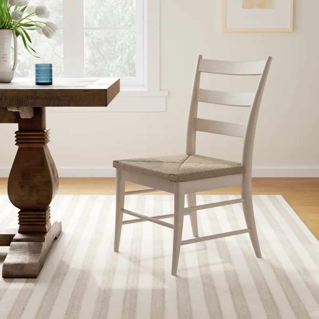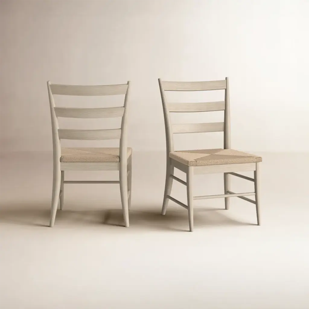 Our 2-piece set of ladder back side chairs completes your table for two. Crafted from kiln-dried solid wood with a white-sand finish, each features a woven seagrass seat that adds texture to the overall design. A classic ladder back rounds out the look for understated style. Consider multiple sets for a larger dining table.