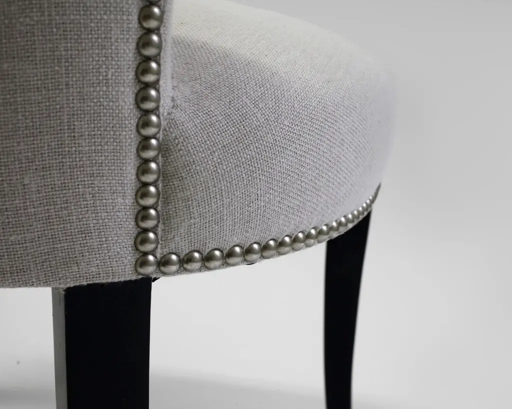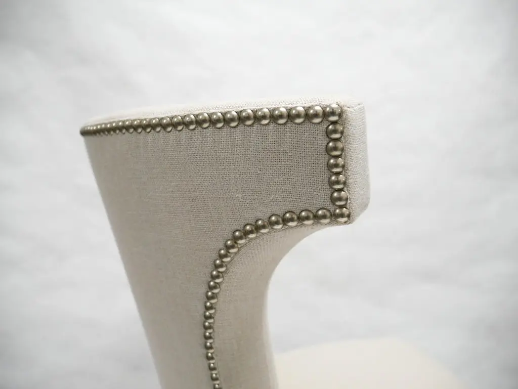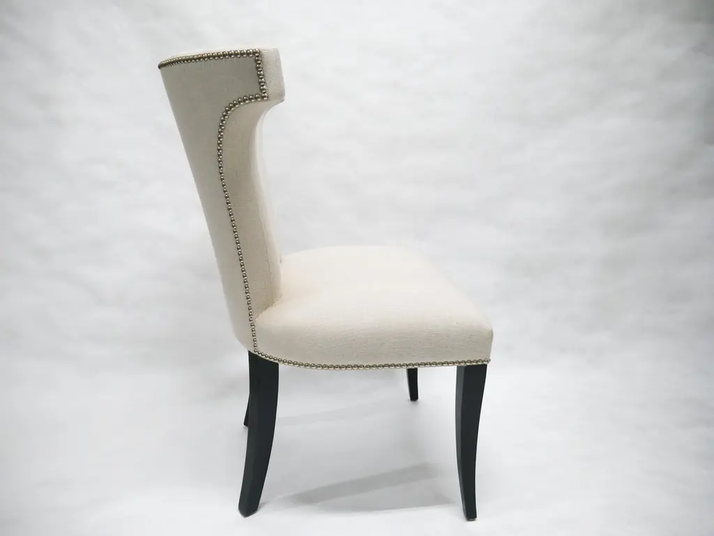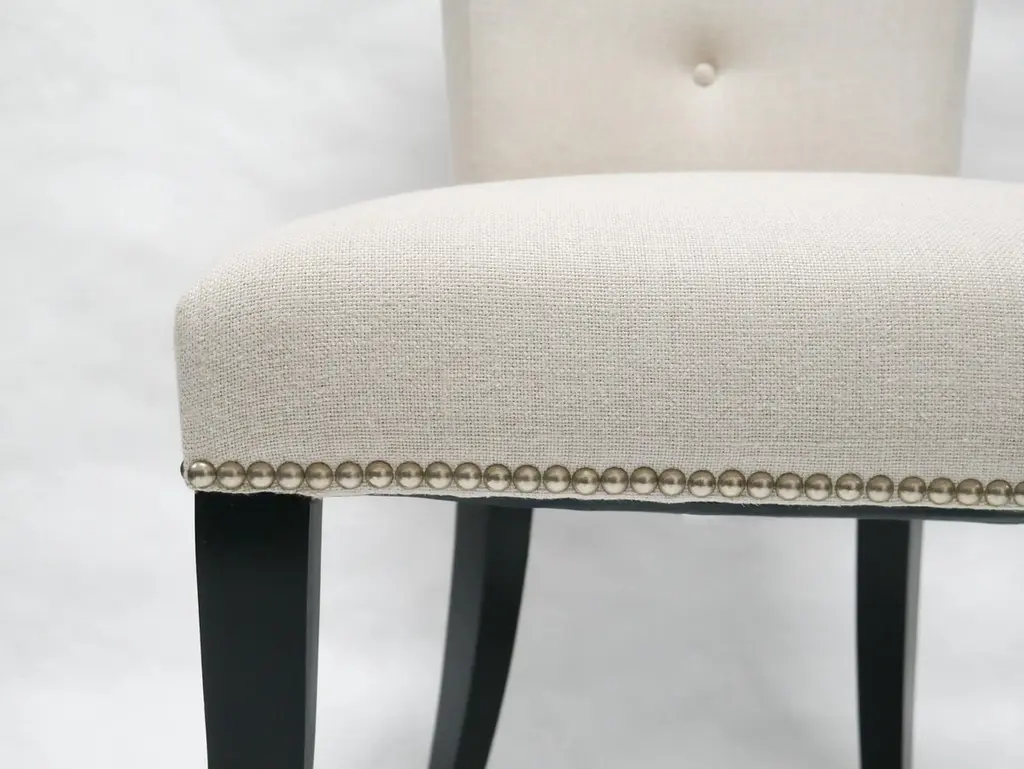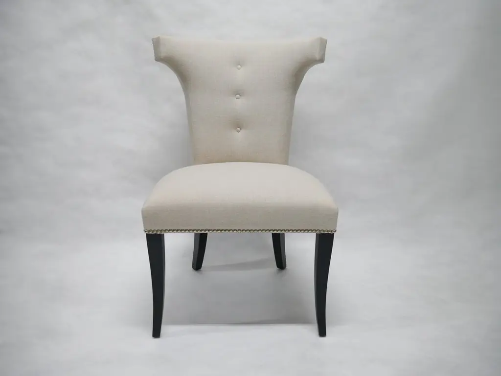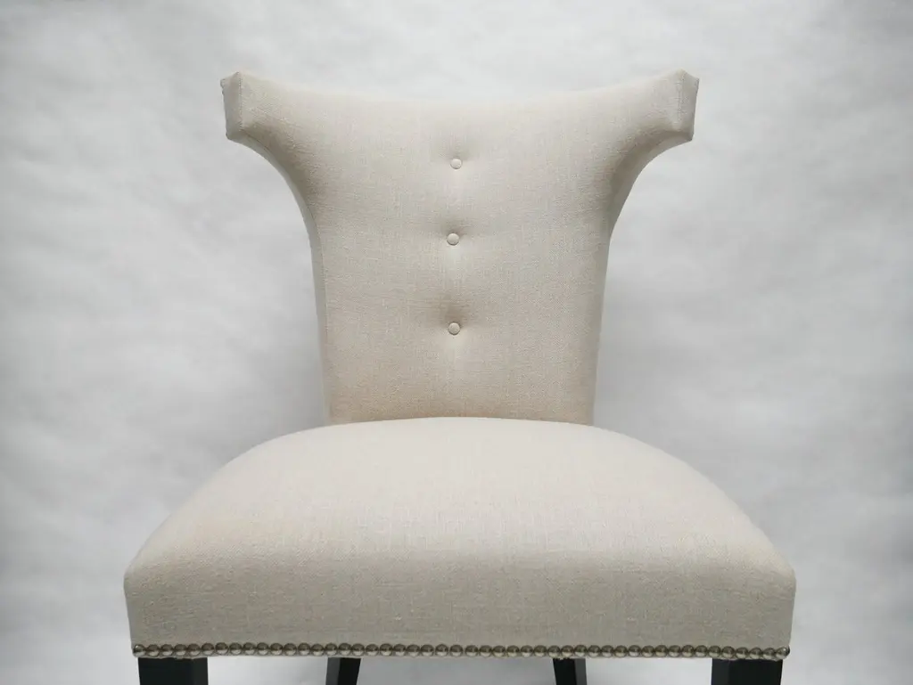 The Menton chair is a beautifully styled side chair shown in off white fabric with and self covered buttons on the inside back - nailhead trim outlining the grace and lines of this chair - on wood legs finished in medium mahogany - versatile and stylish this item can be used as a dining chair or game chair.ITEM IS AVAILABLE IMMEDIATELY FOR PRICE AS SHOWN "AS IS" - CONTACT US FOR CUSTOM PRICING.PRICE IS SUBJECT INCREASE BASED ON WOOD, FINISH AND SIZE.