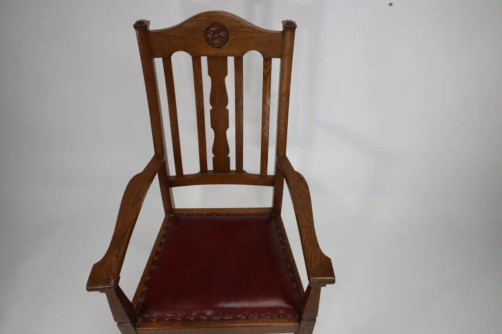 Three Arts and Crafts oak dining armchairs by Shapland and Petter, with stylized floral carved details to the back boards and stylized floral cut-outs to the head rests, now professionally recovered in a quality green leather. Price per chair.