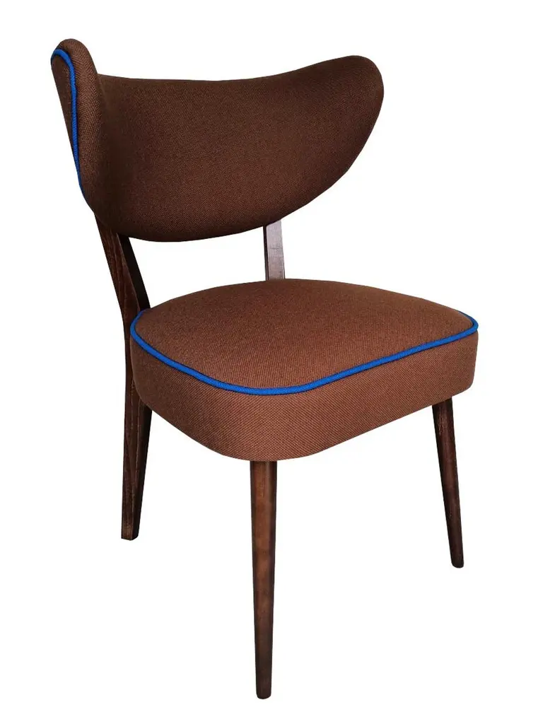 Springy, very comfortable and stabile club seats.They are contemporary chairs inspired of 1960s style. They can be used as armchairs and dining chairs. Chair was designed by Vintola Studio, a Polish brand created by Ola Szewczul, designer of vintage interior architecture and photographer.Produced in 2025 at the Vintola Studio Factory in Poland. The whole armchair is covered with high-quality flame retardant fabric. Very beautiful and comfortable item! About the fabric:Three dimenions, flower place, recommended by its directively, to be used in public interiors such as hotels, restaurant, clubs etc. Its advantages also include it's durability allowing for intensive use - it is an effect of high grammage. This fabric is OEKO-TEX certified. Trenza collection is offered in 15 colors. In this range you will find intense, strong and homogeneous colors: red, navy blue, petrol, anthracite black, lime green, but also elegant shades of cream, ivory, coffee with milk, beige and grey. This color set is very versatile and fits many interior design styles.150 000 martindale cycles100% Trevira All options of fabrics and wood colors are possible to prepare. Change of dimensions are also possible.Please ask for more informations.