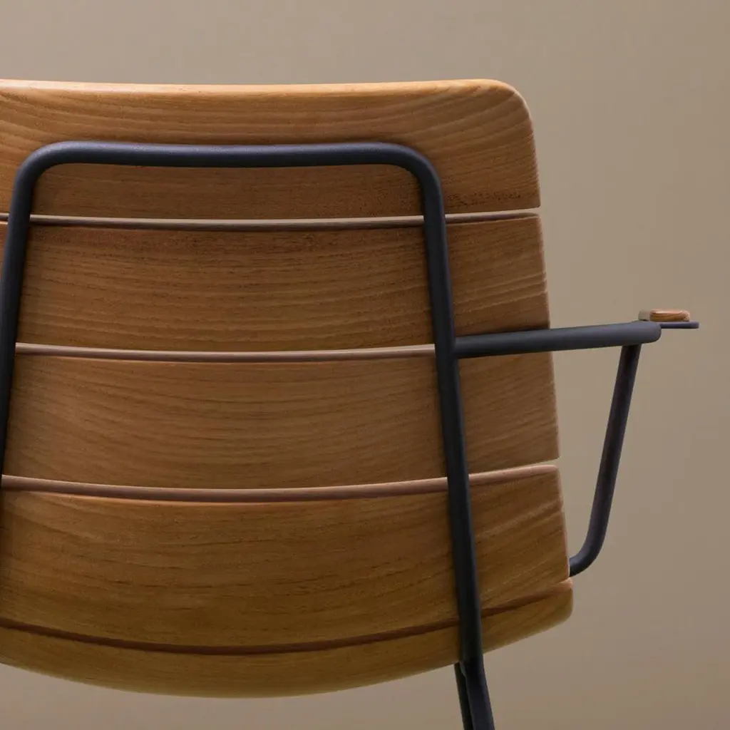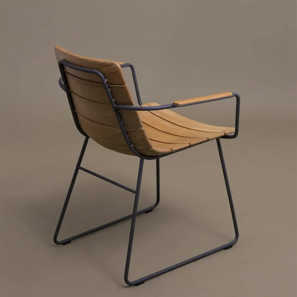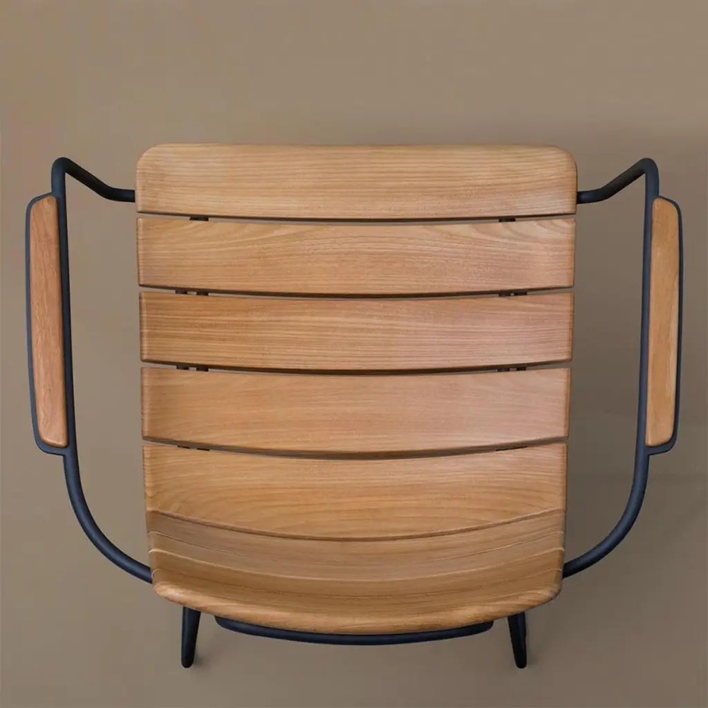 Dining chair shelton outdoor teak with stainless steel powder coated structure in black finish. With solid natural teak seat, backrest and armrests.